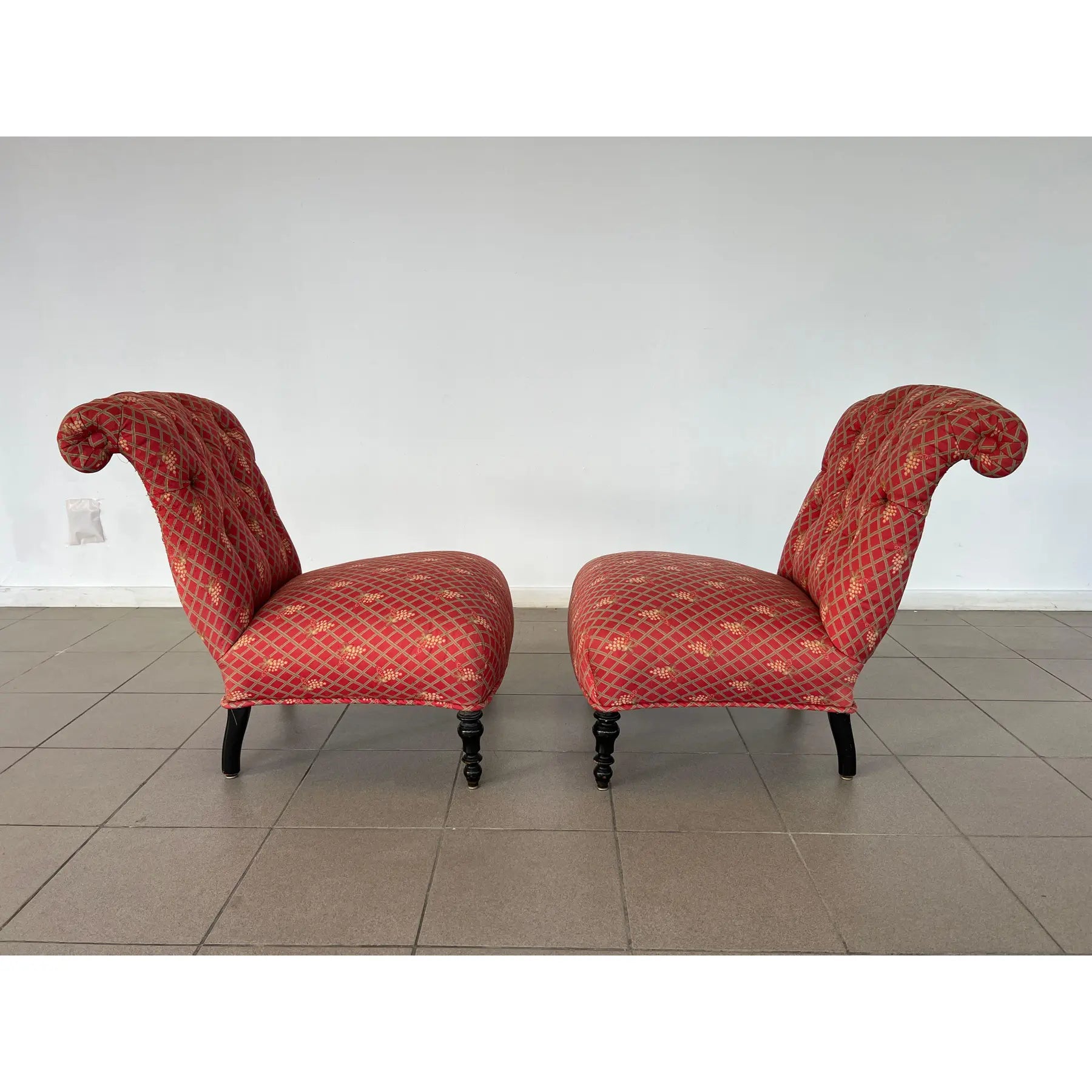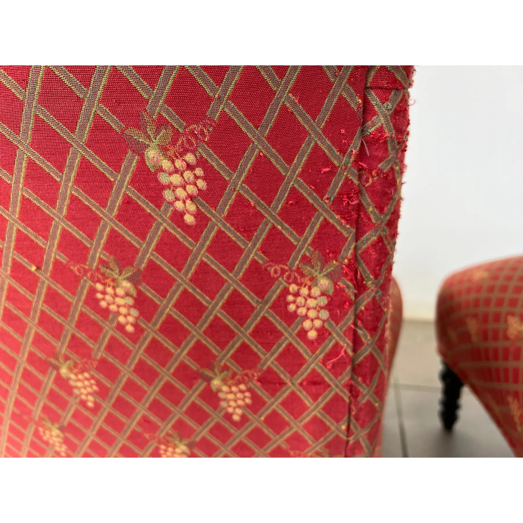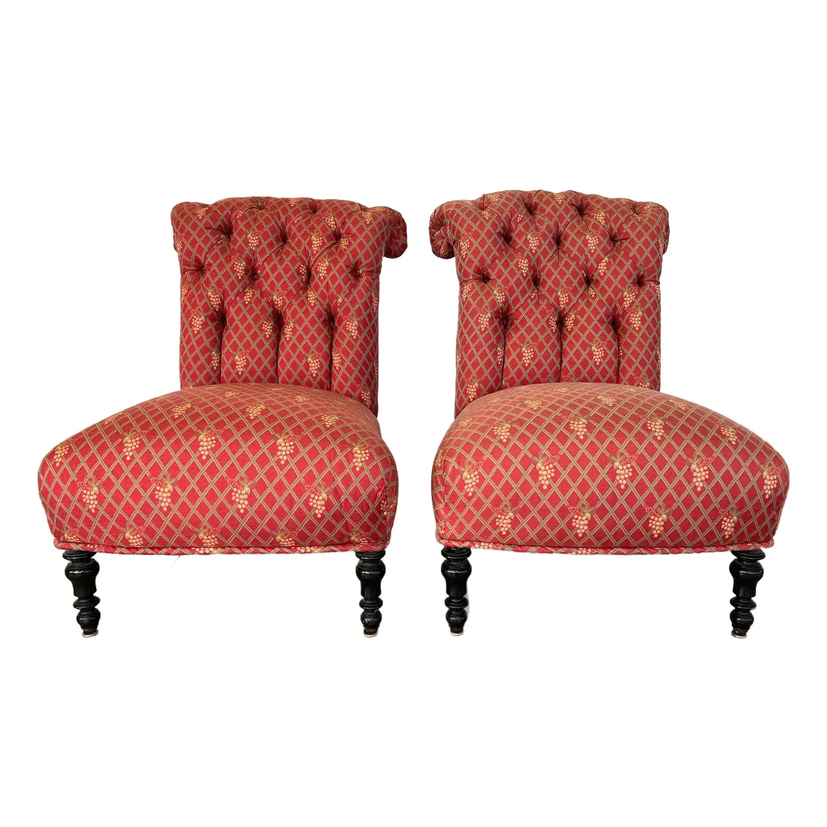 Antique pair of French Scroll top Napoleon III style Slipper chairs. Upholstered in original red fabric with grape vine decoration.