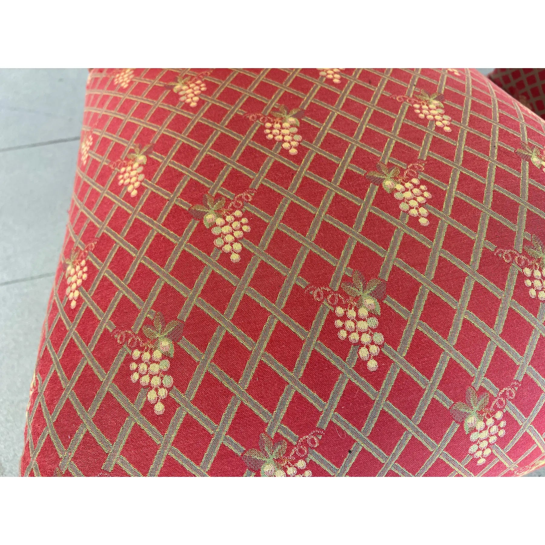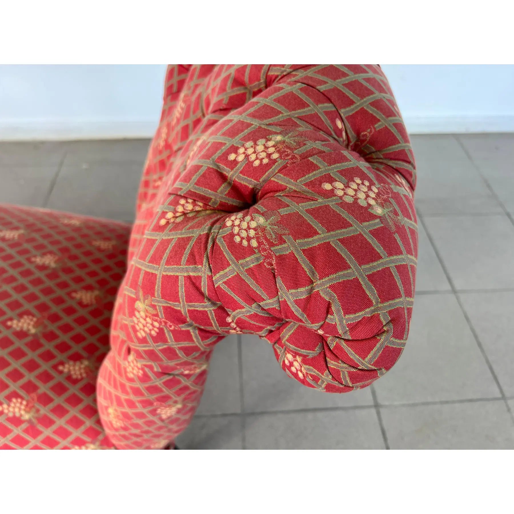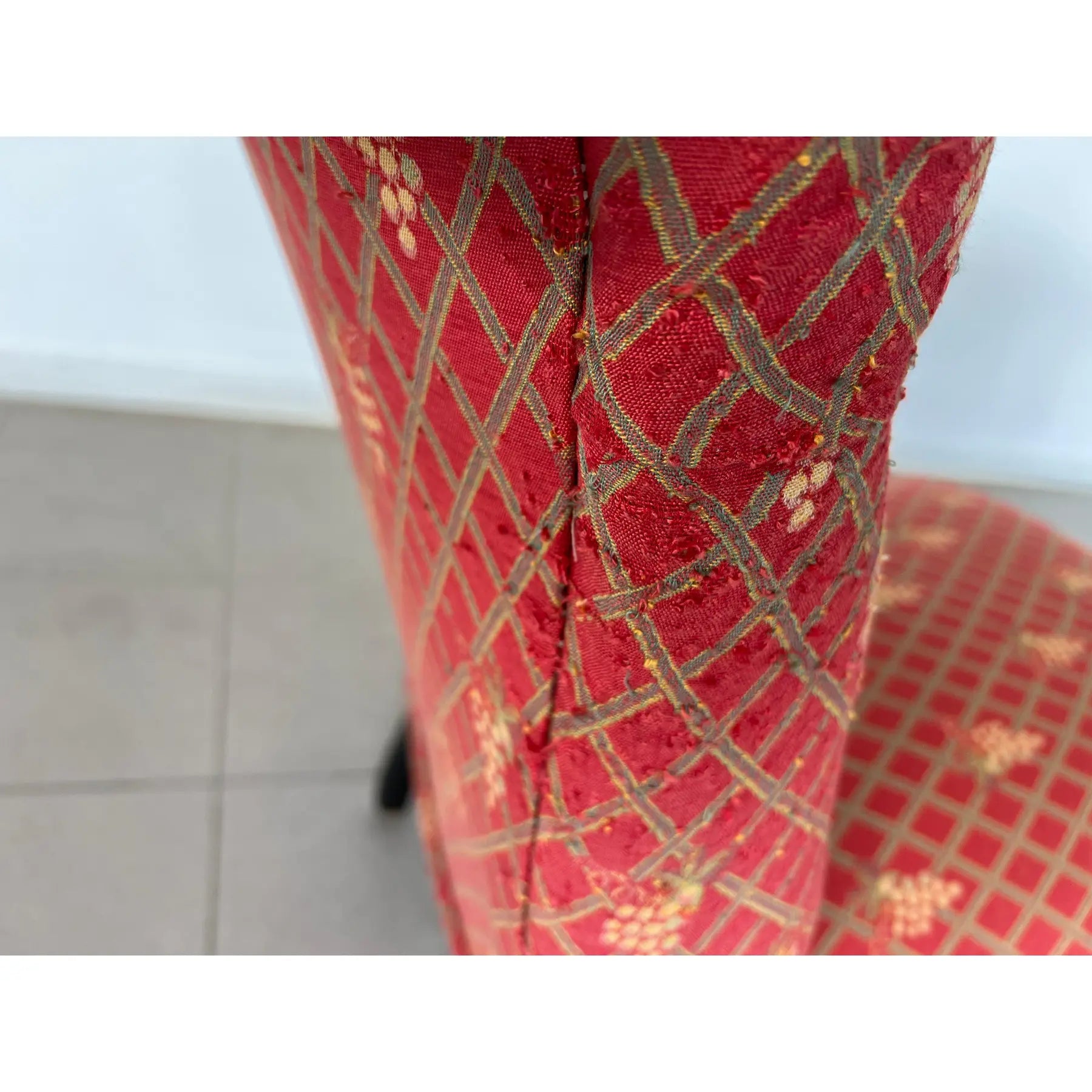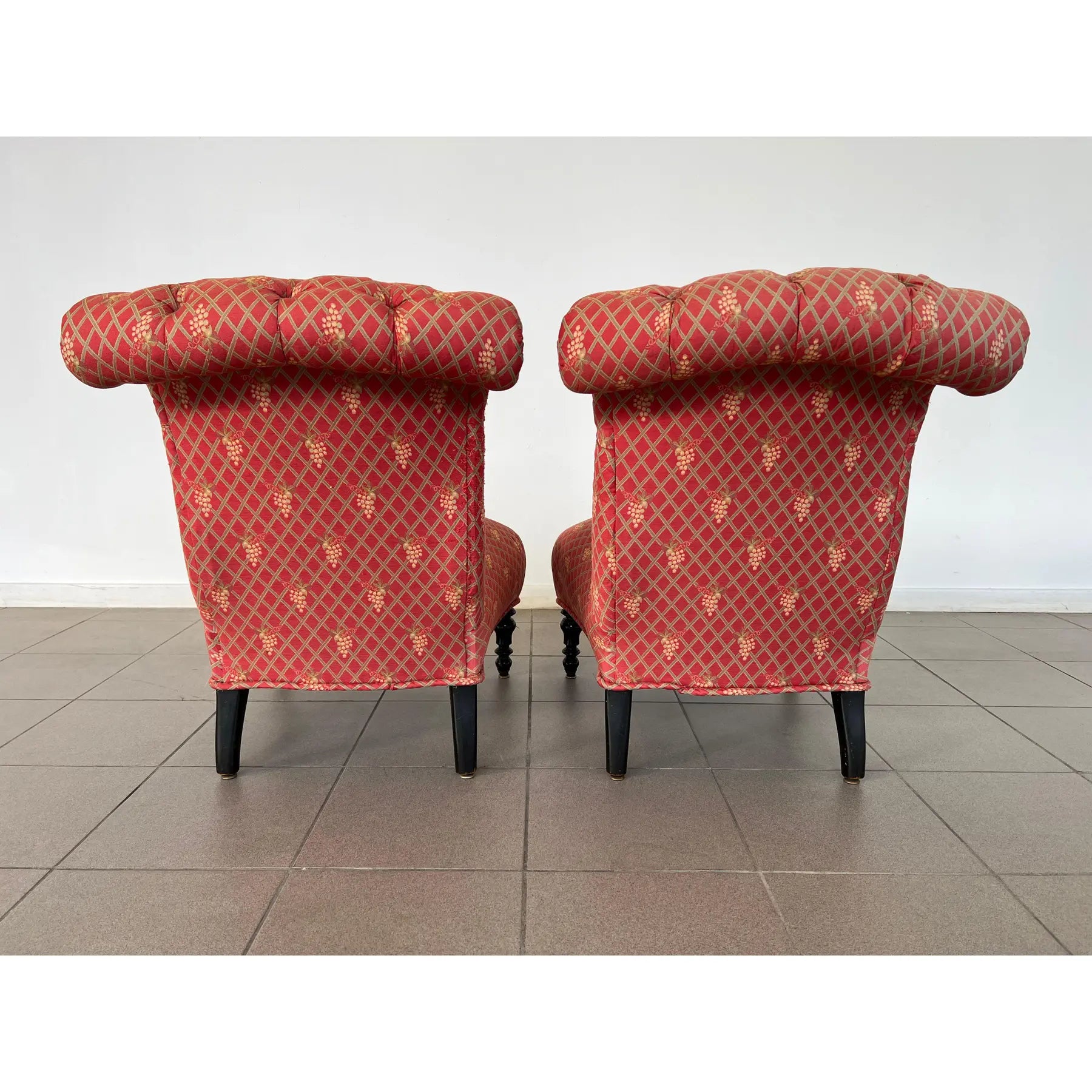 Antique pair of French Scroll top Napoleon III style Slipper chairs. Upholstered in original red fabric with grape vine decoration.