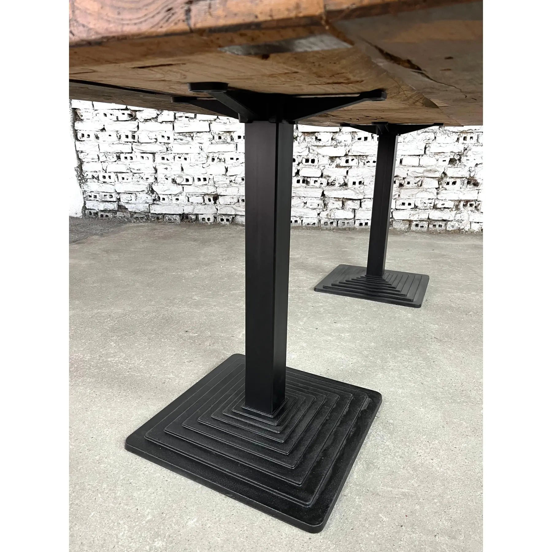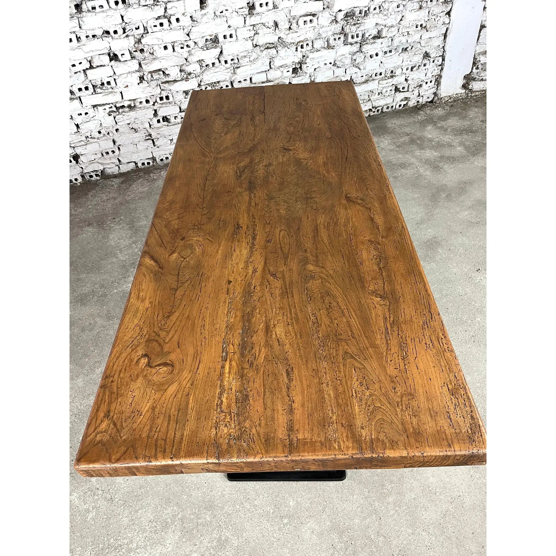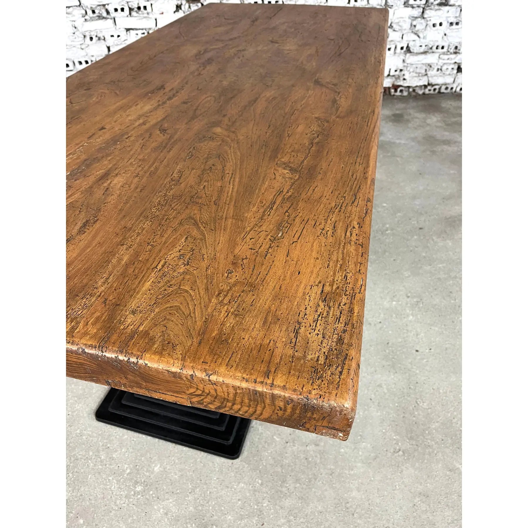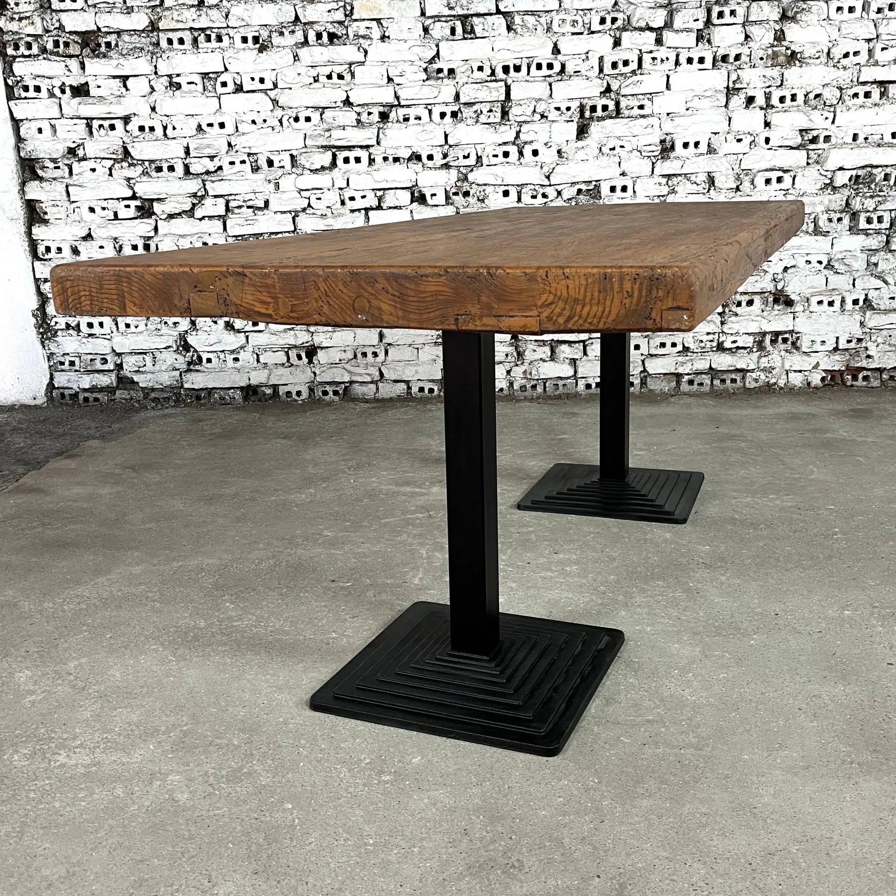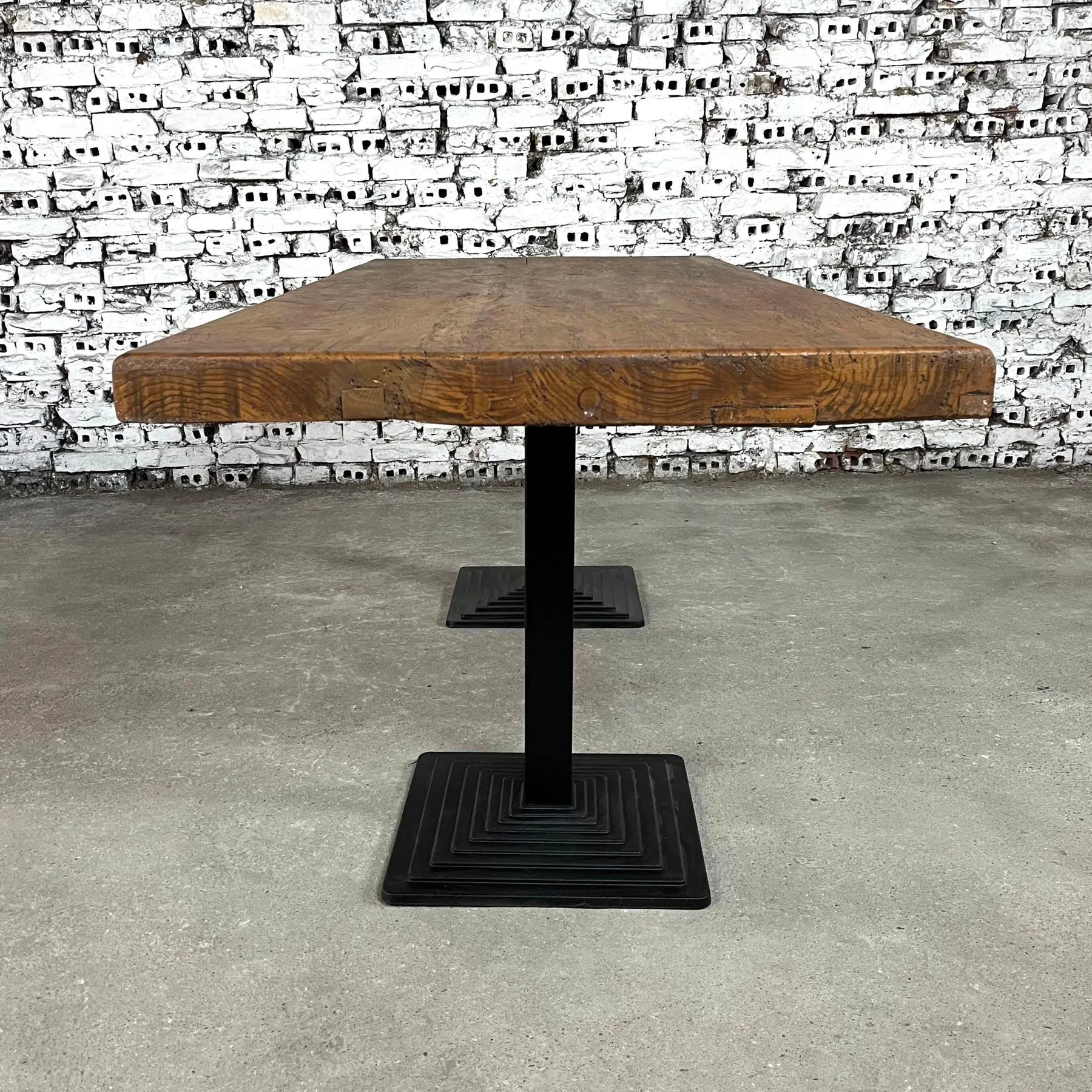 Dutch Industrial Dining table, consisting of 2 solid pedestal cast iron legs supporting a large patinated oak slab plank top. Seats up to 12.