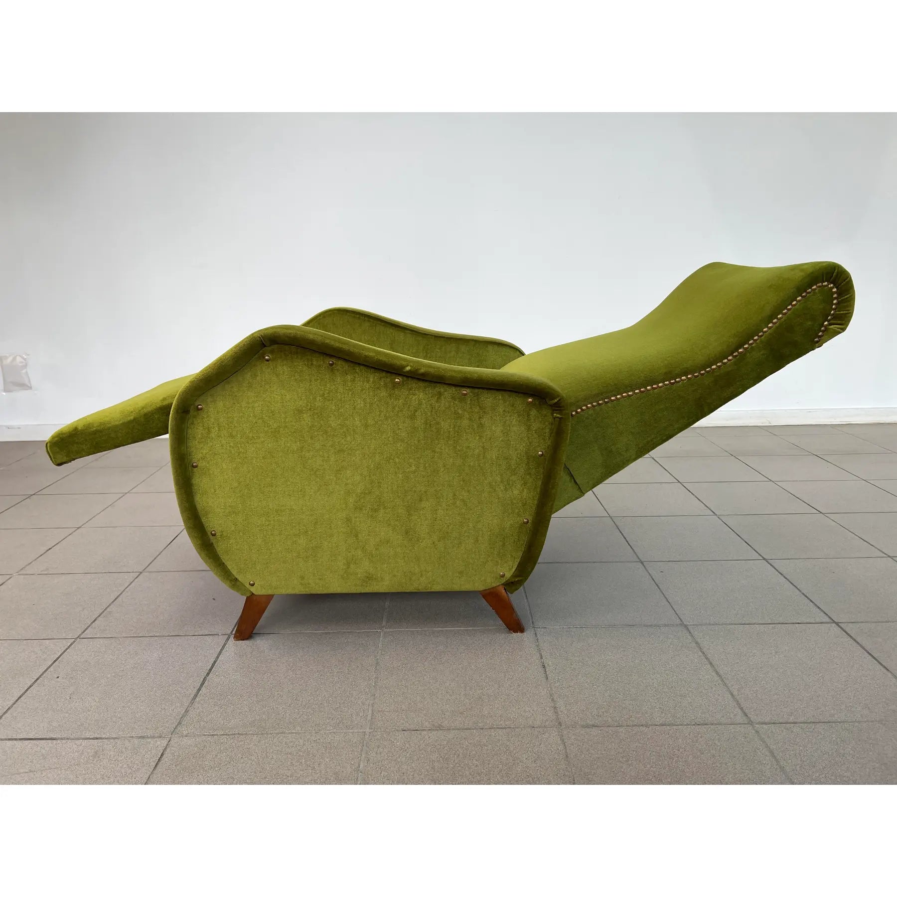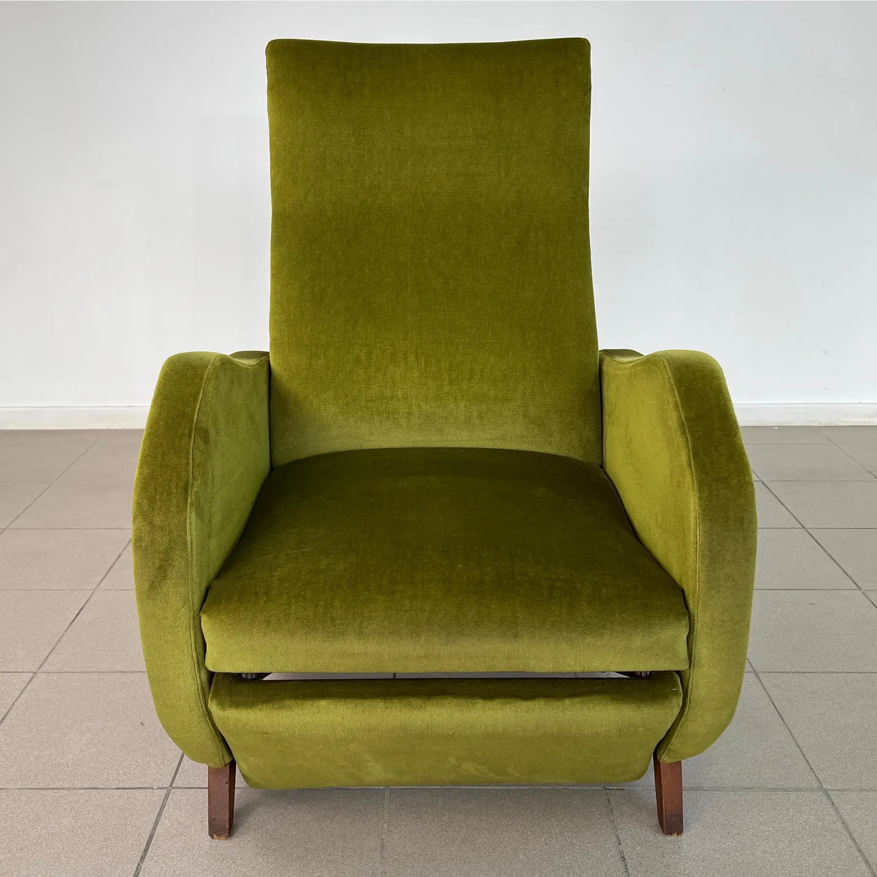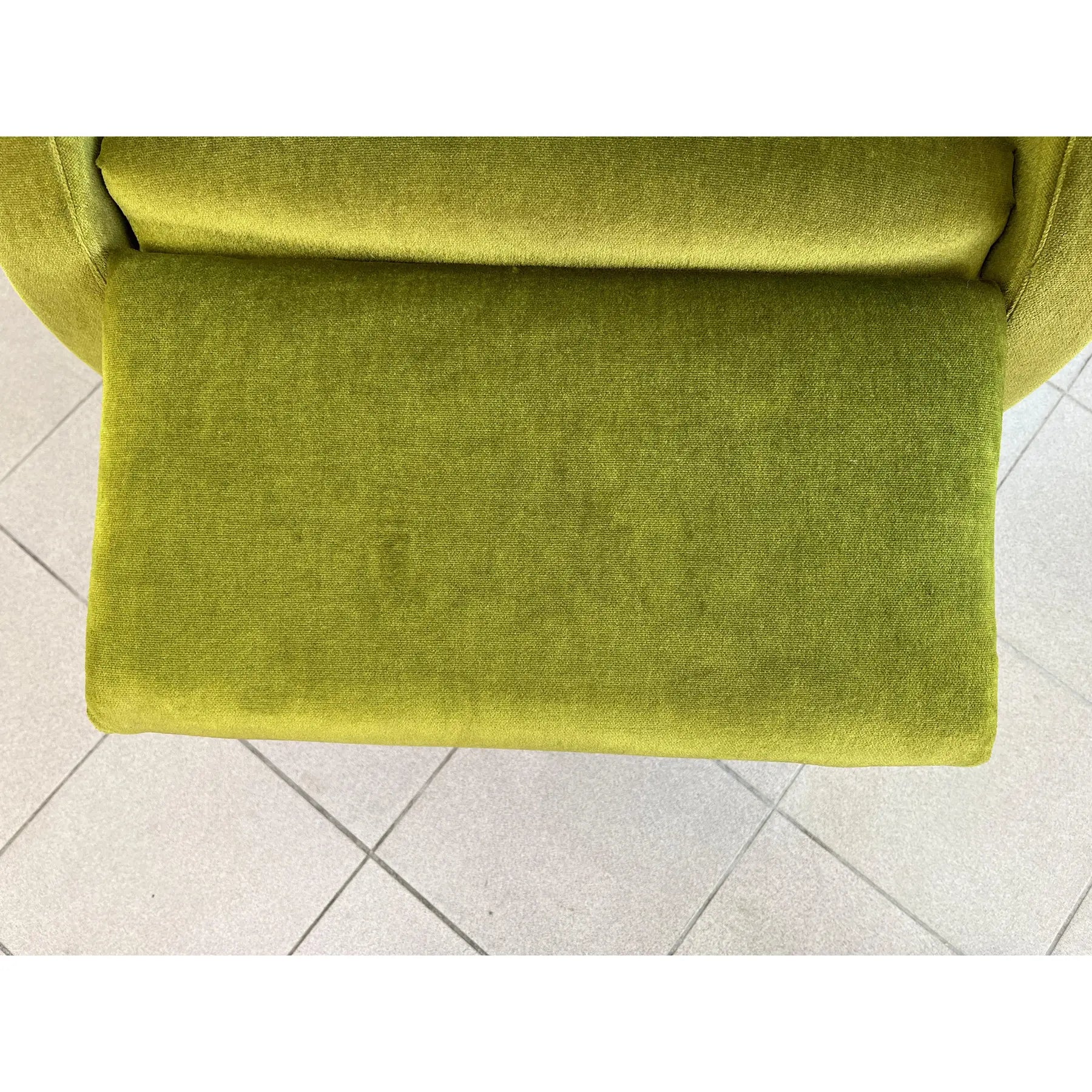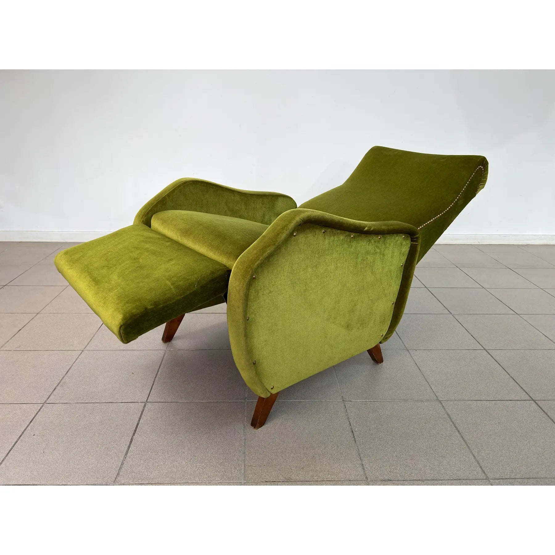 Vintage Dutch reclining armchair with retractable footrest from 1960s. Upholstered in original green velvet fabric. Comfortable and stylish.