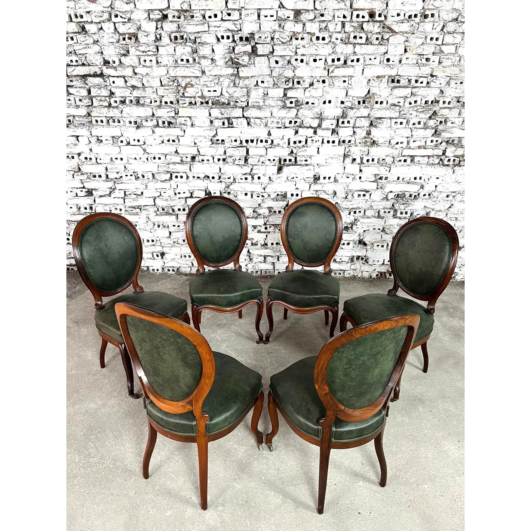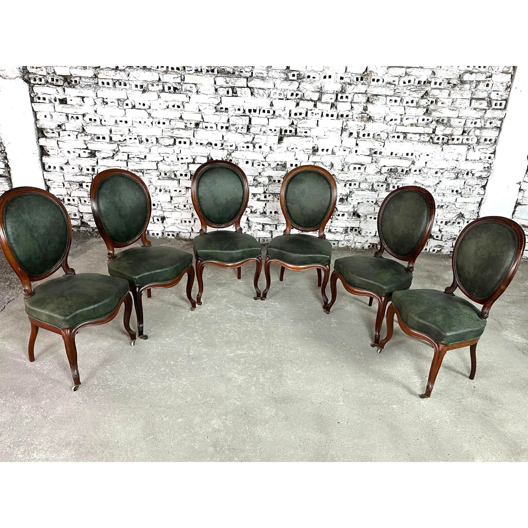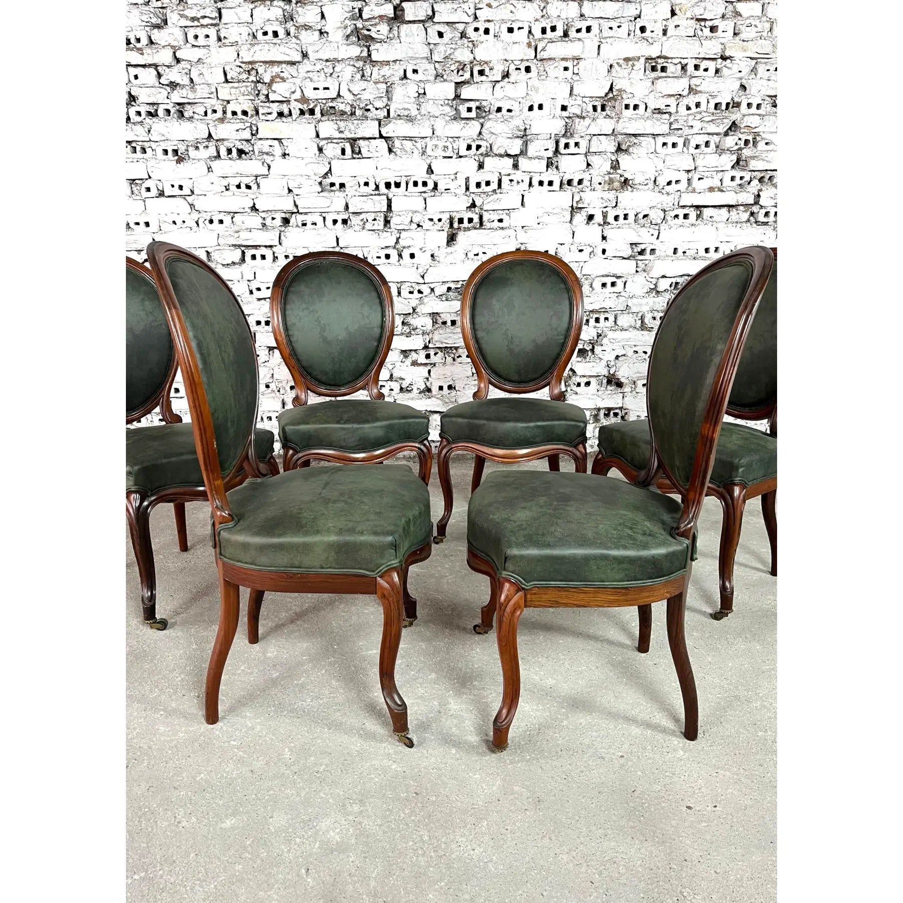 Vintage set of 6 Louis Philippe style dining chairs. Newly upholstered in dark green soft faux leather fabric. Mahogany wood and cabriole front legs on casters. The backrests are in a medallion shape. Amazing design and quality craftsmanship. A wonderful addition to your interior.
