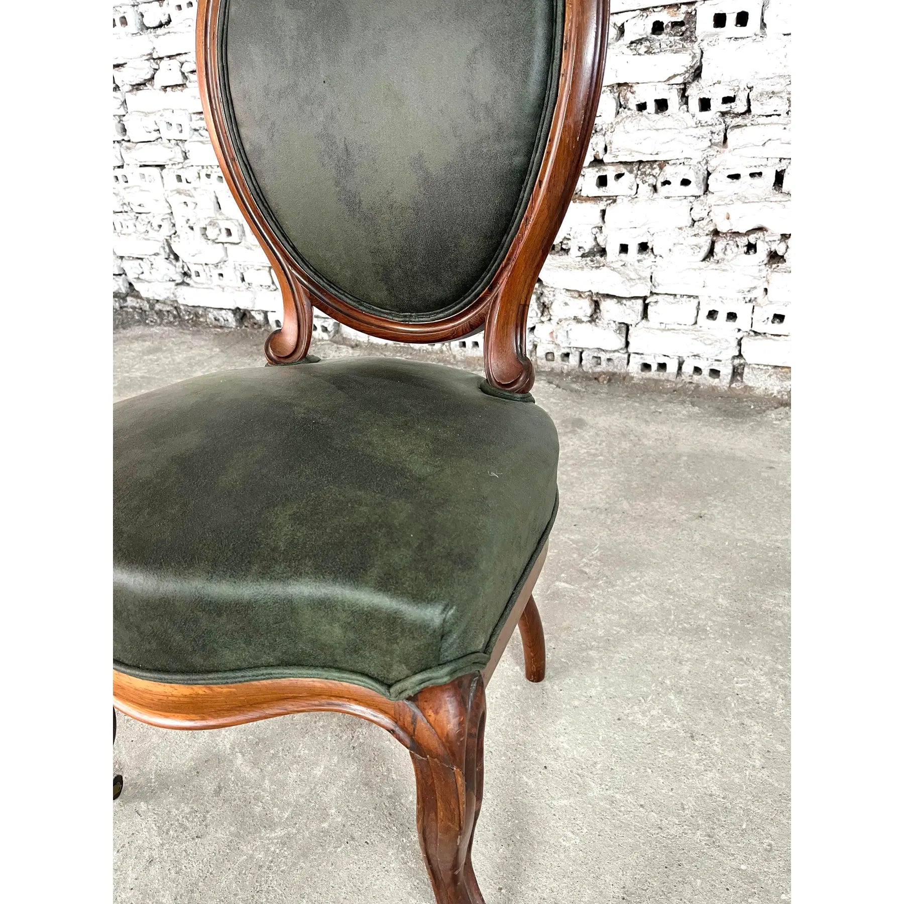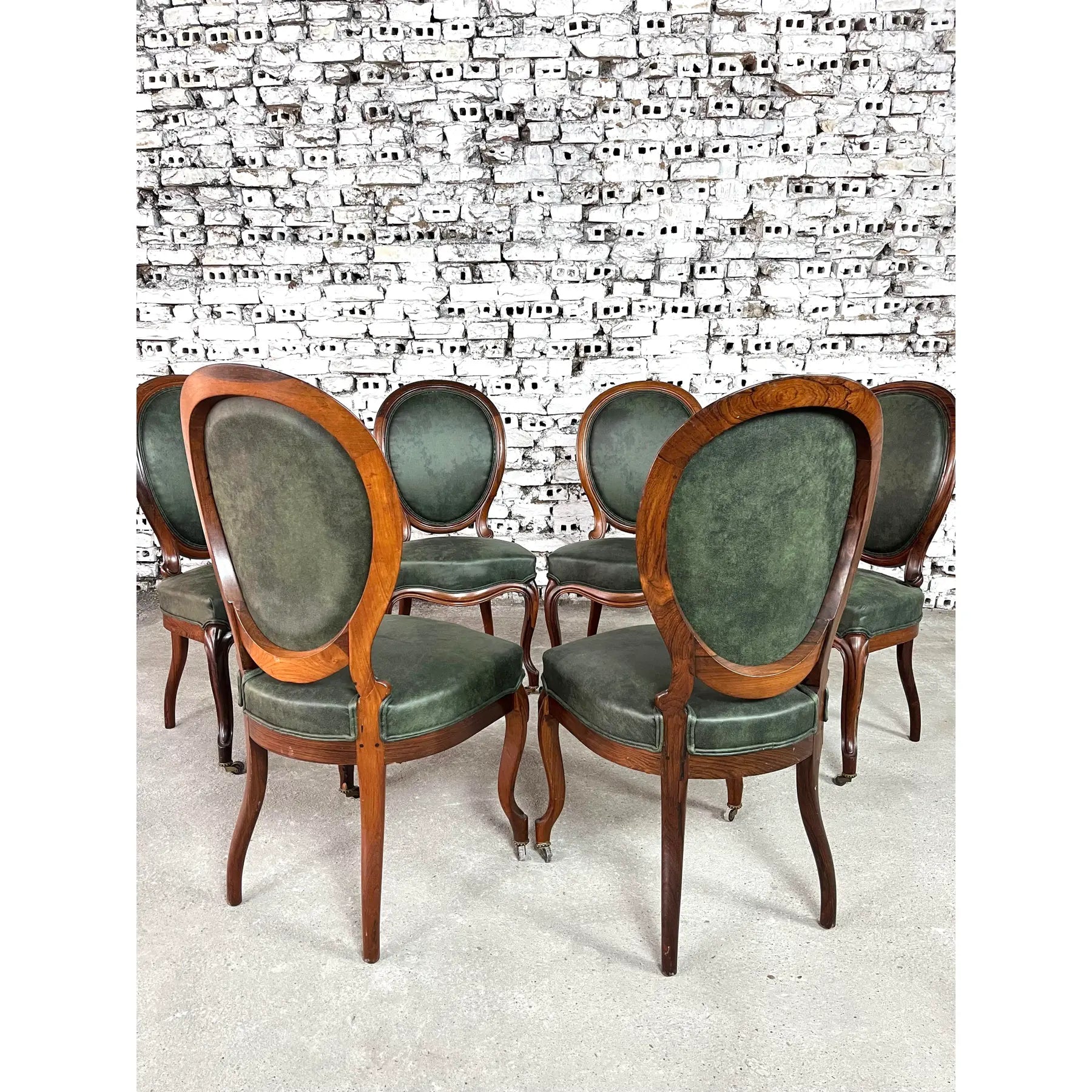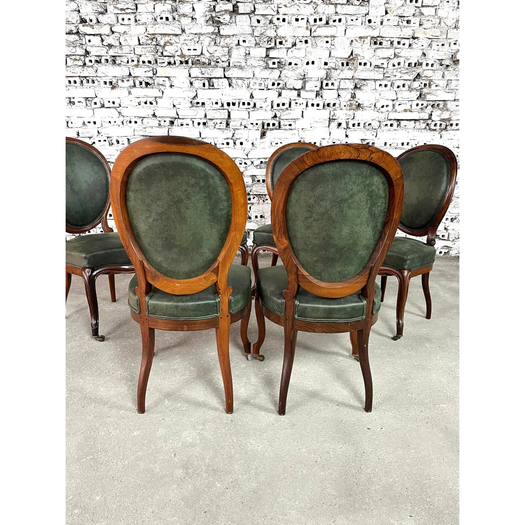Vintage set of 6 Louis Philippe style dining chairs. Newly upholstered in dark green soft faux leather fabric. Mahogany wood and cabriole front legs on casters. The backrests are in a medallion shape. Amazing design and quality craftsmanship. A wonderful addition to your interior.