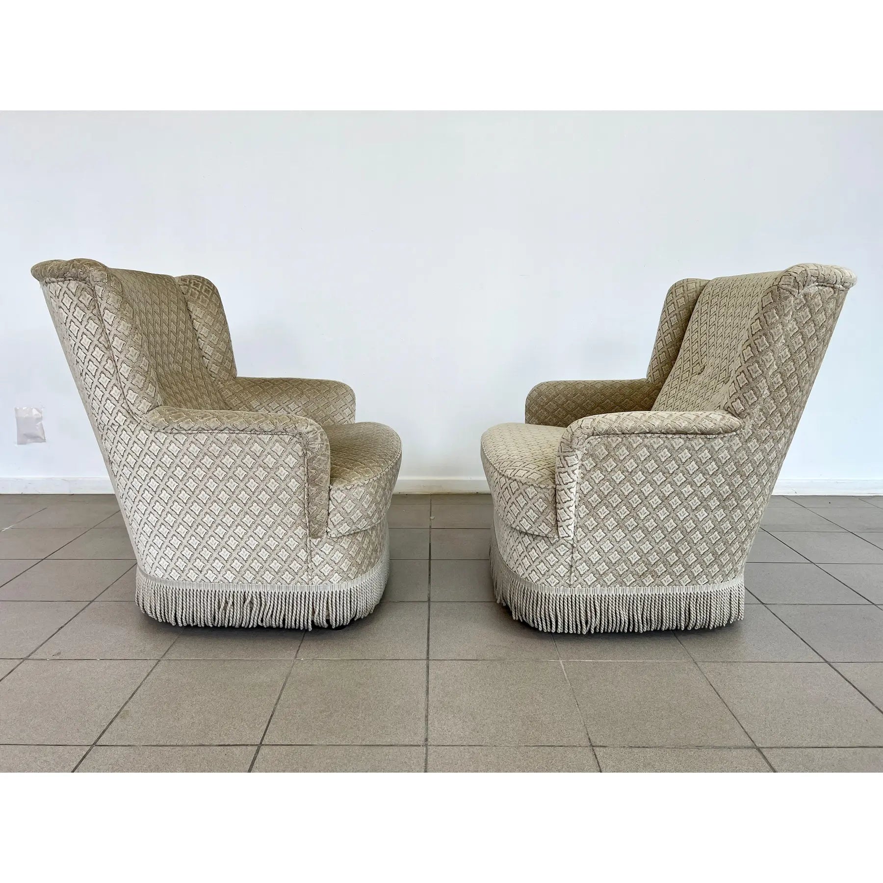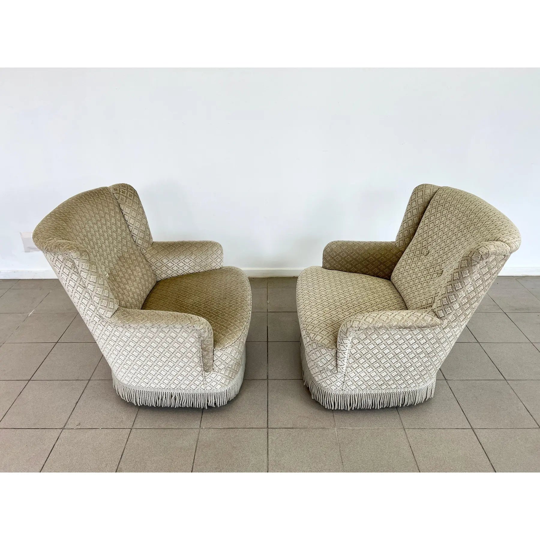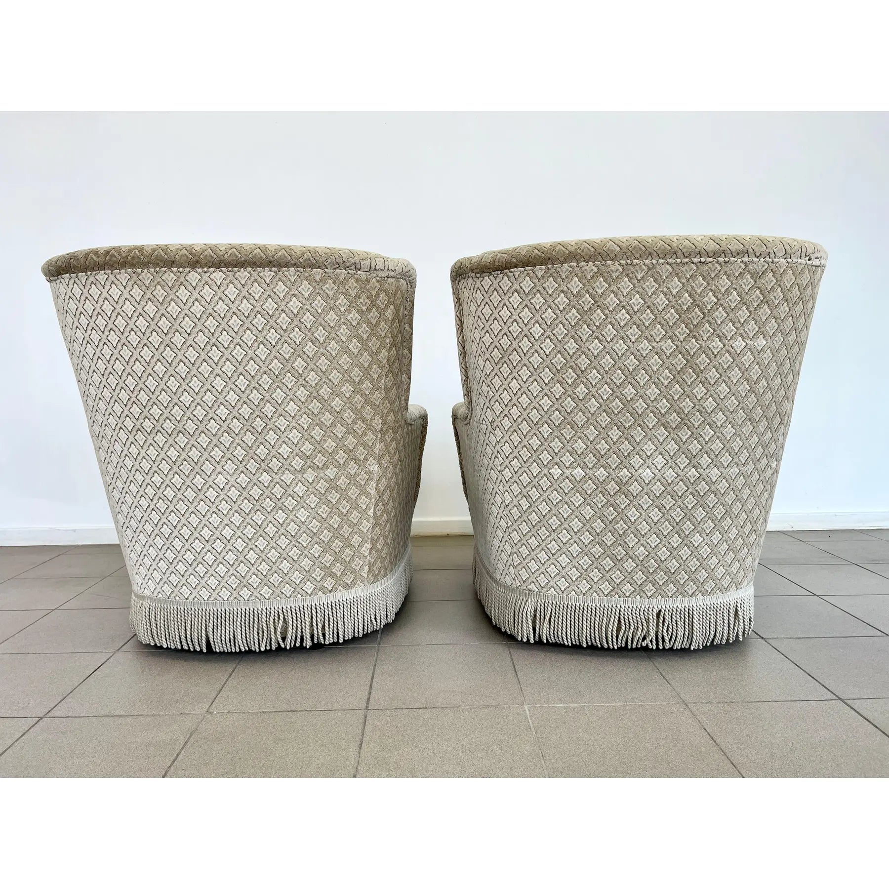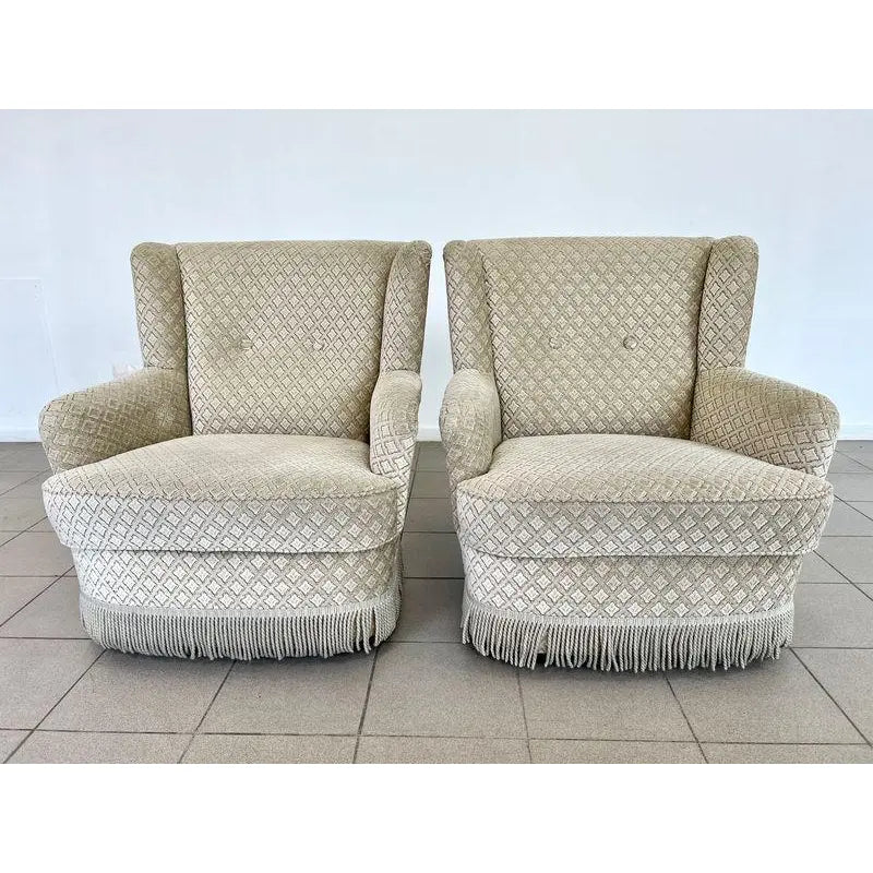 Pair of French Art Deco styled mohair lounge armchairs with braided fringes. Original fabric with buttoned back. A wonderful addition to your interior.