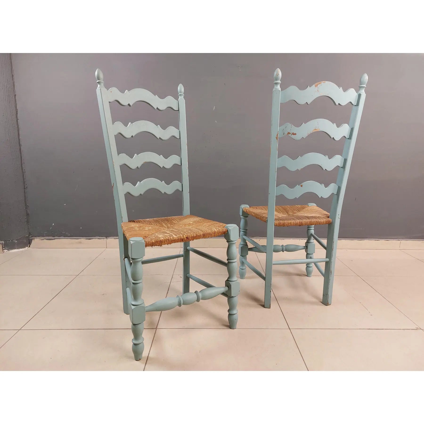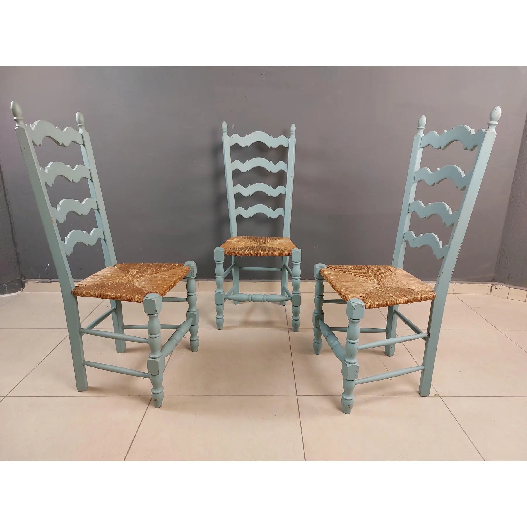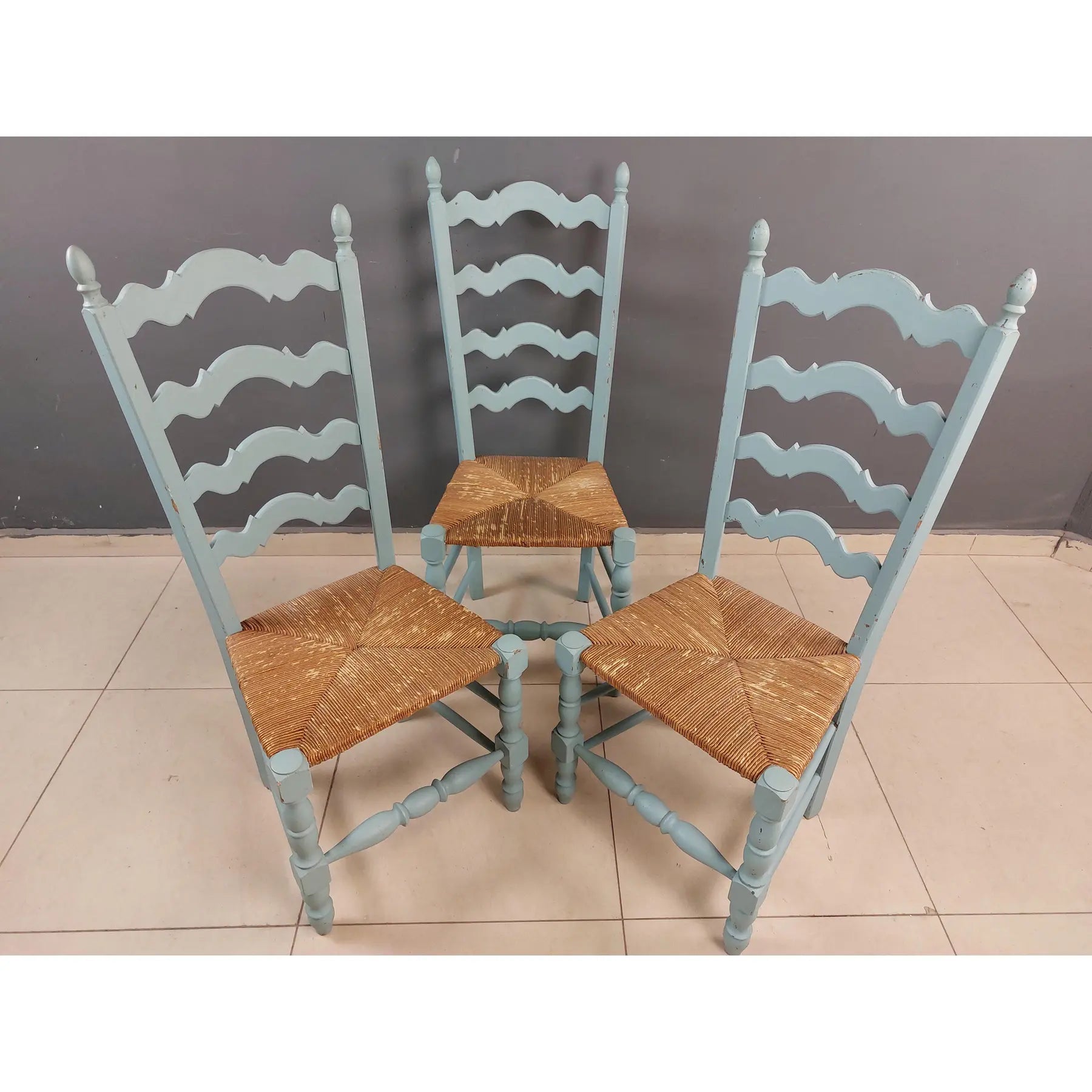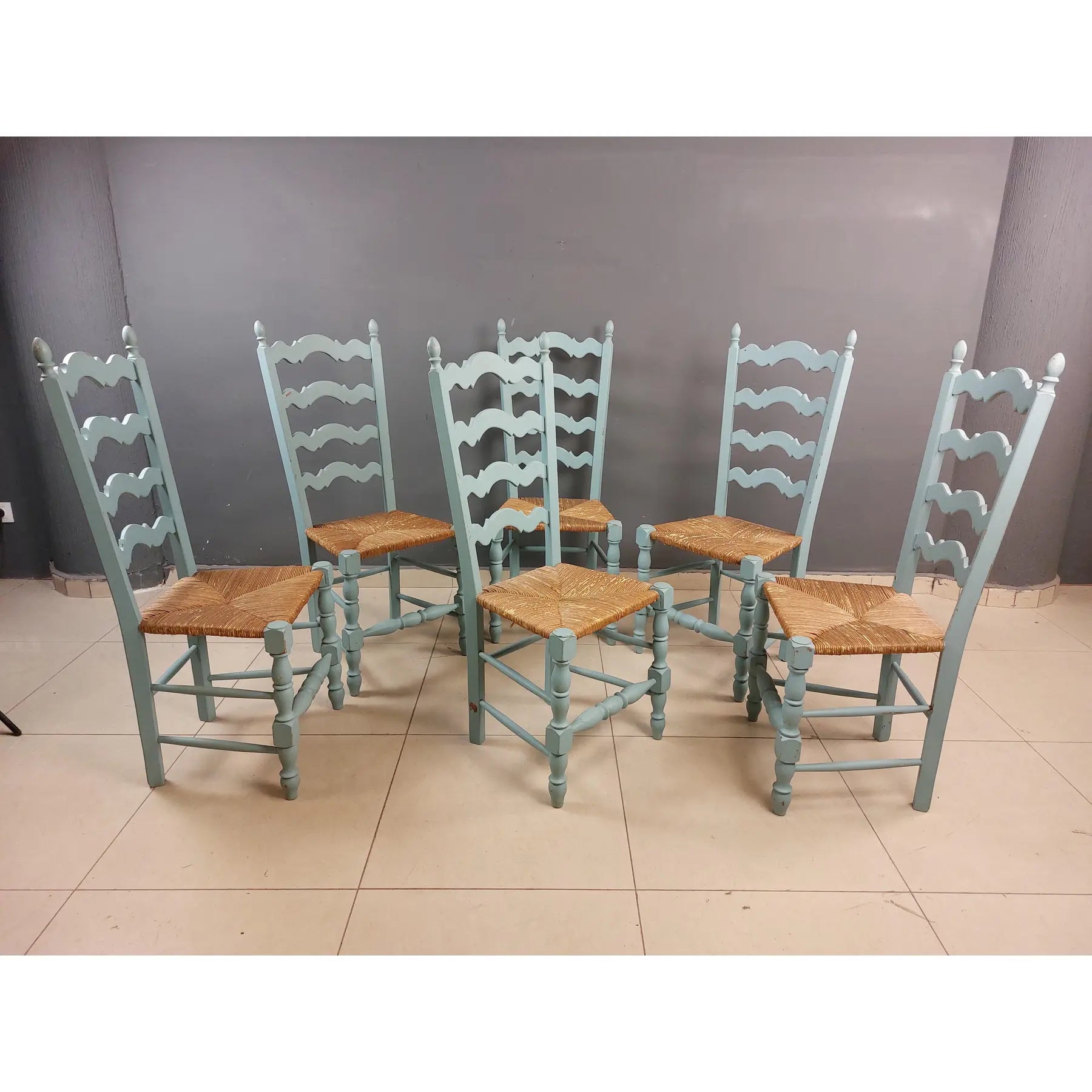 Vintage French Farmhouse Blue Painted Dining Chairs With Rush Woven Seats - Set of 6