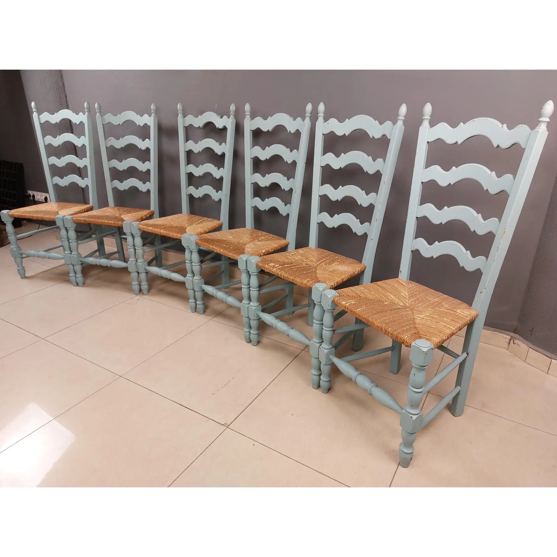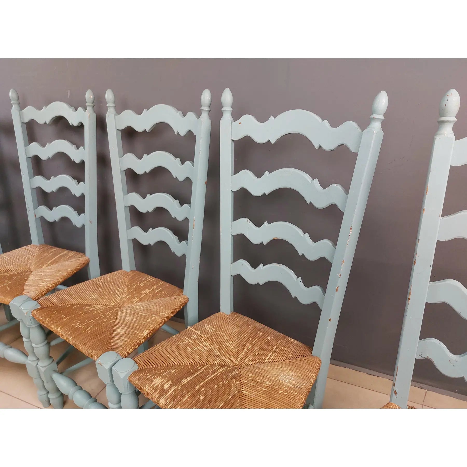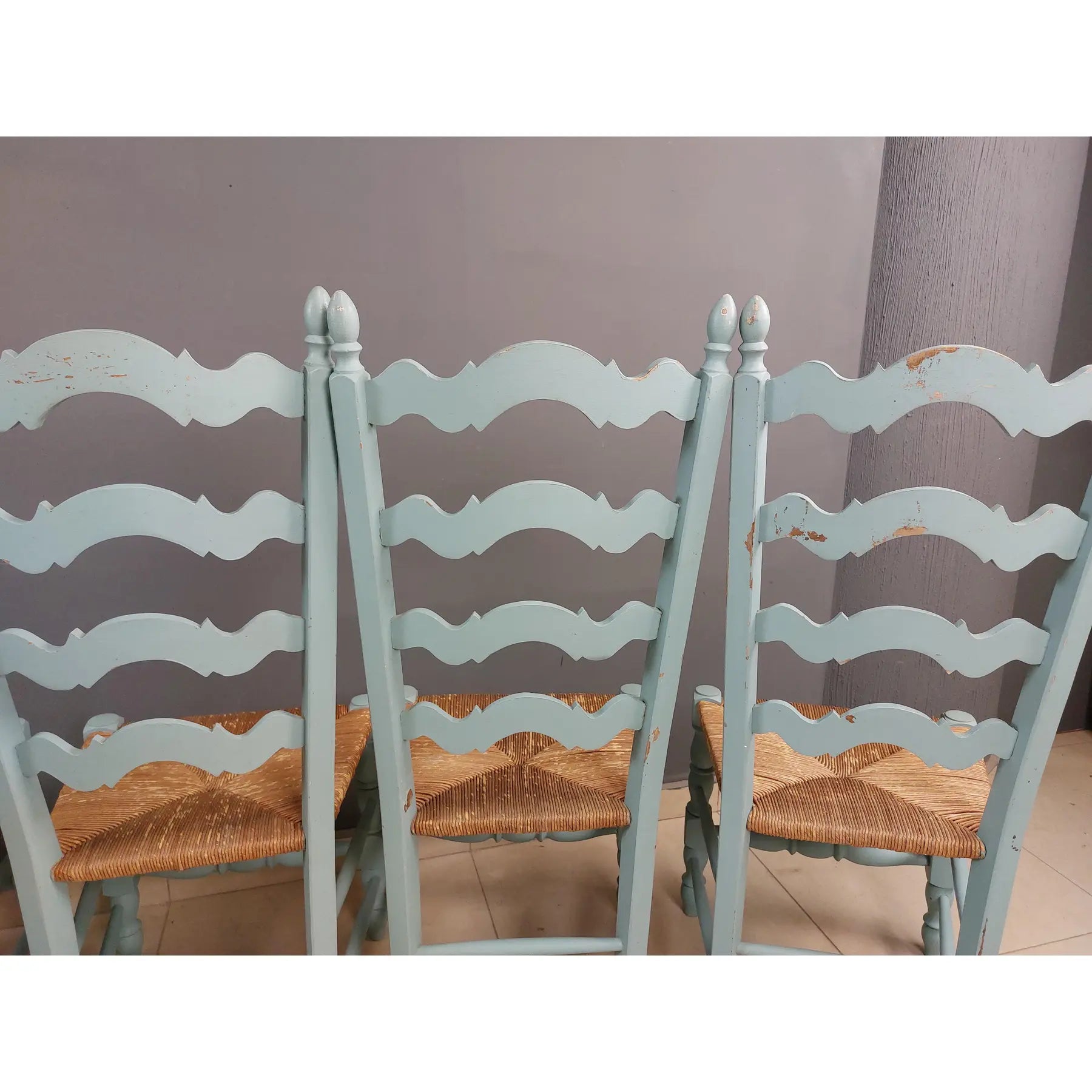 Set of six hand painted French Farmhouse Style dining chairs with solid wood base in sky blue color and original woven rush seats. This vintage inspired set cuts a wonderfully Farmhouse silhouette. The chairs feature a rush woven seat and high ladder back, supported on four solid legs conjoined with stretchers. You will love the sophistication they add to your home interior.