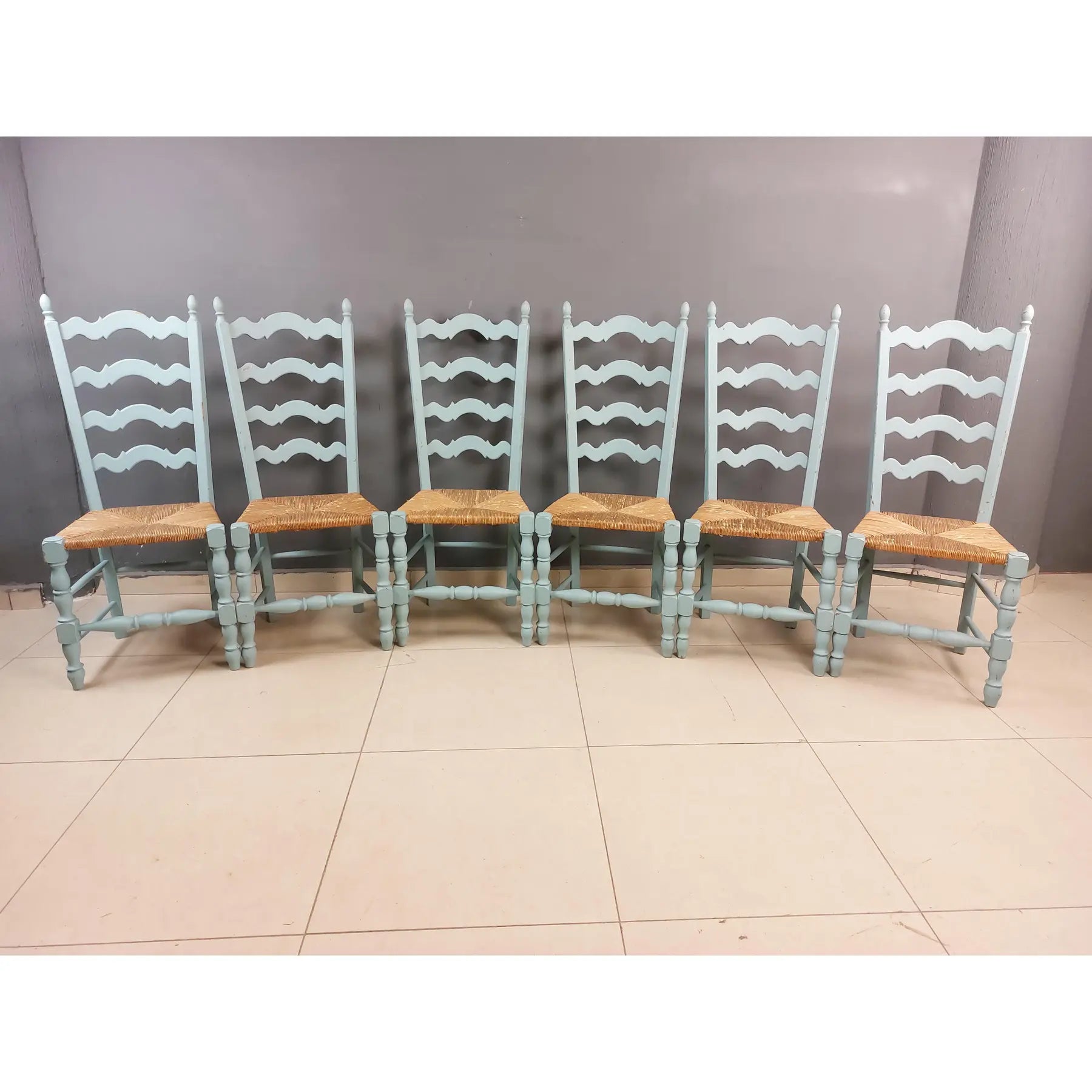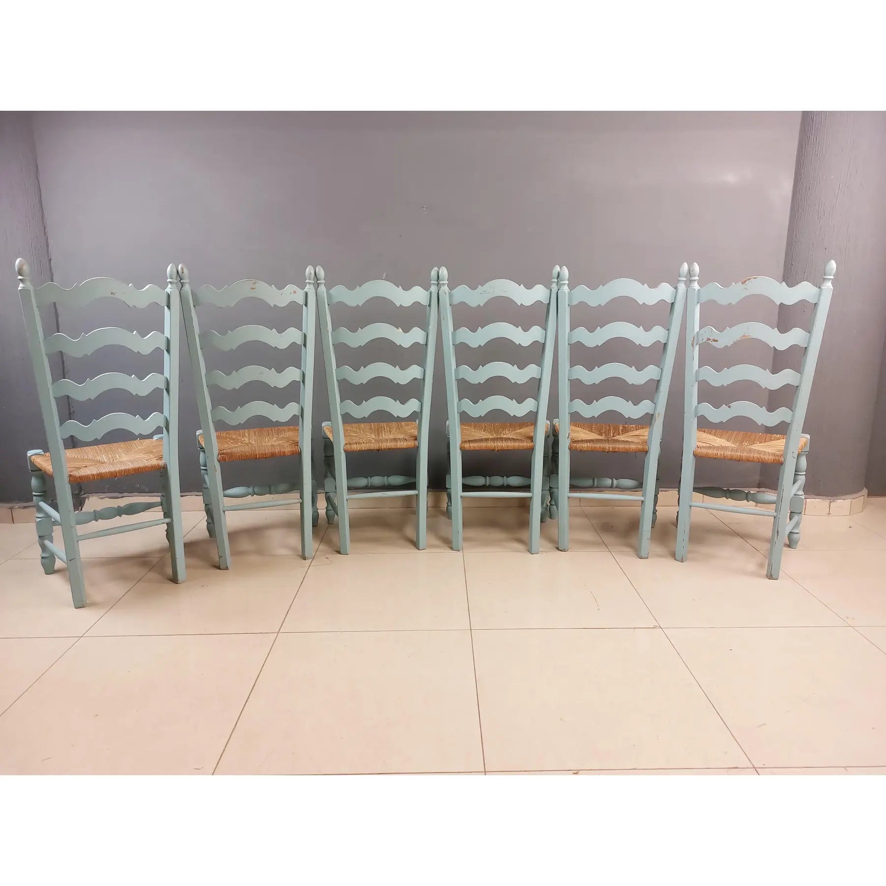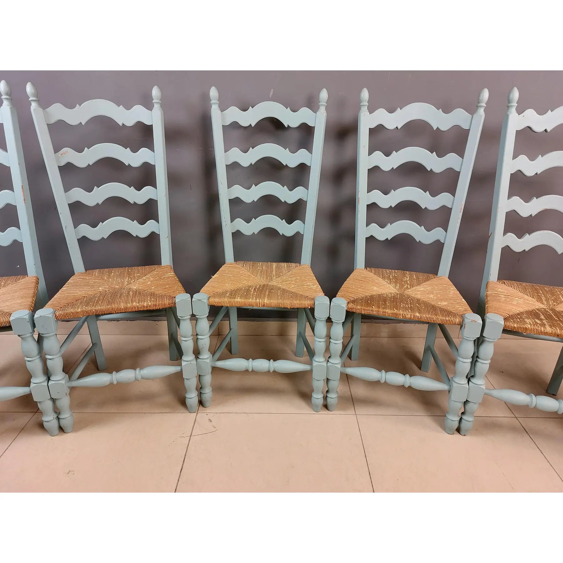 Set of six hand painted French Farmhouse Style dining chairs with solid wood base in sky blue color and original woven rush seats. This vintage inspired set cuts a wonderfully Farmhouse silhouette. The chairs feature a rush woven seat and high ladder back, supported on four solid legs conjoined with stretchers. You will love the sophistication they add to your home interior.