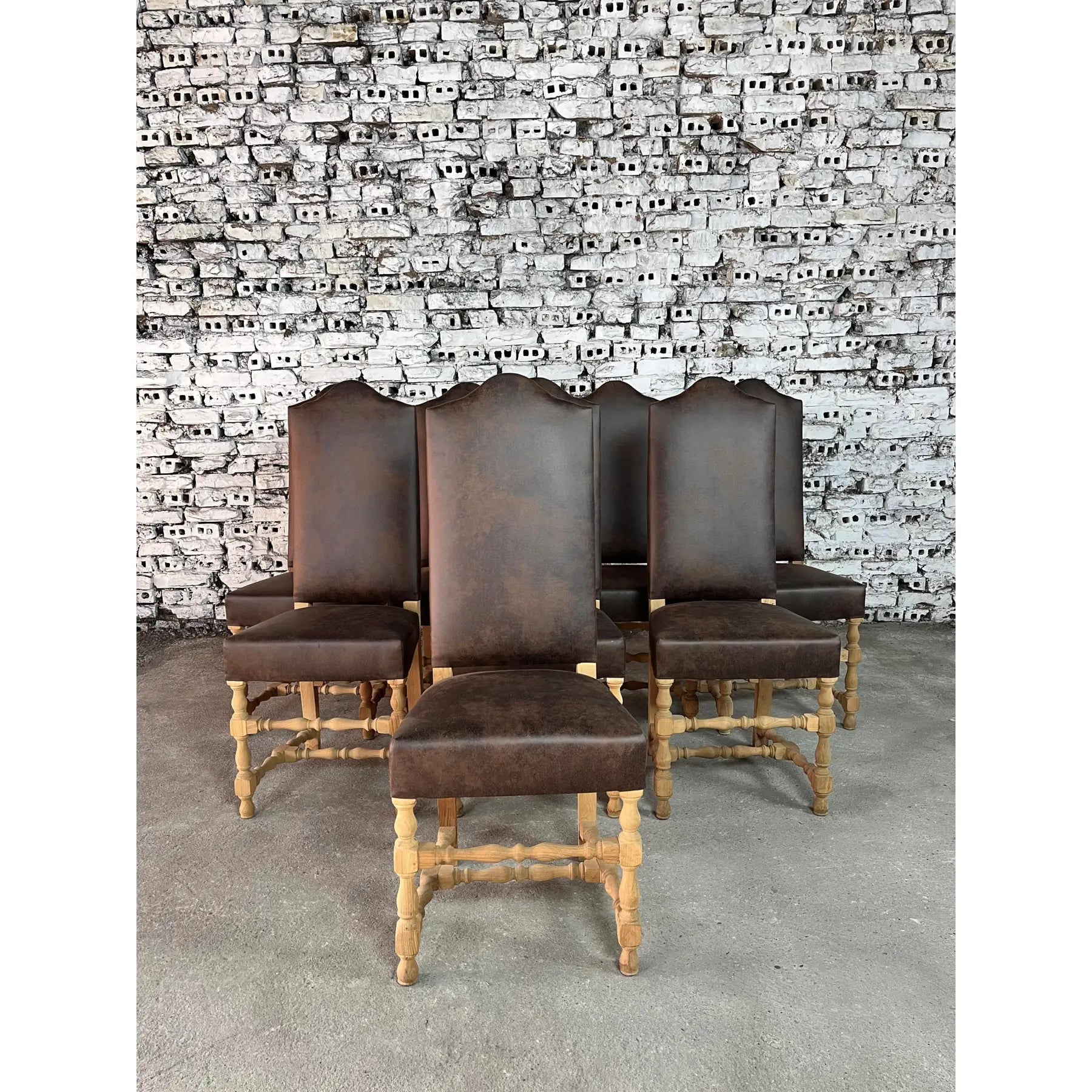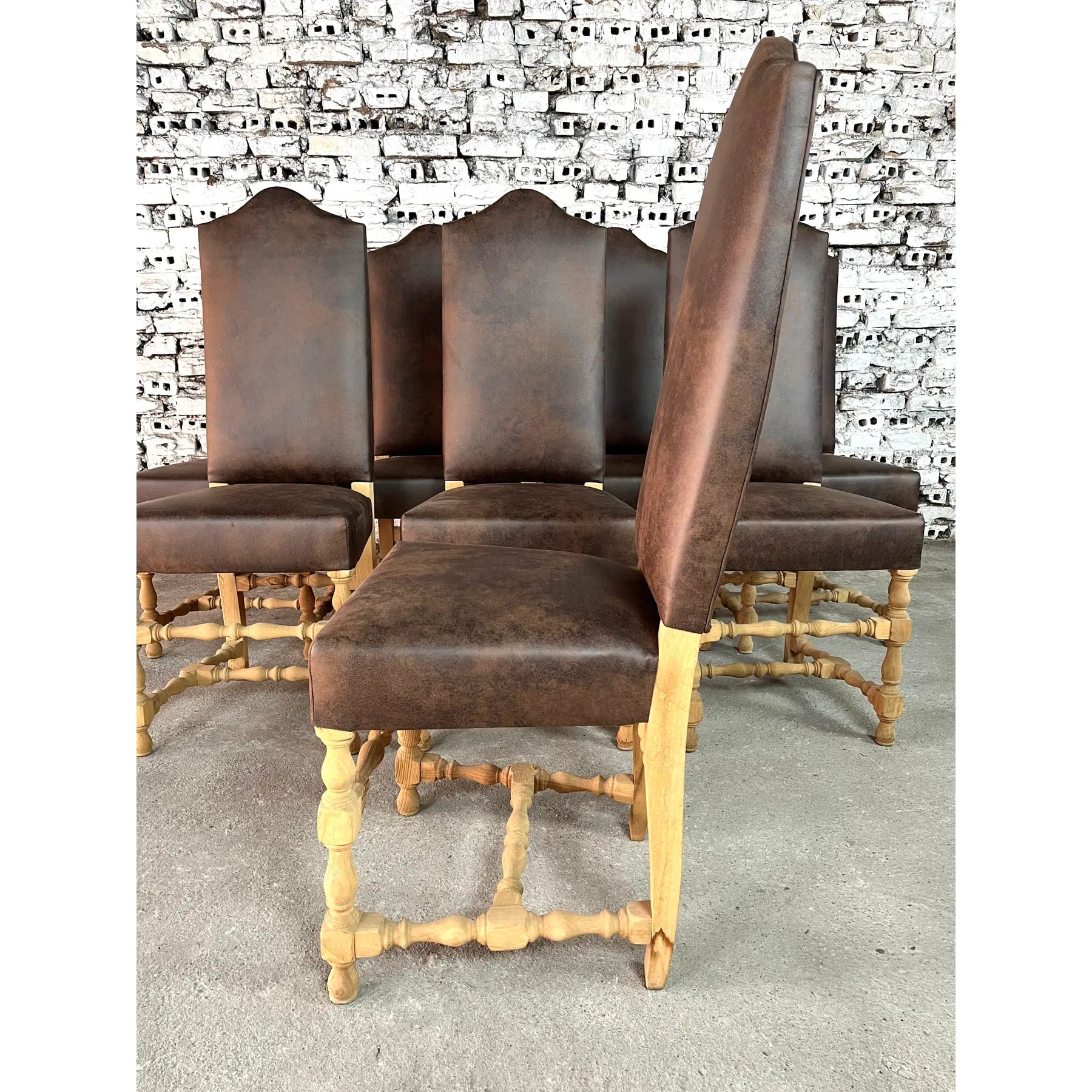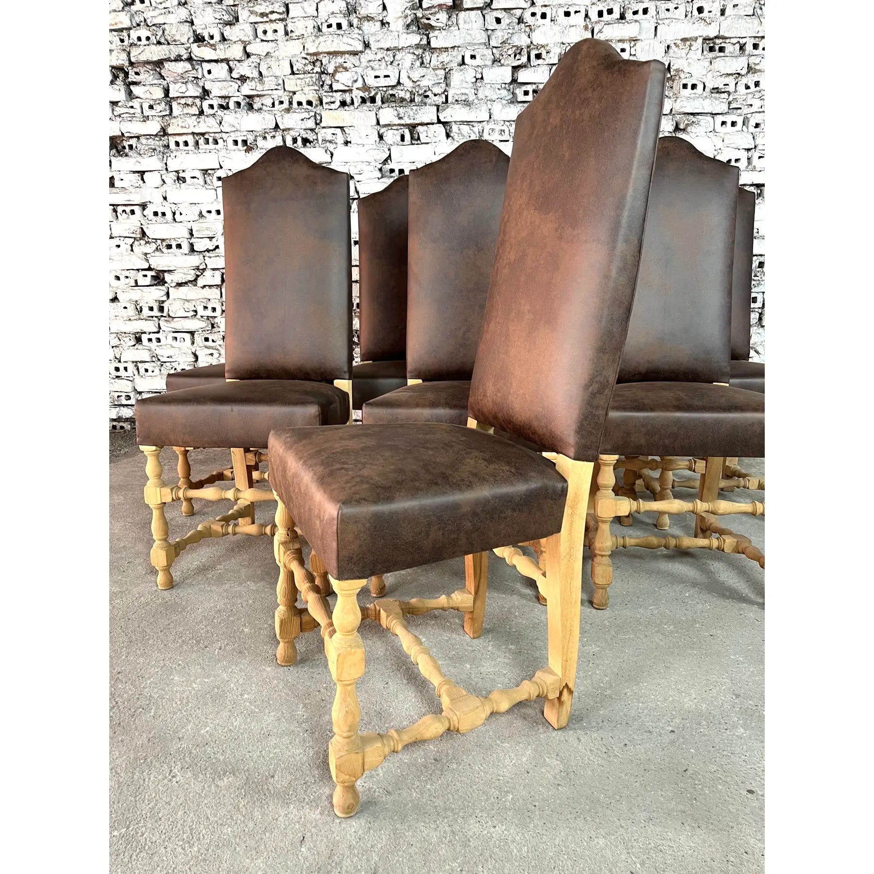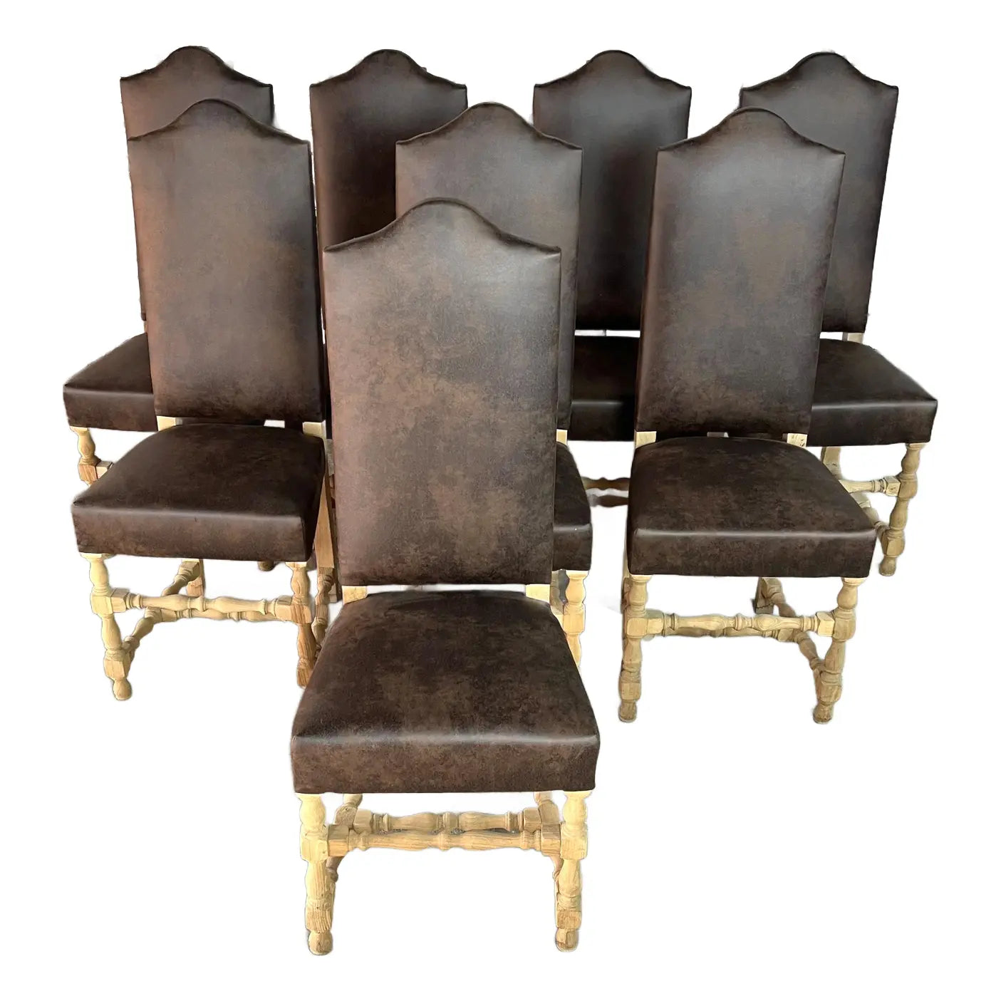 Set of 8 solid wood French Vintage Louis XIII style high back dining room chairs. Newly upholstered in brown faux leather fabric. Excellent joinery and craftsmanship.