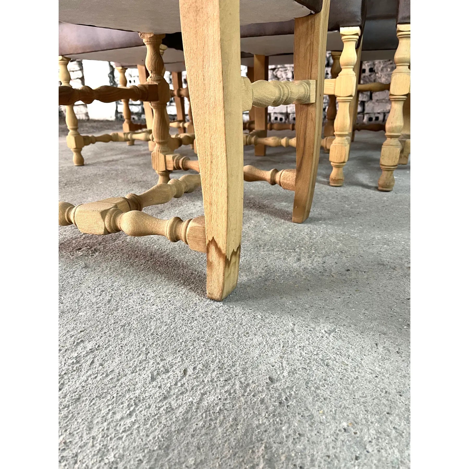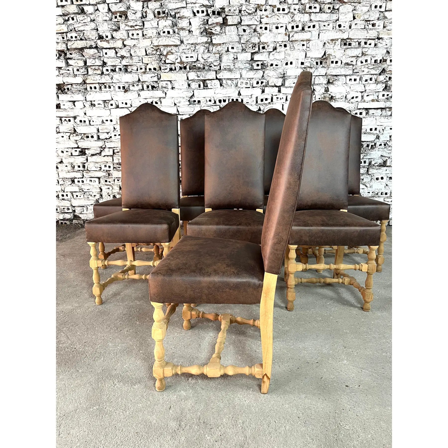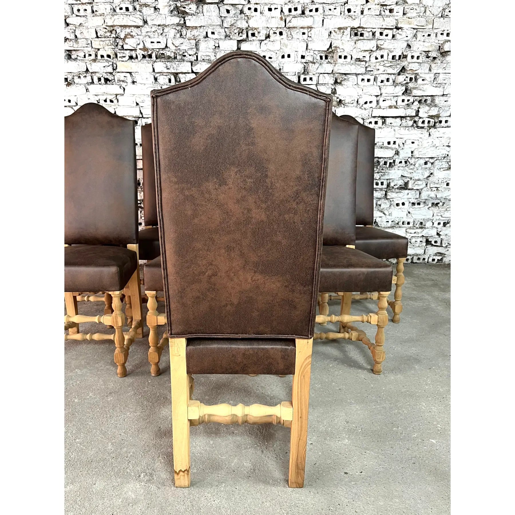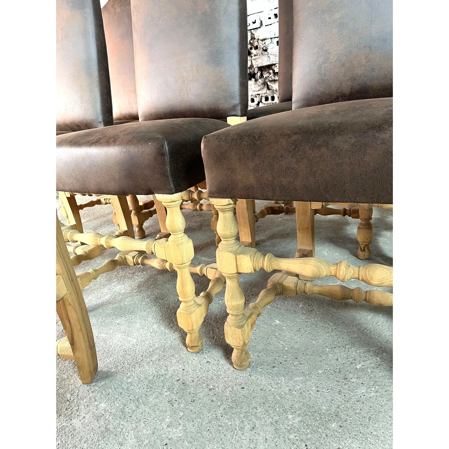 Set of 8 solid wood French Vintage Louis XIII style high back dining room chairs. Newly upholstered in brown faux leather fabric. Excellent joinery and craftsmanship.