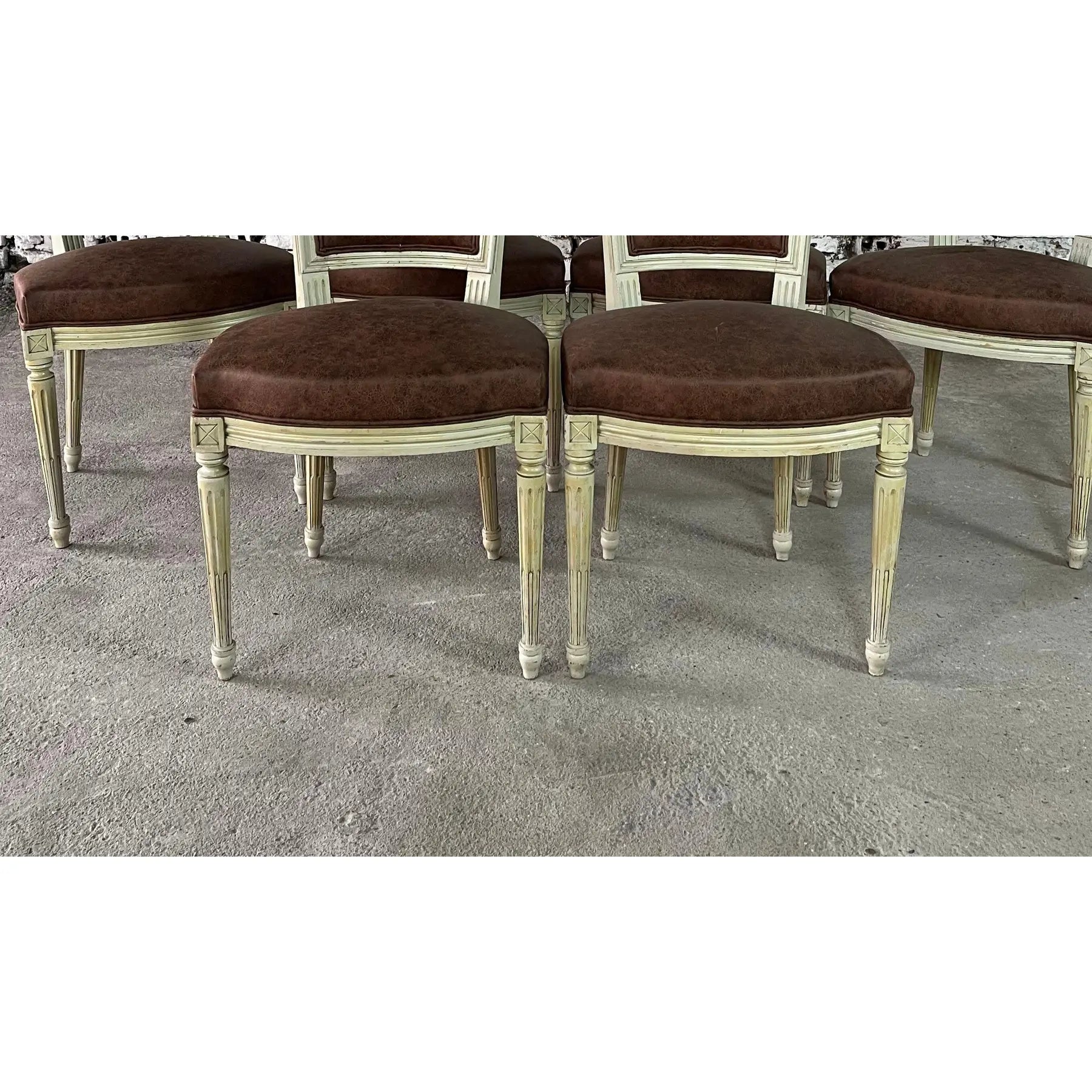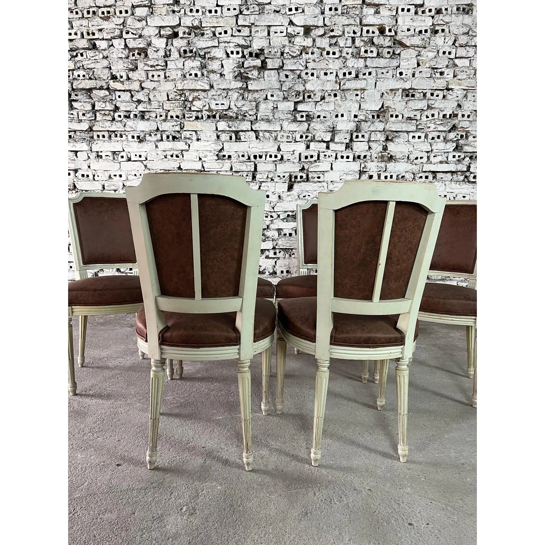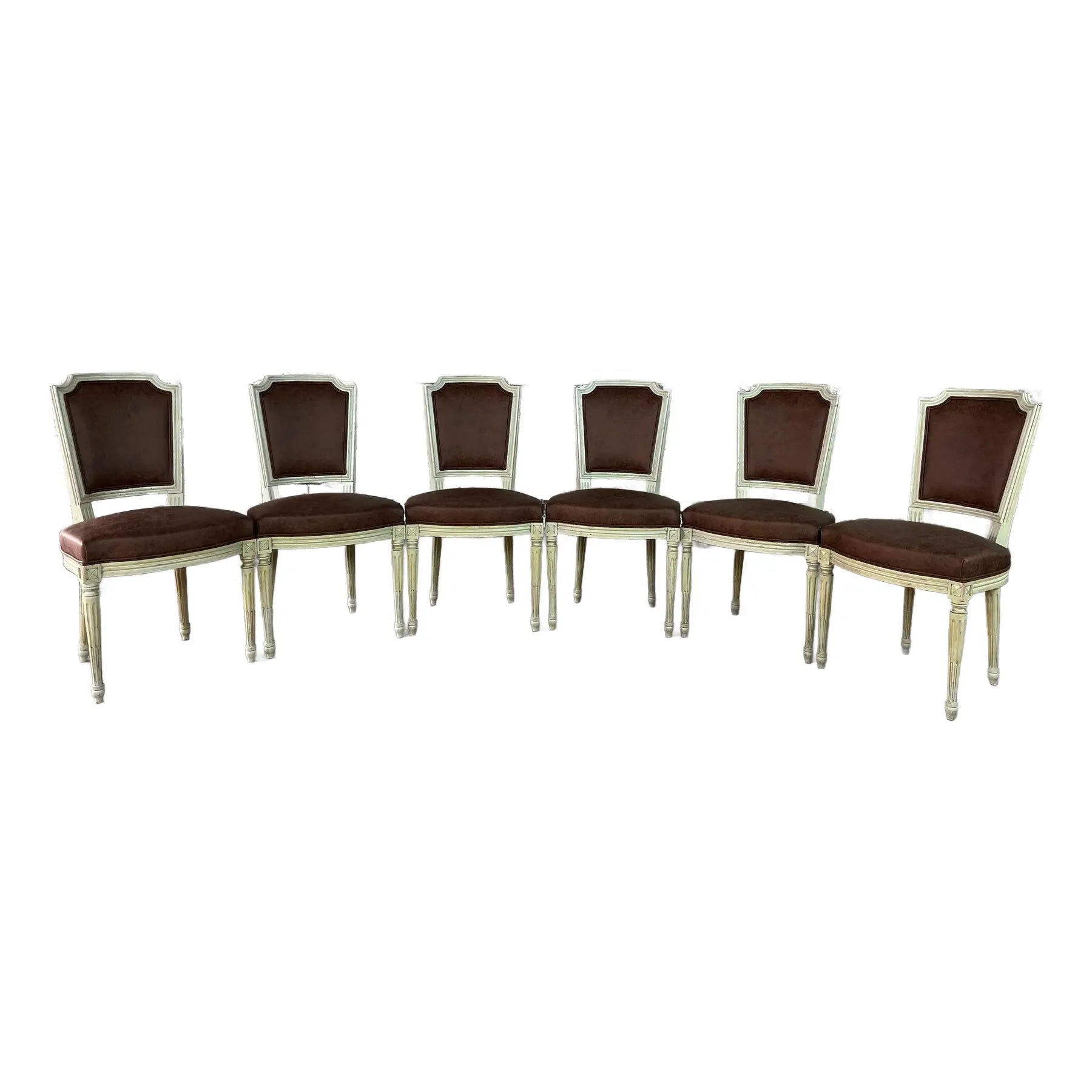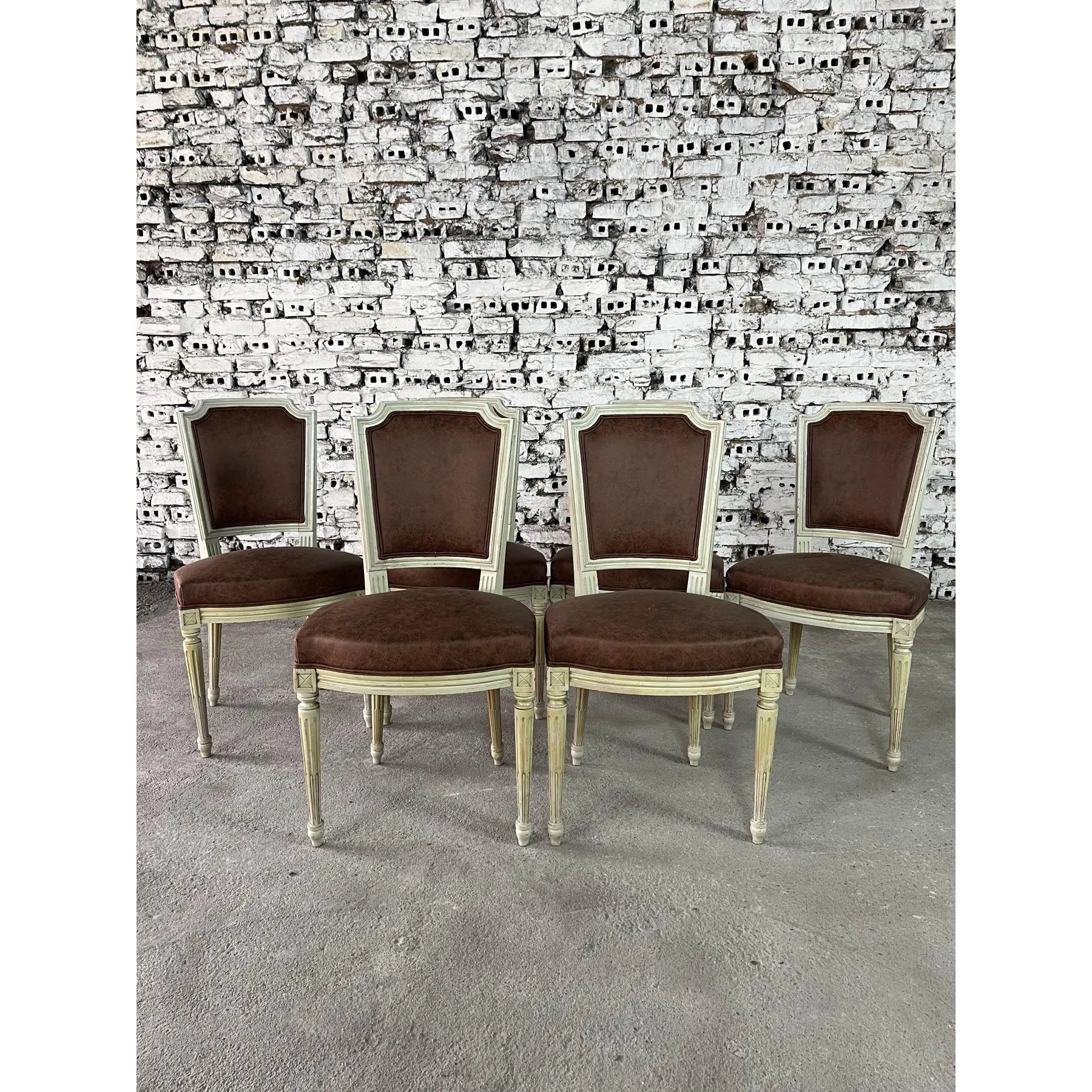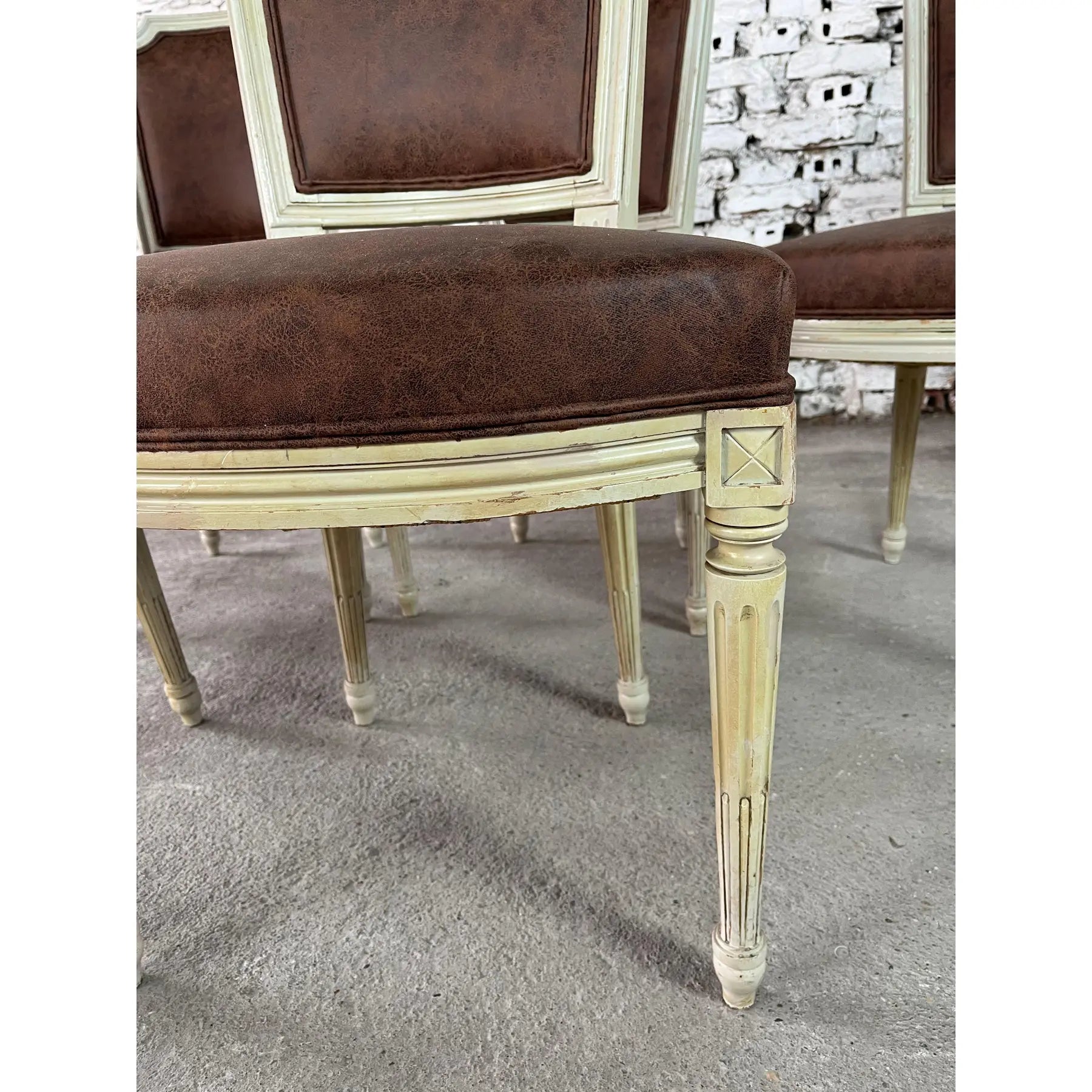 Set of 6 French Louis XVI style dining chairs, newly upholstered in dark brown faux leather fabric. Carved wood painted in off-white. Vintage furniture is great for the environment, for your home and for your wallet.