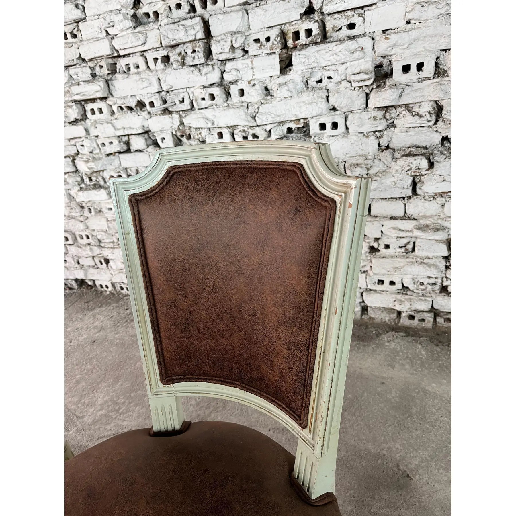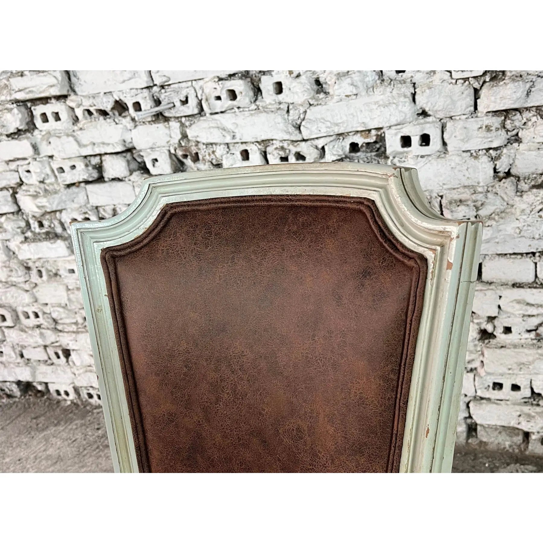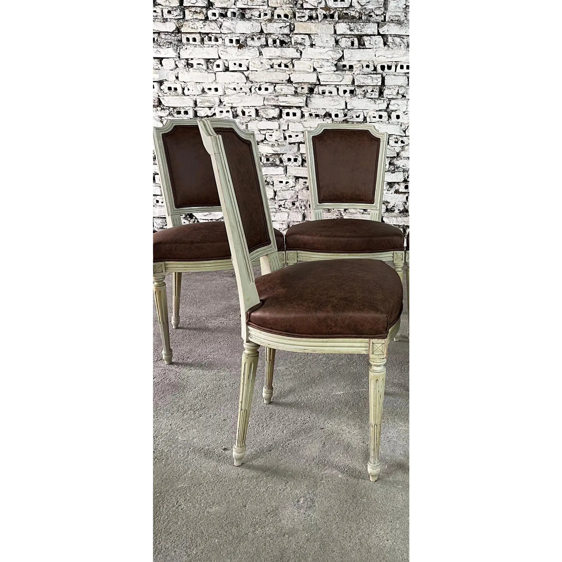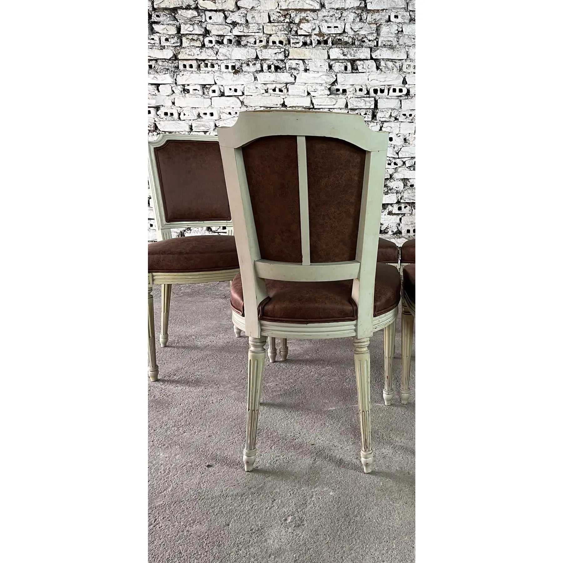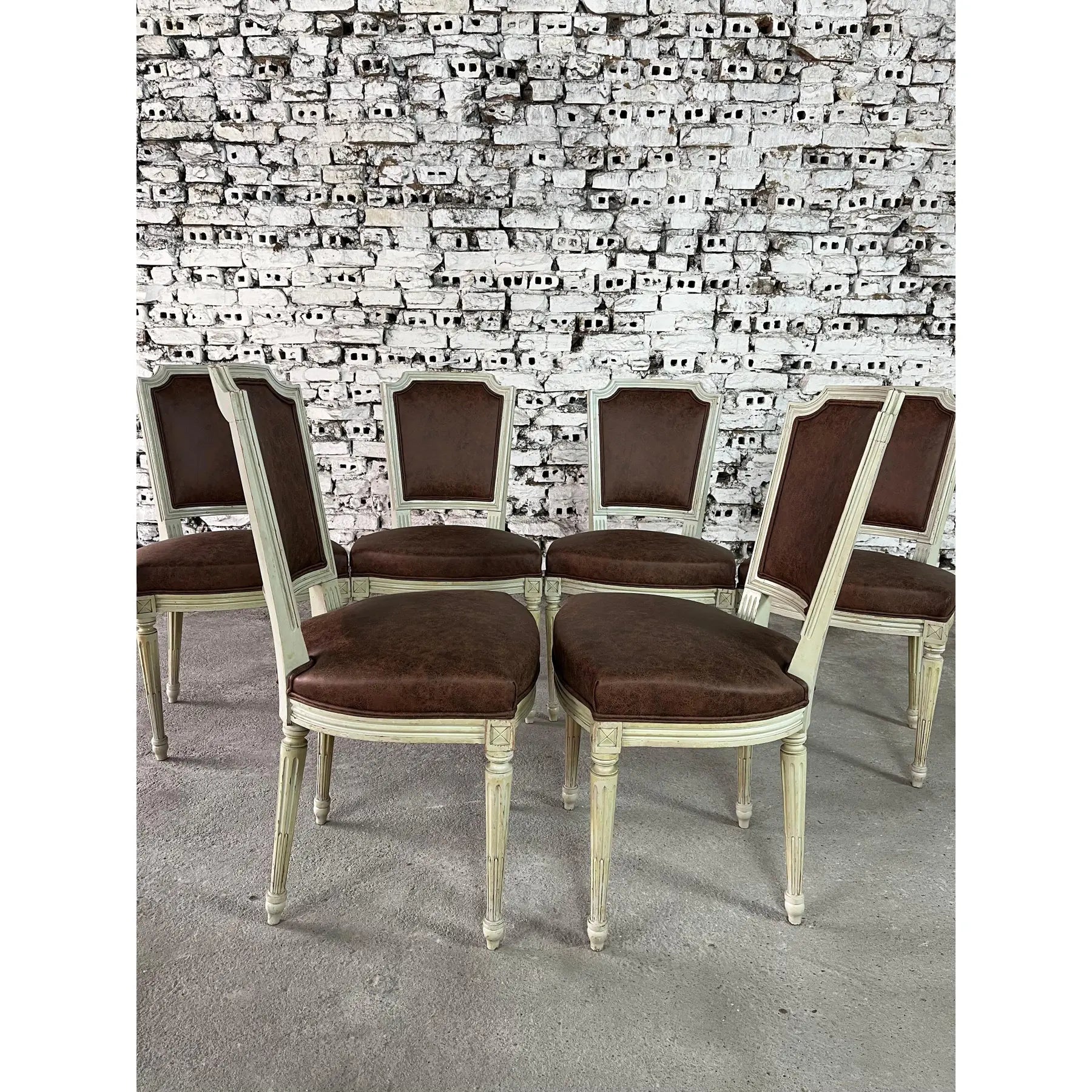 Set of 6 French Louis XVI style dining chairs, newly upholstered in dark brown faux leather fabric. Carved wood painted in off-white. Vintage furniture is great for the environment, for your home and for your wallet.
