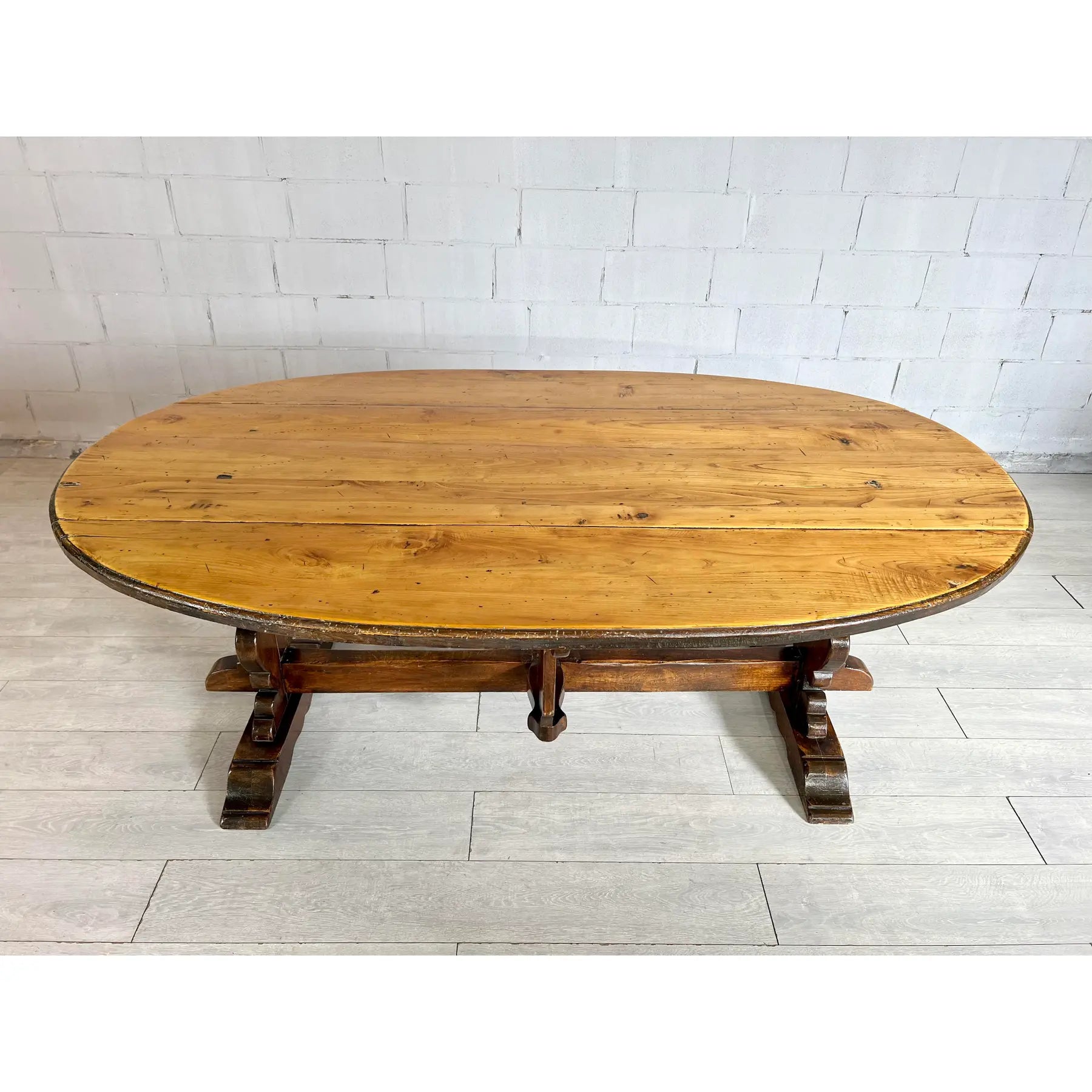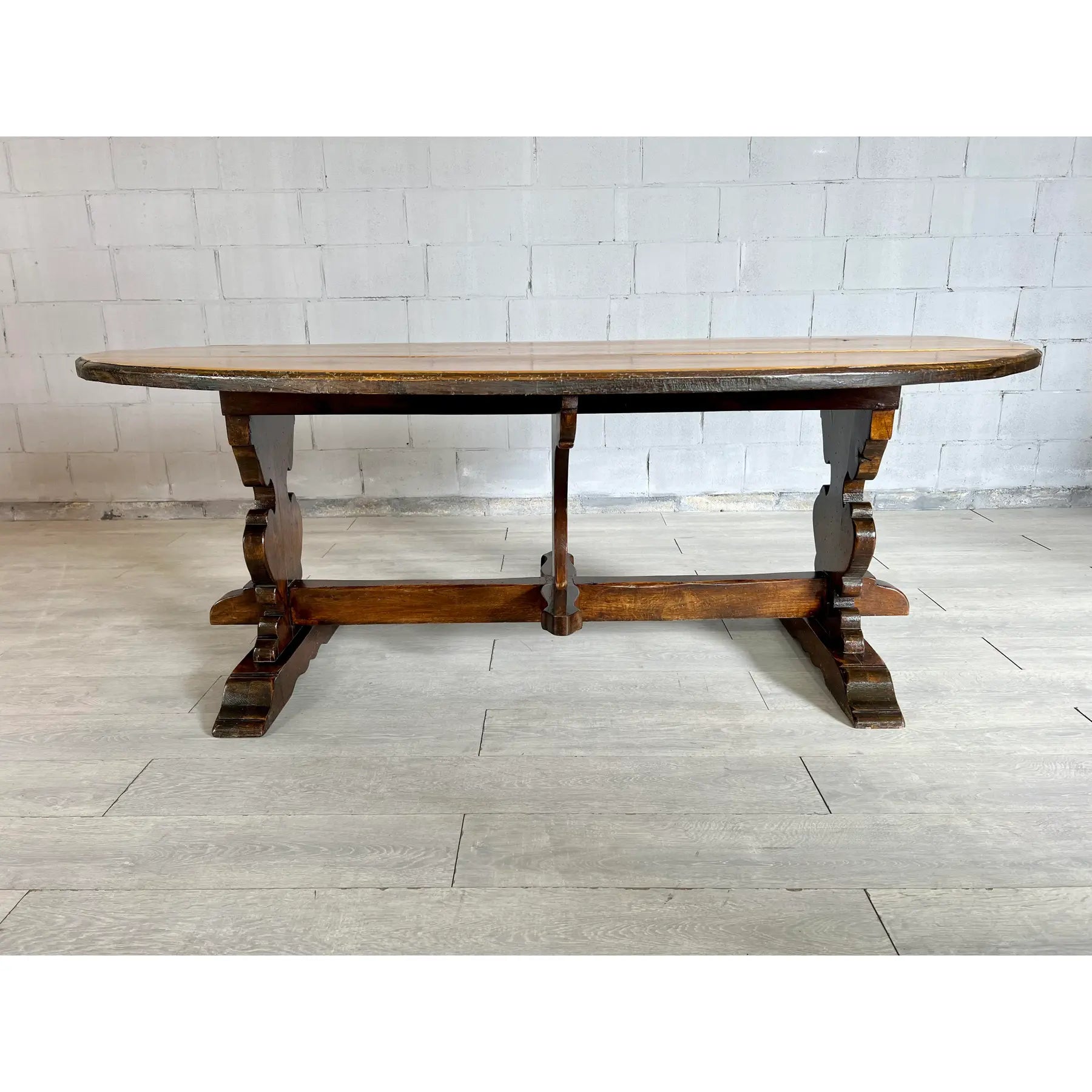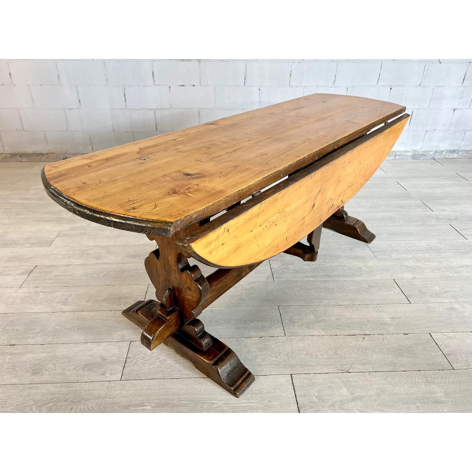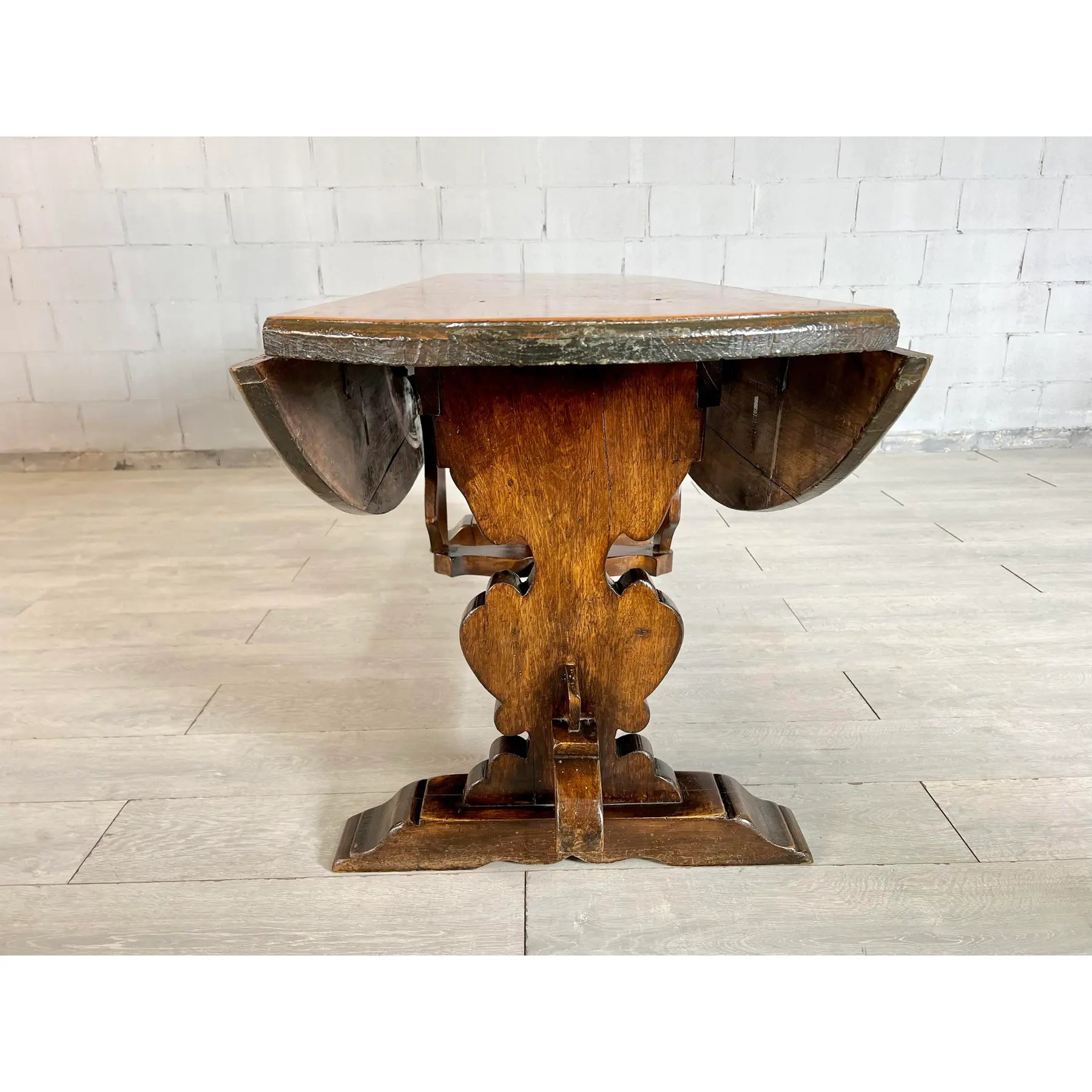 Lovely Vintage Baroque Style Walnut Oval Top Drop Leaf Dining Table from Italy. Beautiful oval top in lighter tone of color raised on impressive trestle Baroque style base. The legs are shaped with a wooden stretcher connecting just above the feet. Rich color and patina. This is a very useful table as can be used with both leaves down or one leaf open or both leaves open. Highly versatile as well as functional, this large dining table is a rare and a wonderful find. Excellent joinery and craftsmanship.