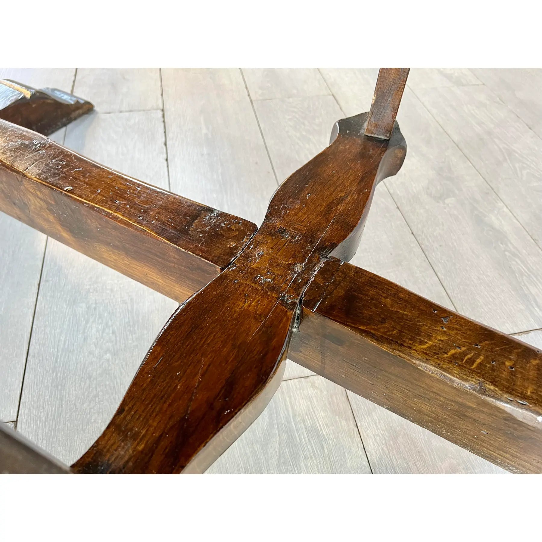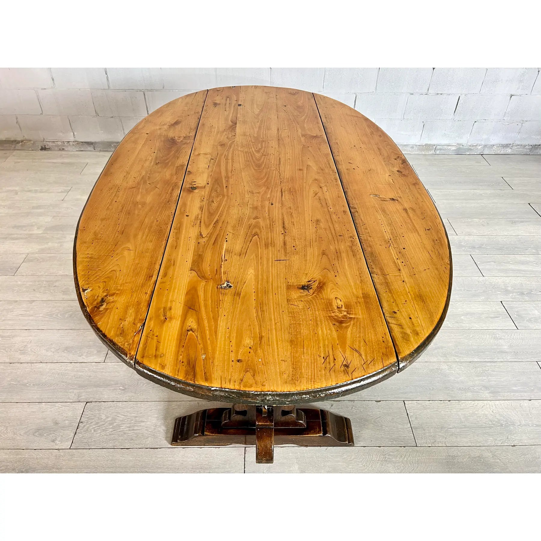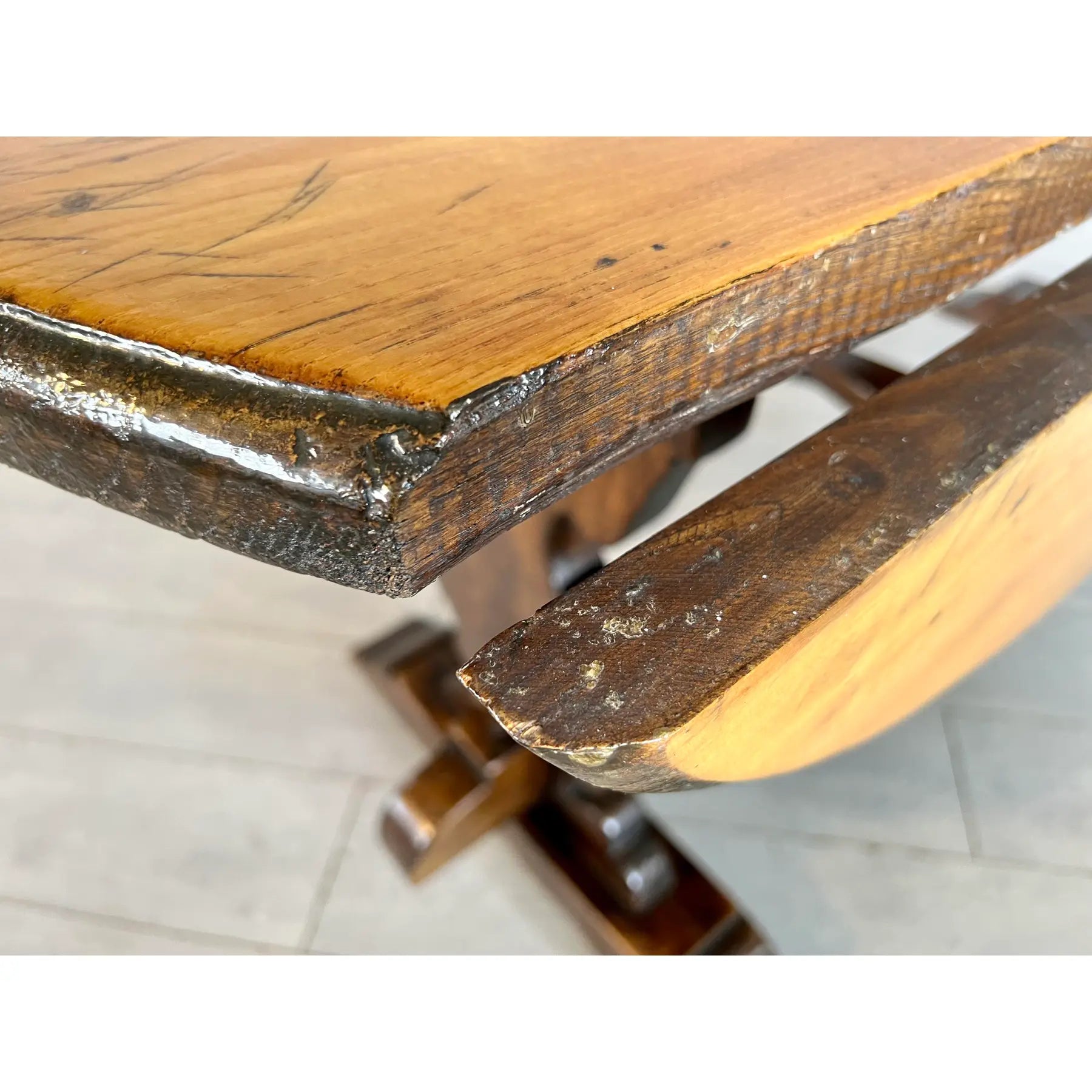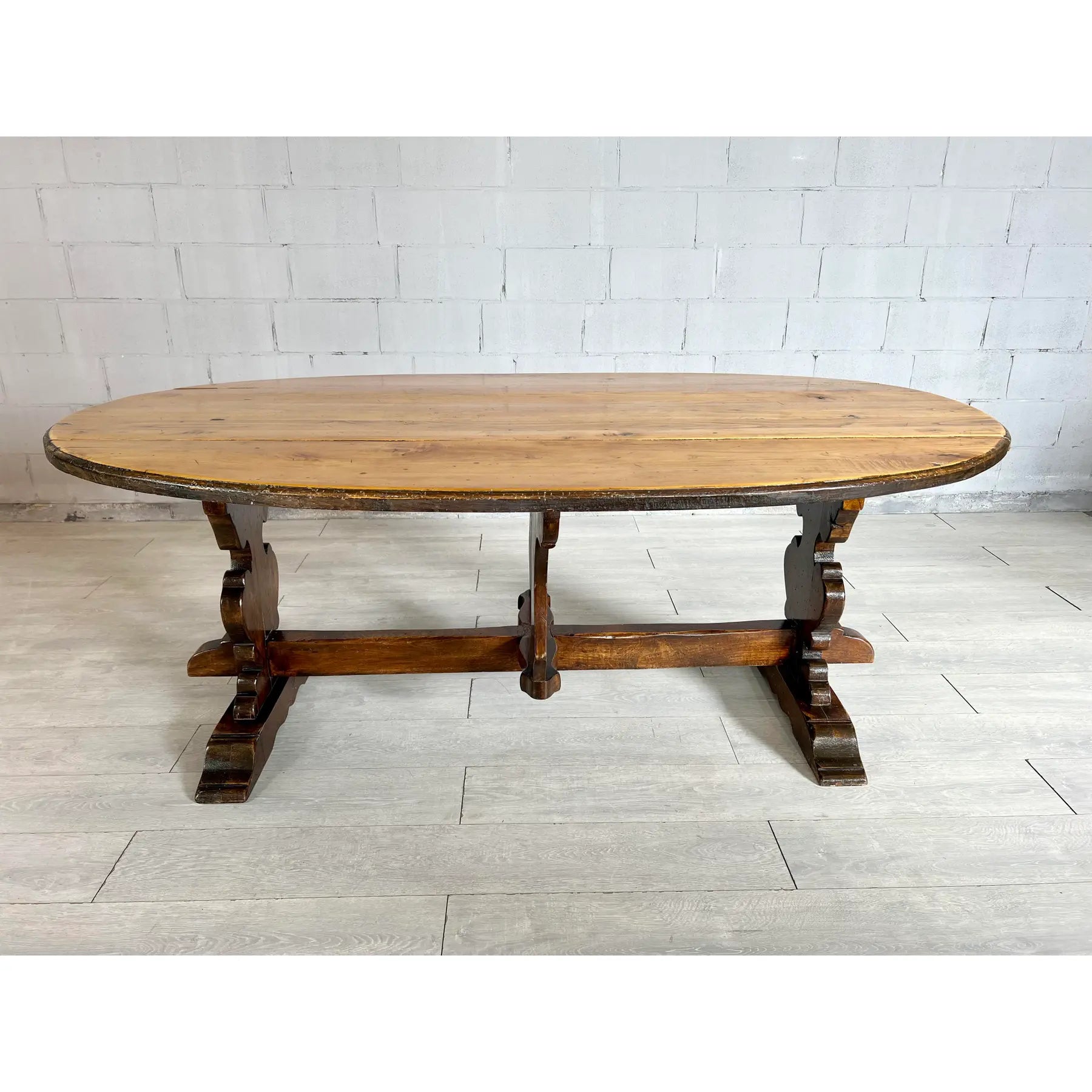 Lovely Vintage Baroque Style Walnut Oval Top Drop Leaf Dining Table from Italy. Beautiful oval top in lighter tone of color raised on impressive trestle Baroque style base. The legs are shaped with a wooden stretcher connecting just above the feet. Rich color and patina. This is a very useful table as can be used with both leaves down or one leaf open or both leaves open. Highly versatile as well as functional, this large dining table is a rare and a wonderful find. Excellent joinery and craftsmanship.