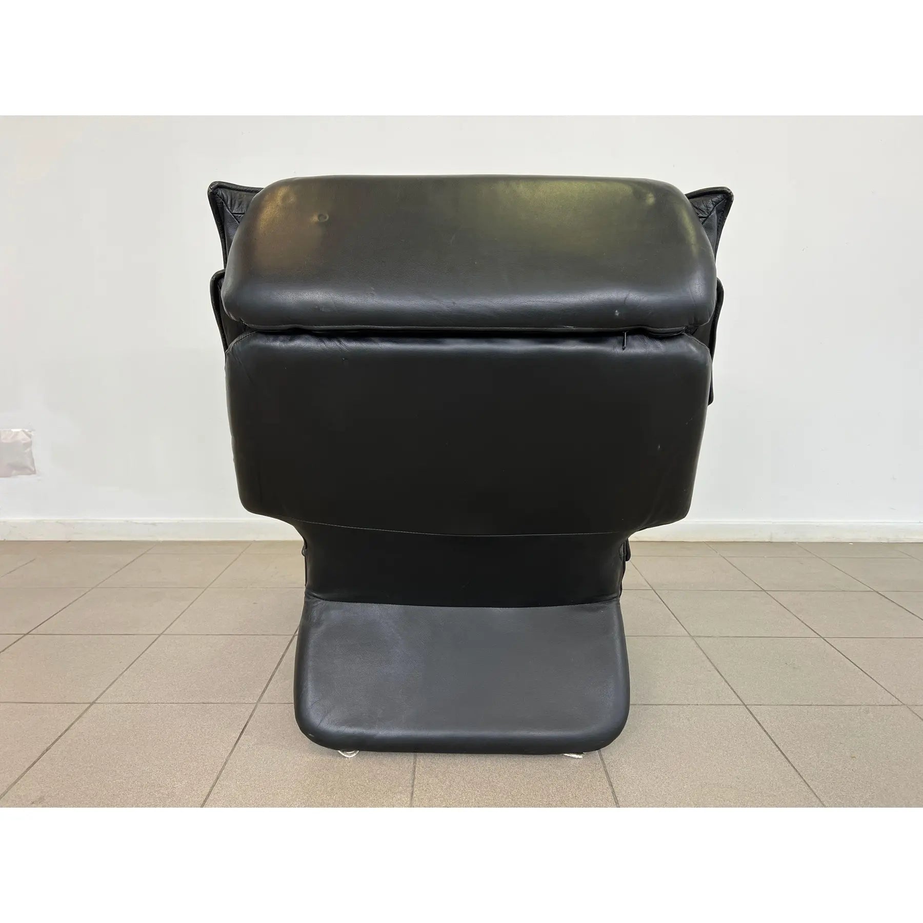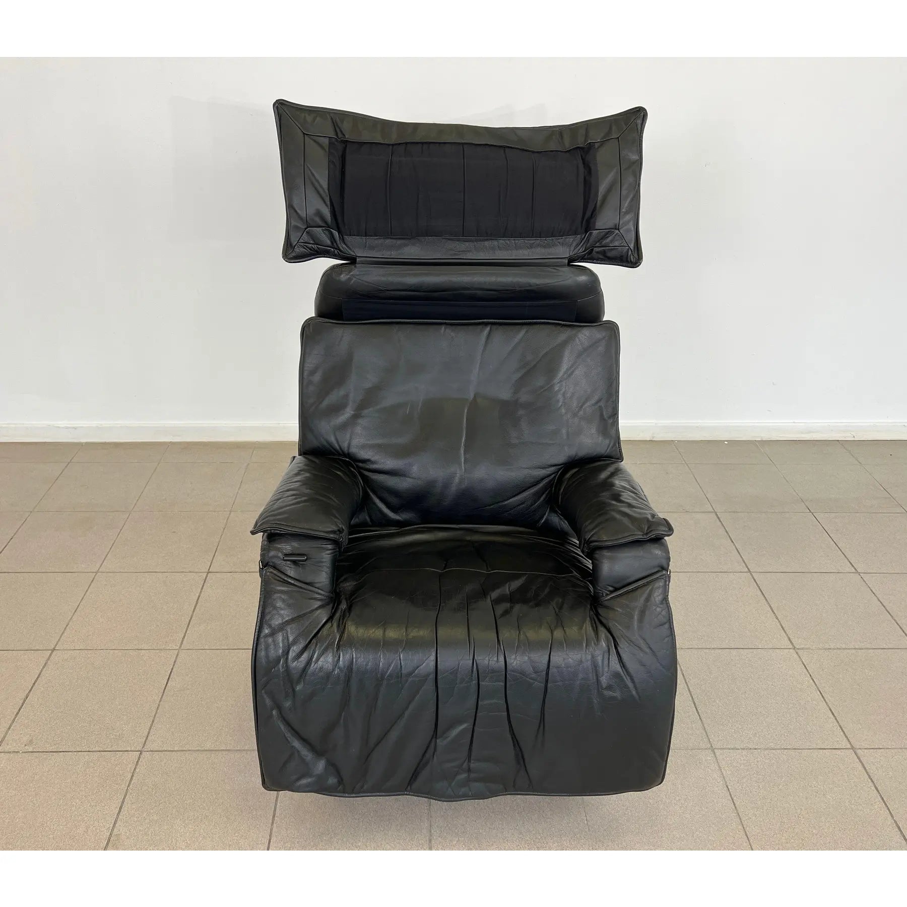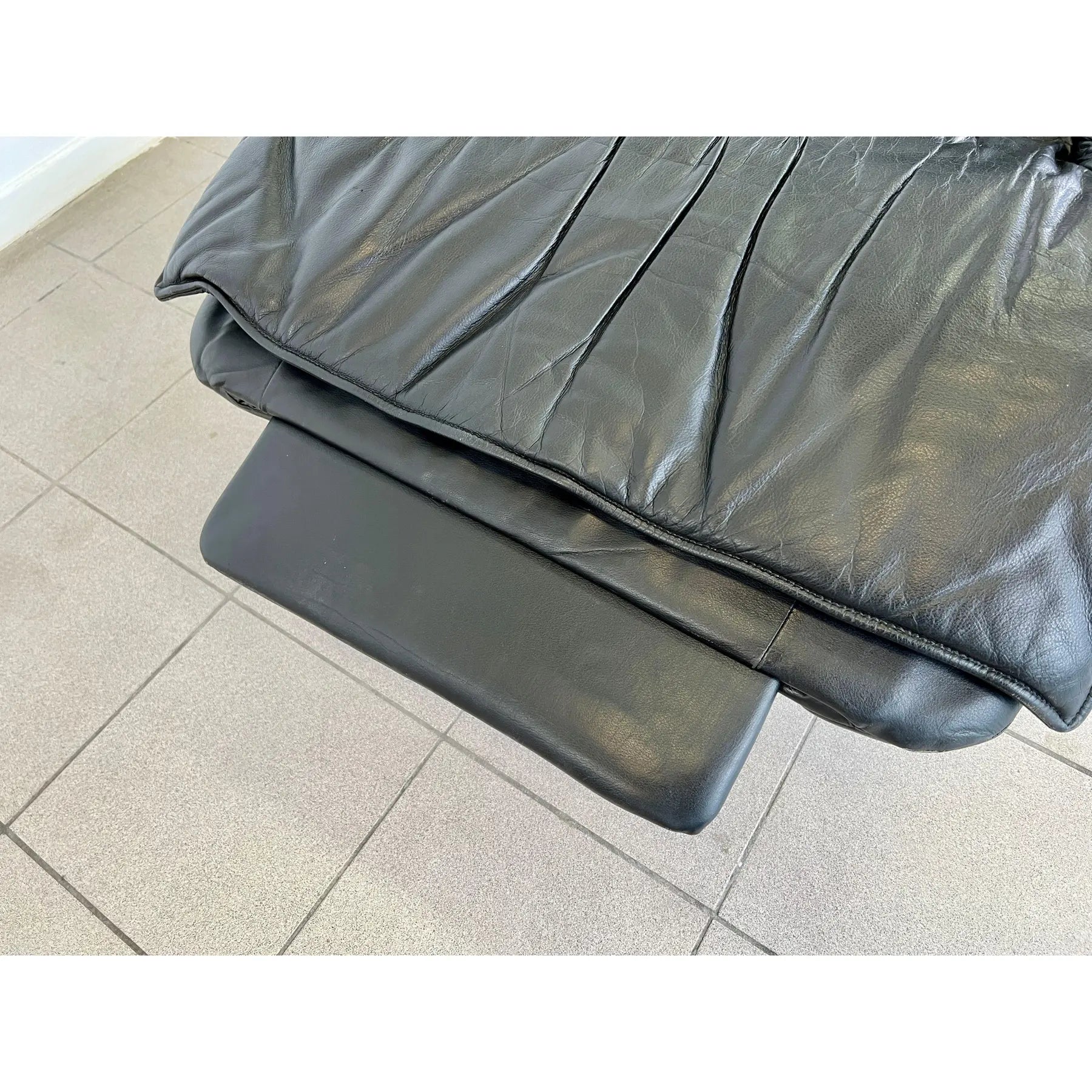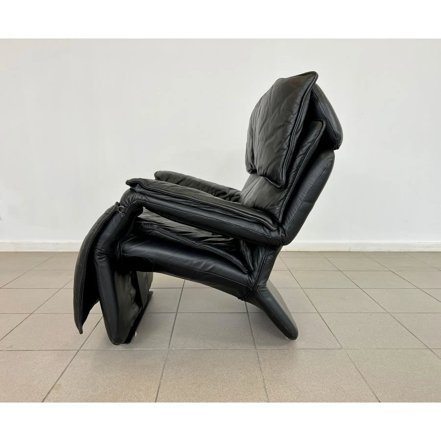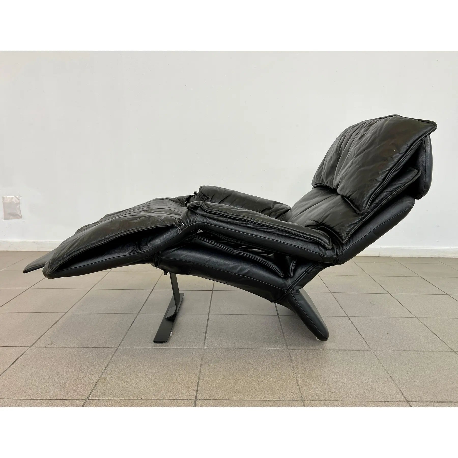 Vintage black leather adjustable lounge chair by Percival Lafer. The additional footrest extends automatically when reclined. The headrest is extendable. Iron frame.