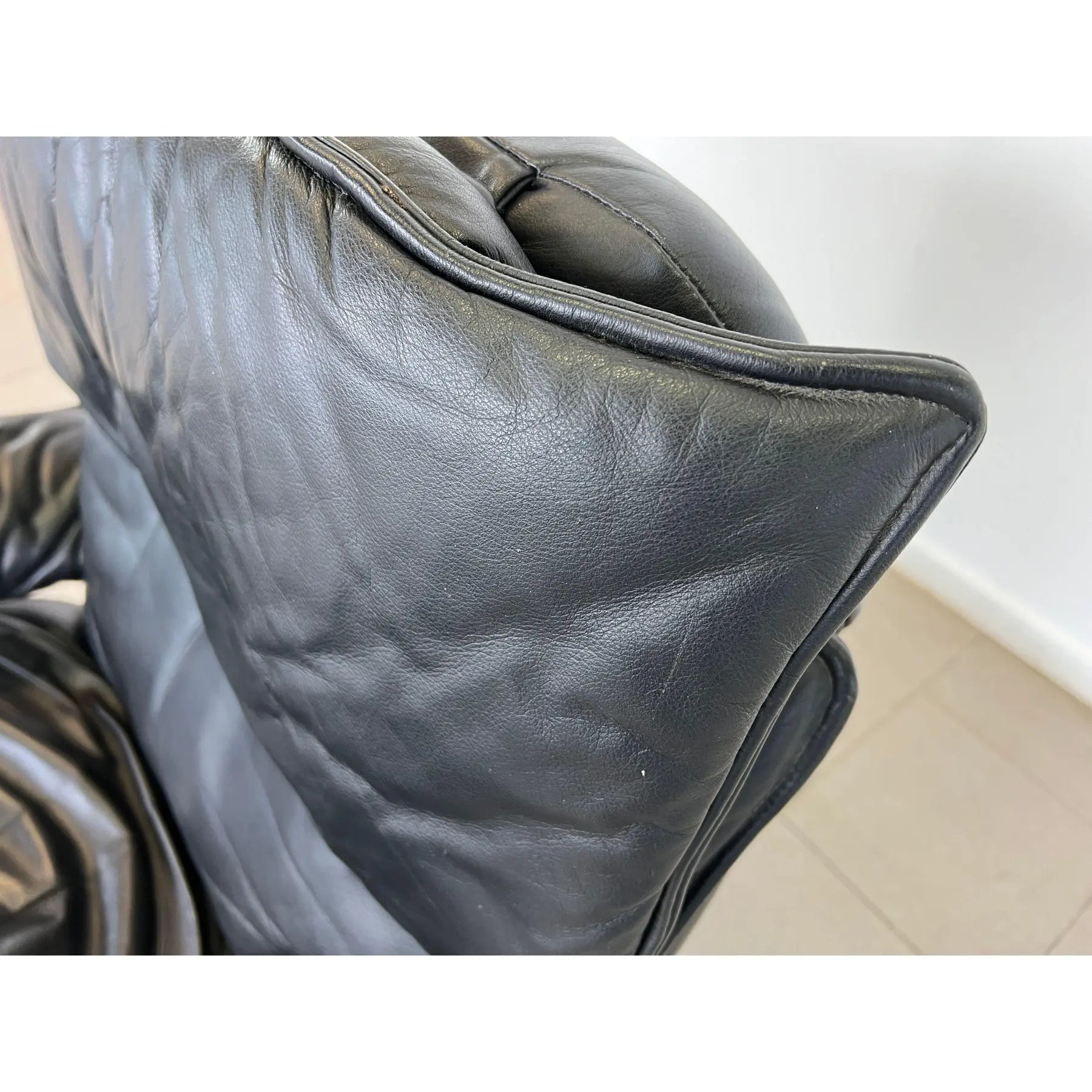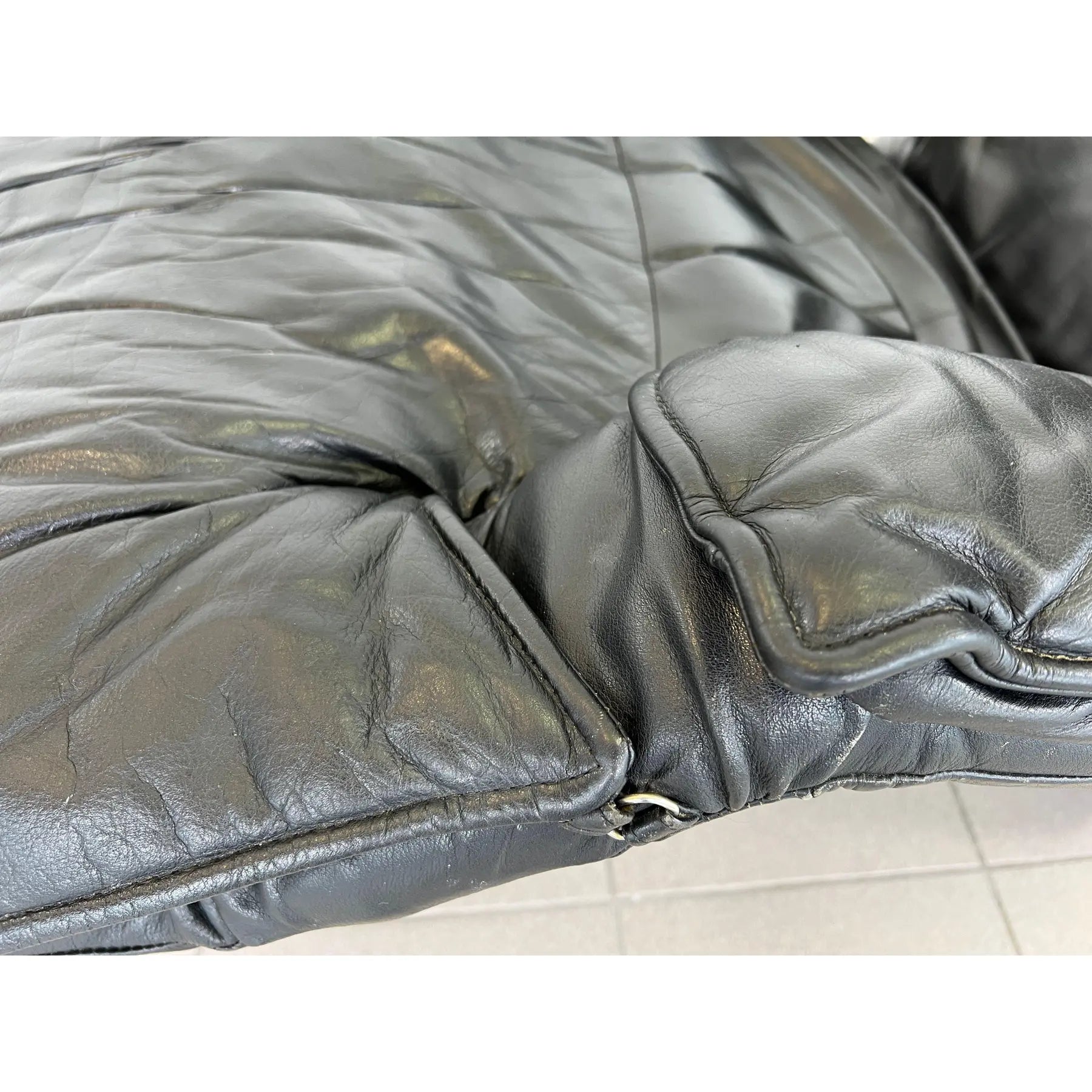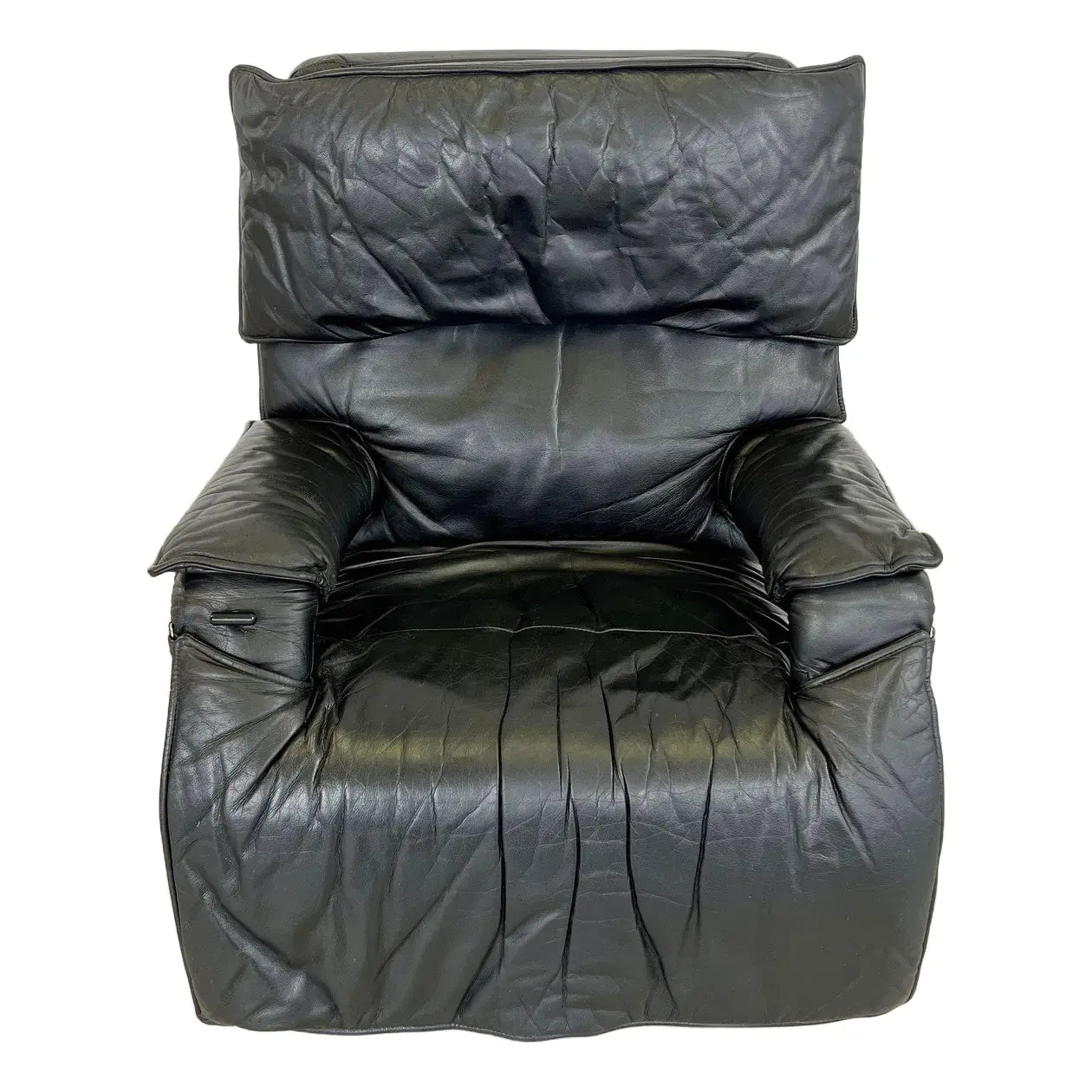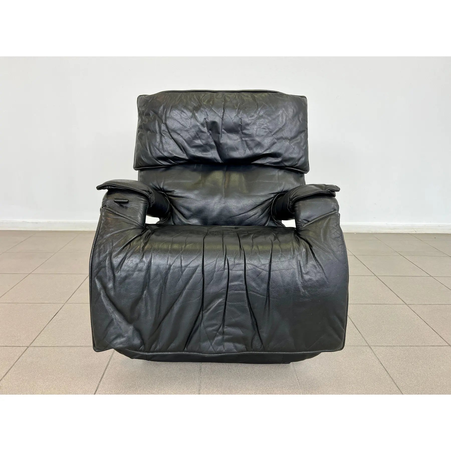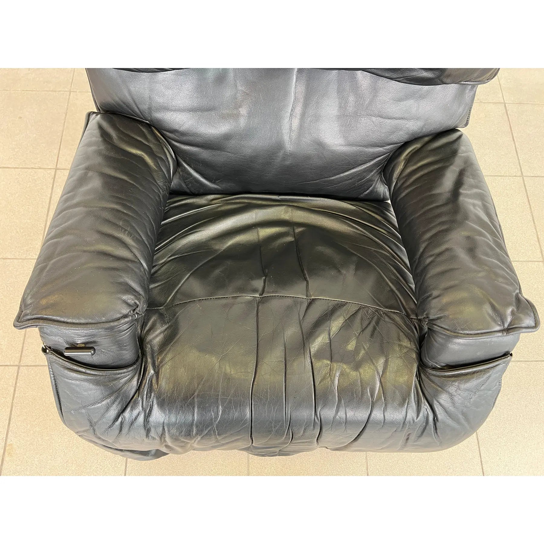 Vintage black leather adjustable lounge chair by Percival Lafer. The additional footrest extends automatically when reclined. The headrest is extendable. Iron frame.