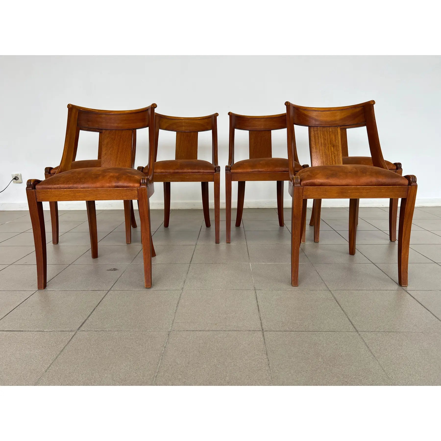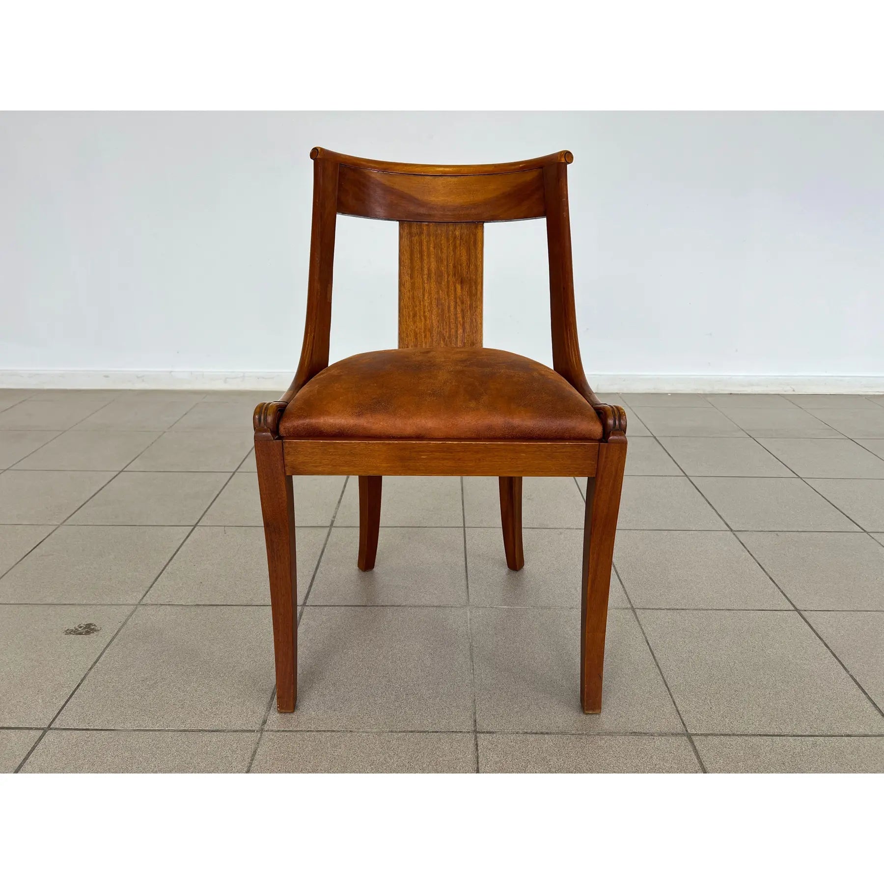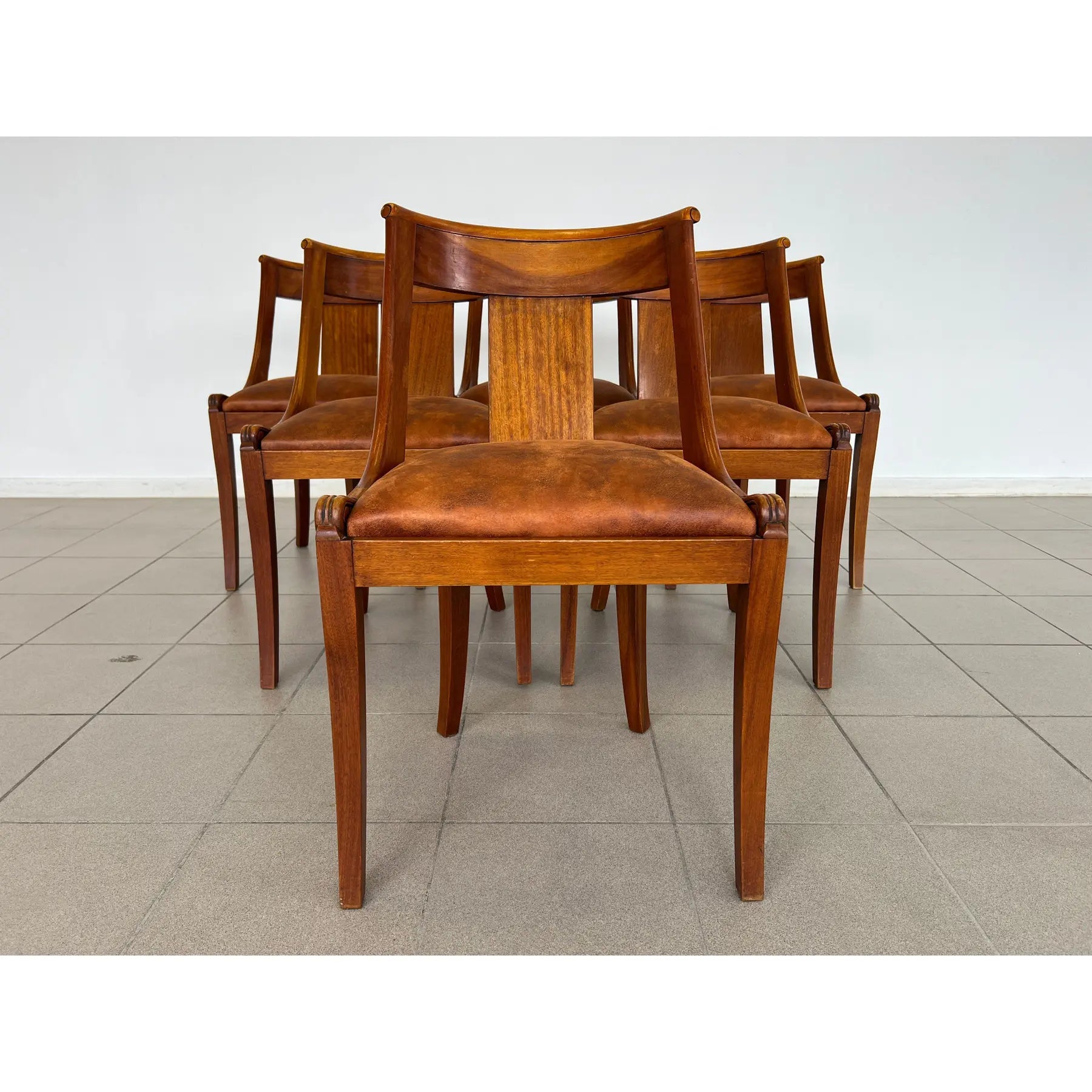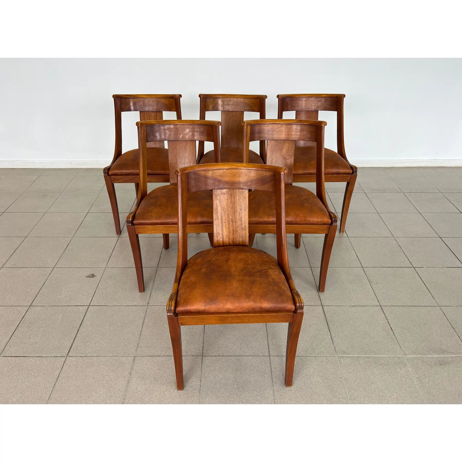 Set of 6 Swiss Vintage Empire Gondola style dining chairs. Features solid wood construction with curved slat backs, resting on saber legs. Reupholstered seats in brown fabric. Wonderful proportions and original rich and warm patina throughout.