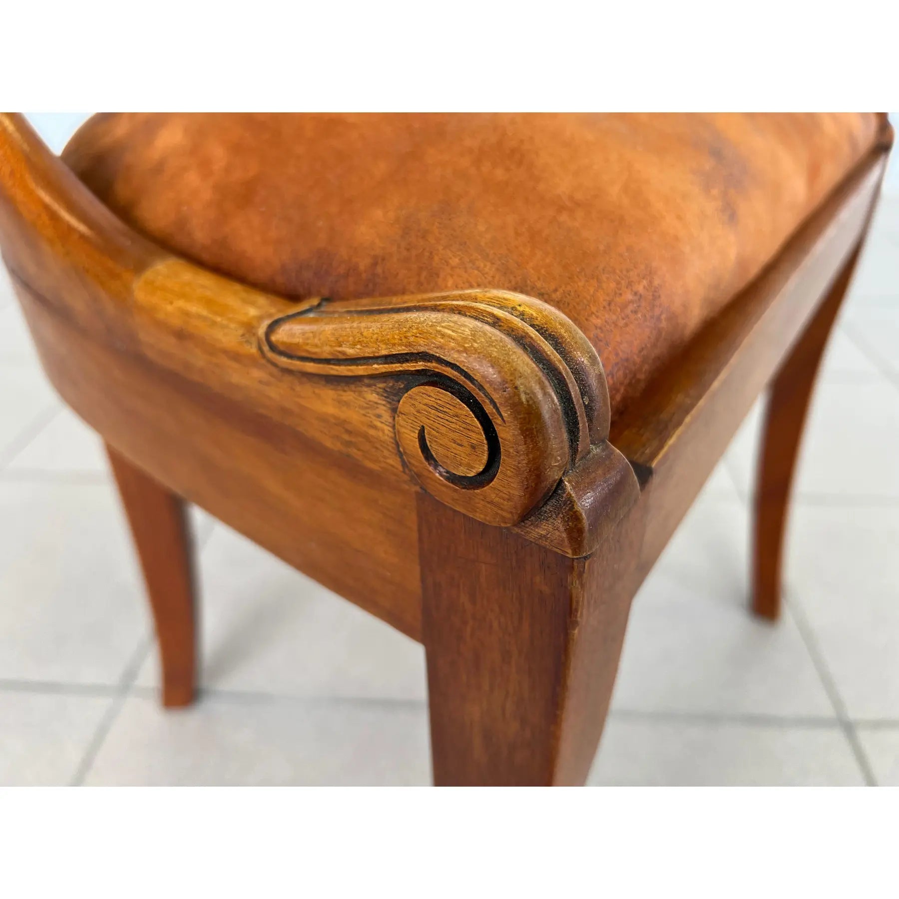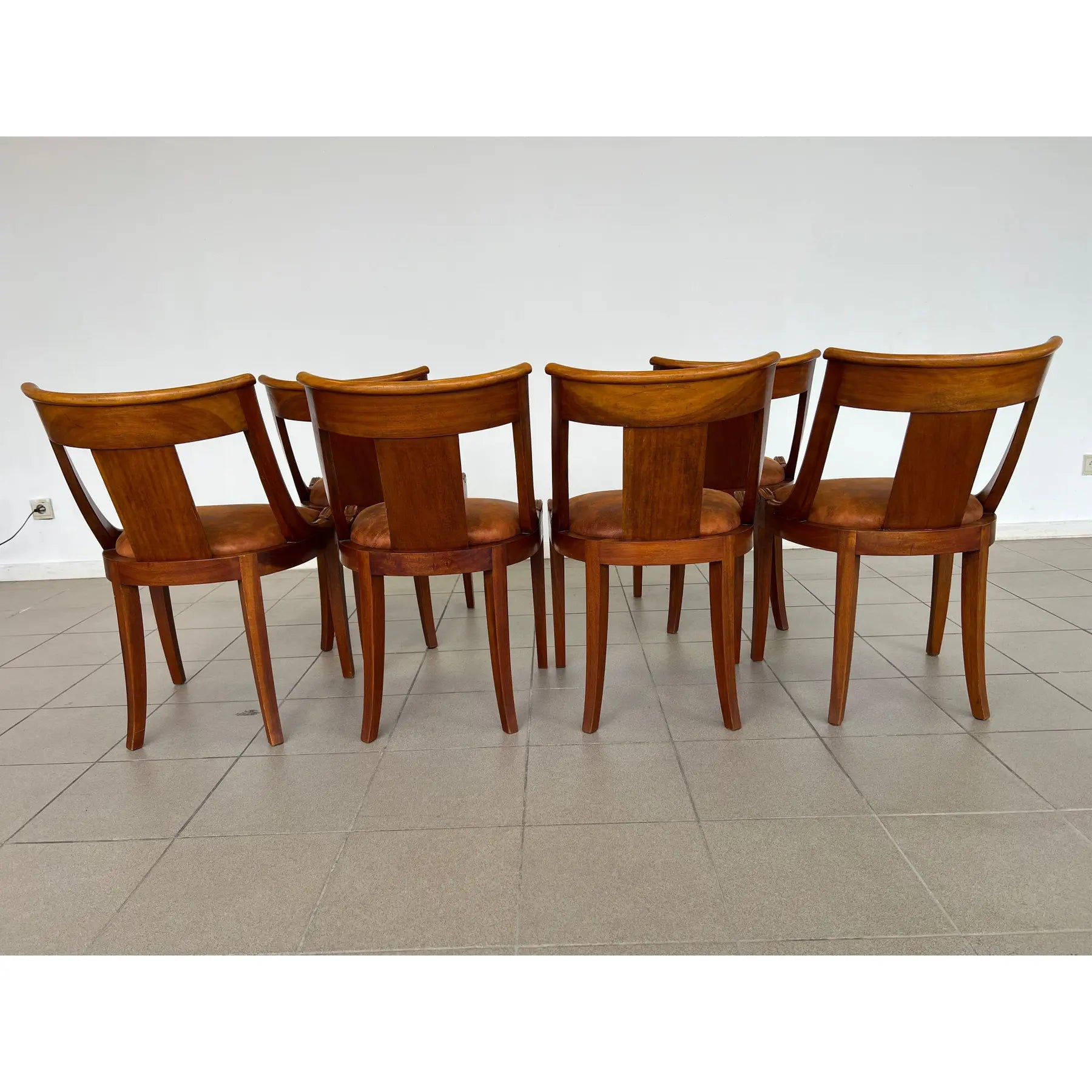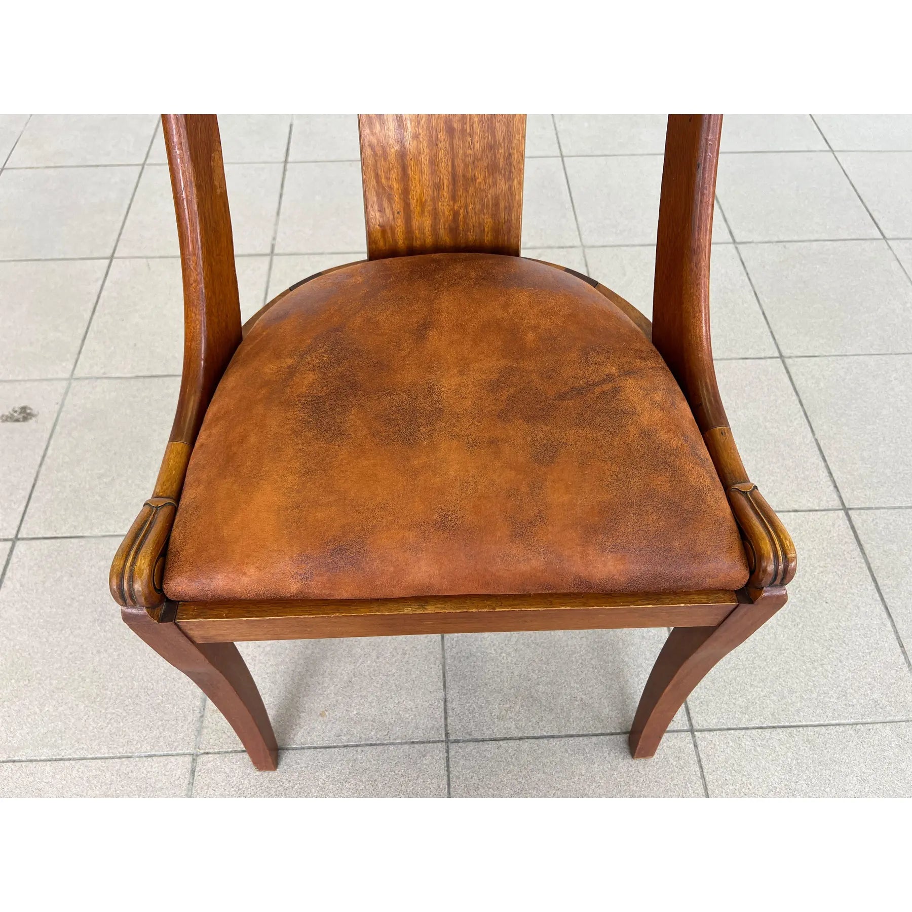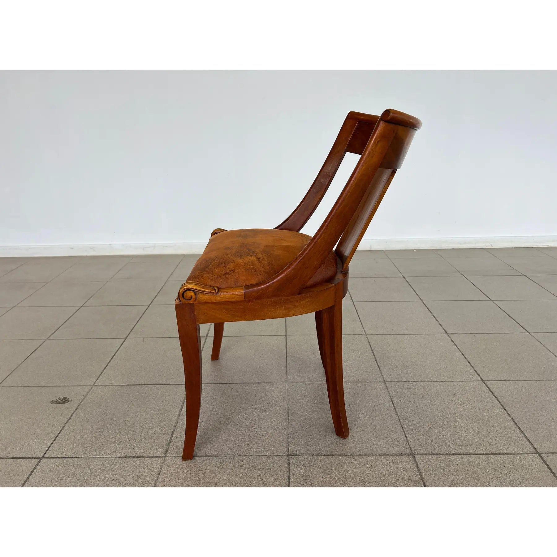 Set of 6 Swiss Vintage Empire Gondola style dining chairs. Features solid wood construction with curved slat backs, resting on saber legs. Reupholstered seats in brown fabric. Wonderful proportions and original rich and warm patina throughout.