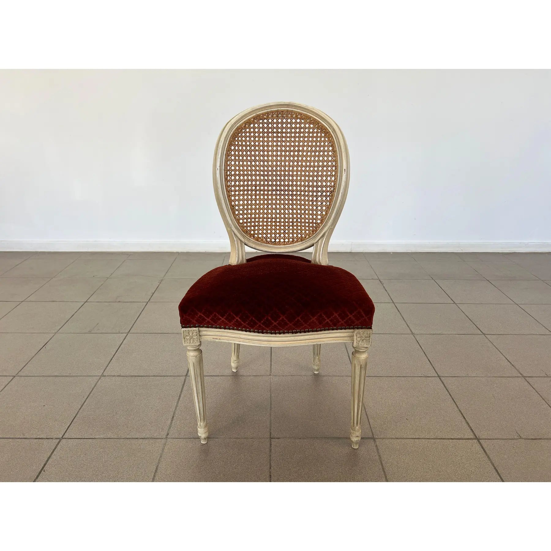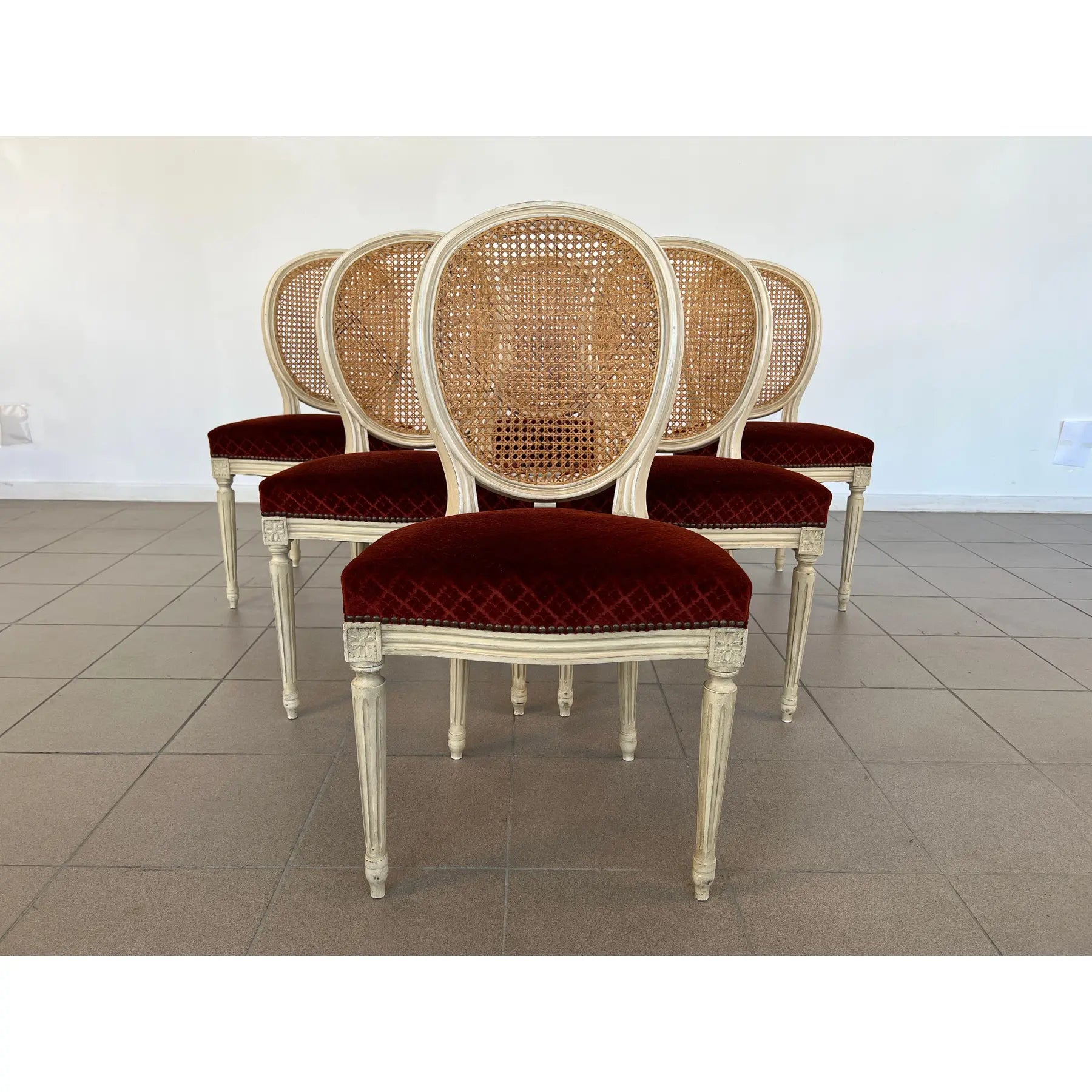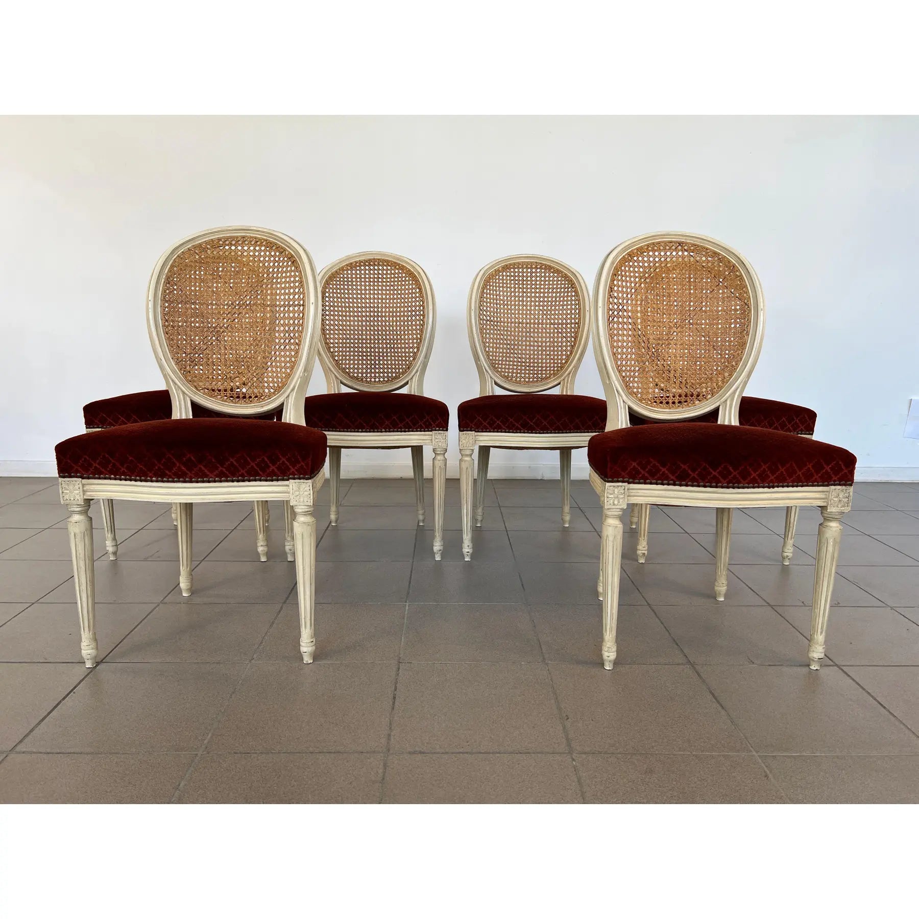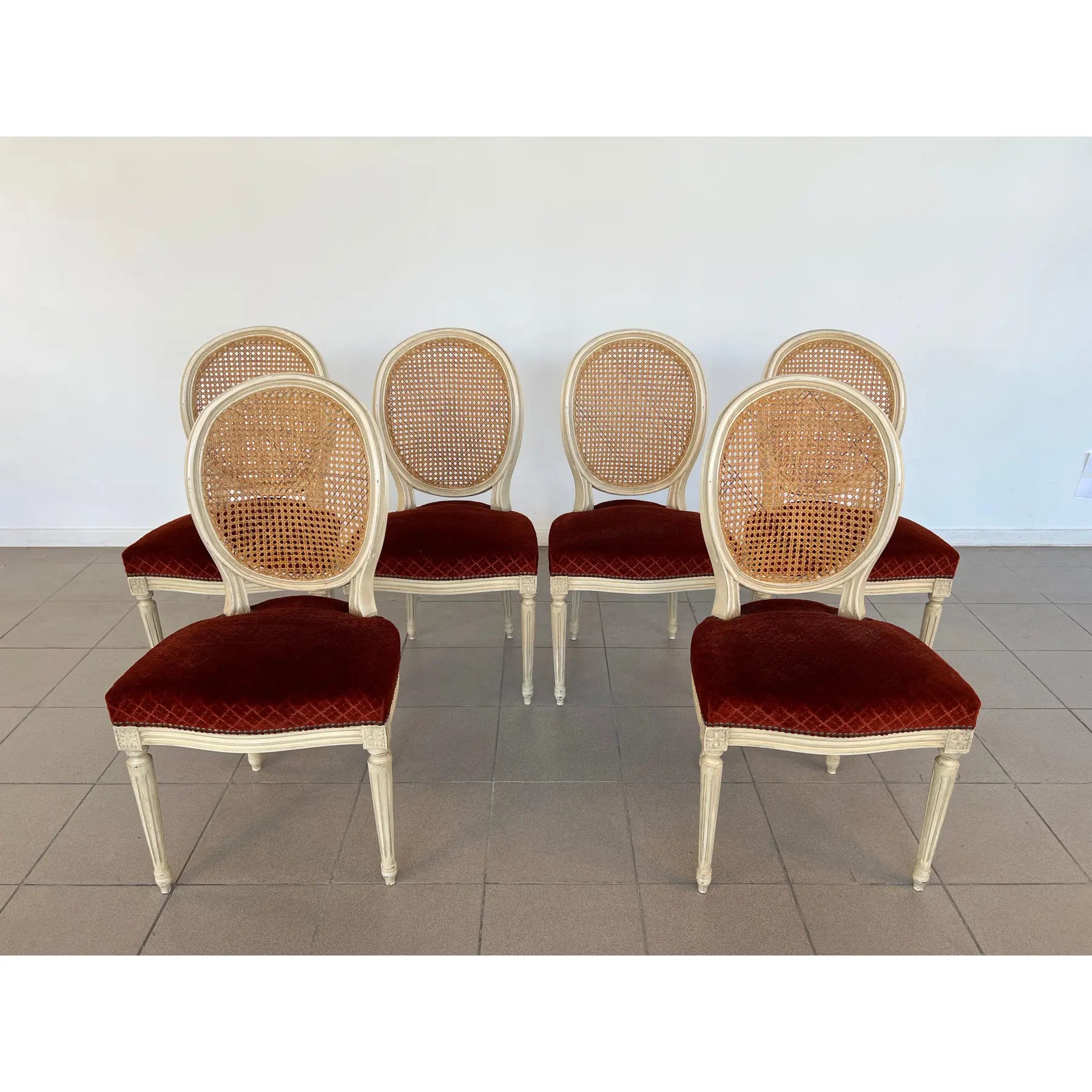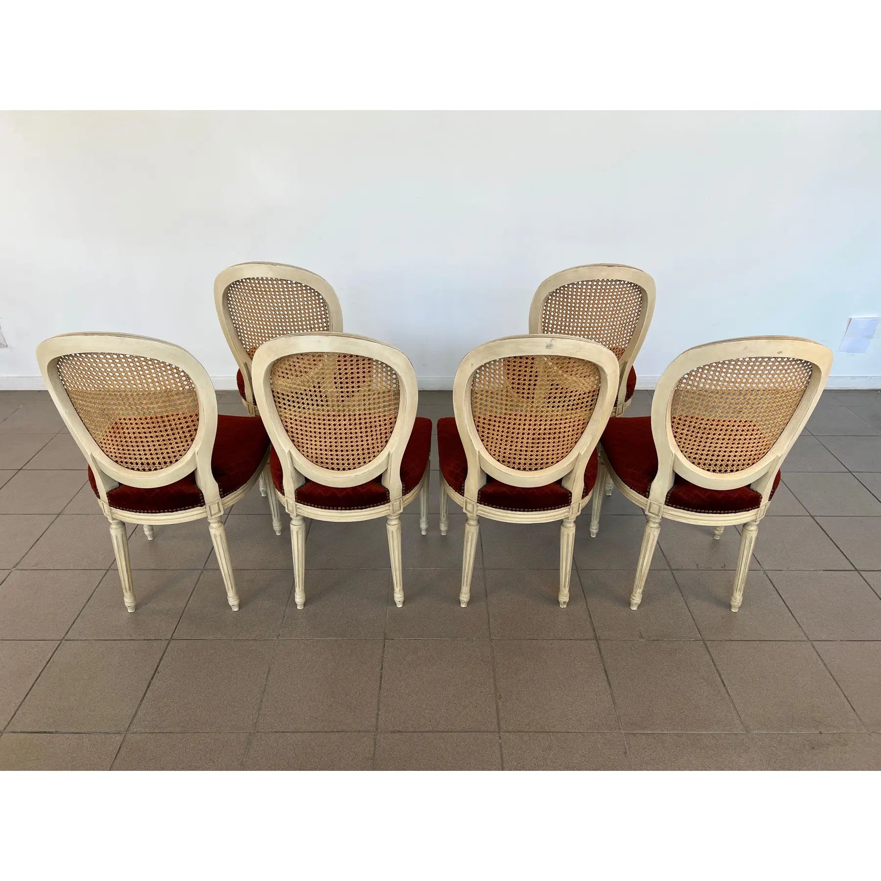 Set of 6 French Louis XVI style oval/medallion cane back dining chairs with original dark red upholstery with nail trim accent. Painted in antique white color. Amazing design and quality craftsmanship. A wonderful addition to your interior.
