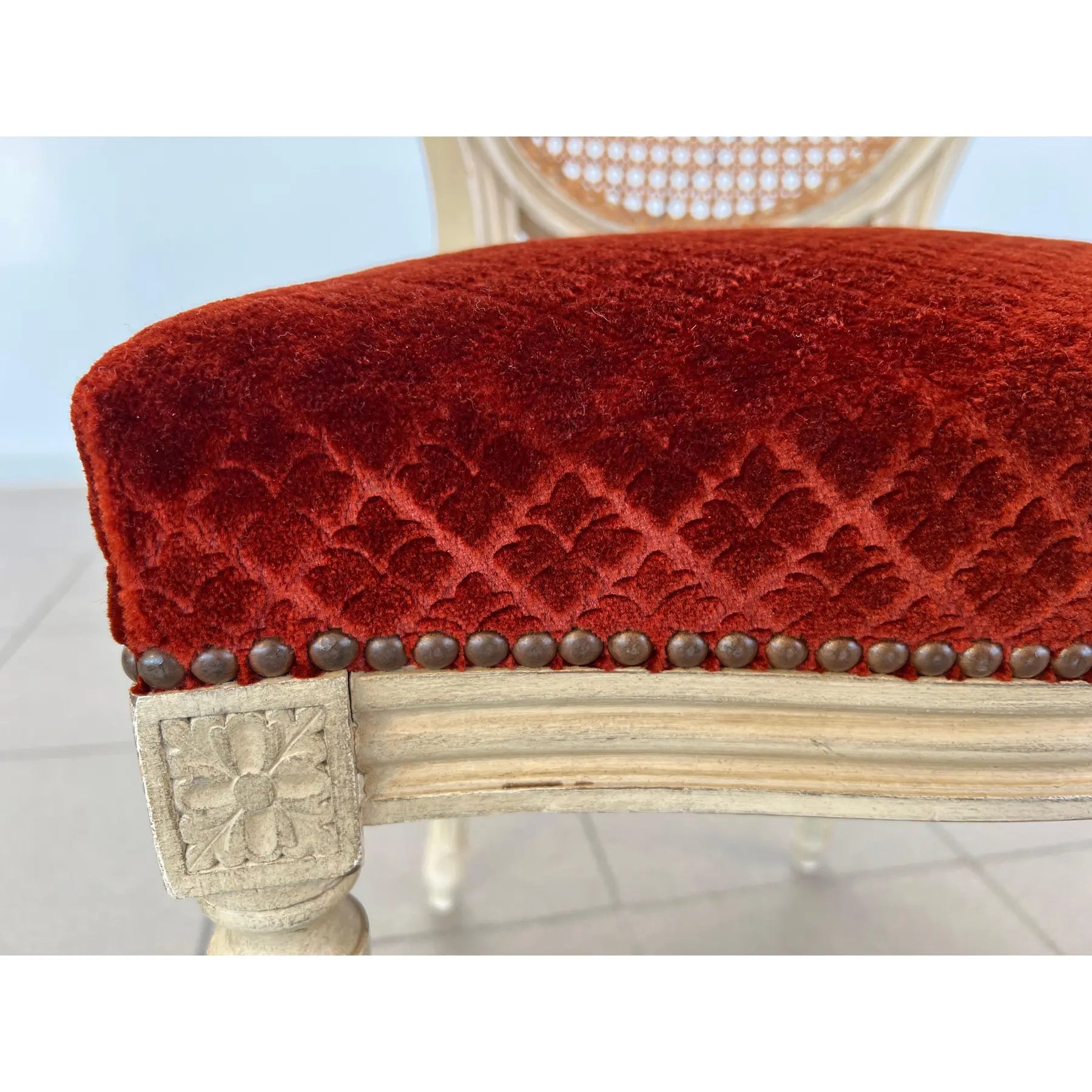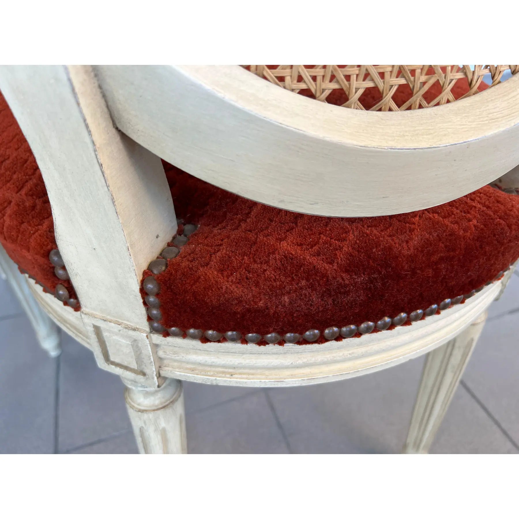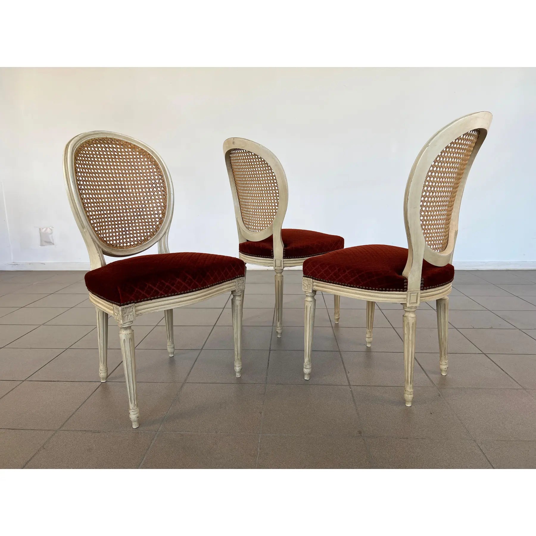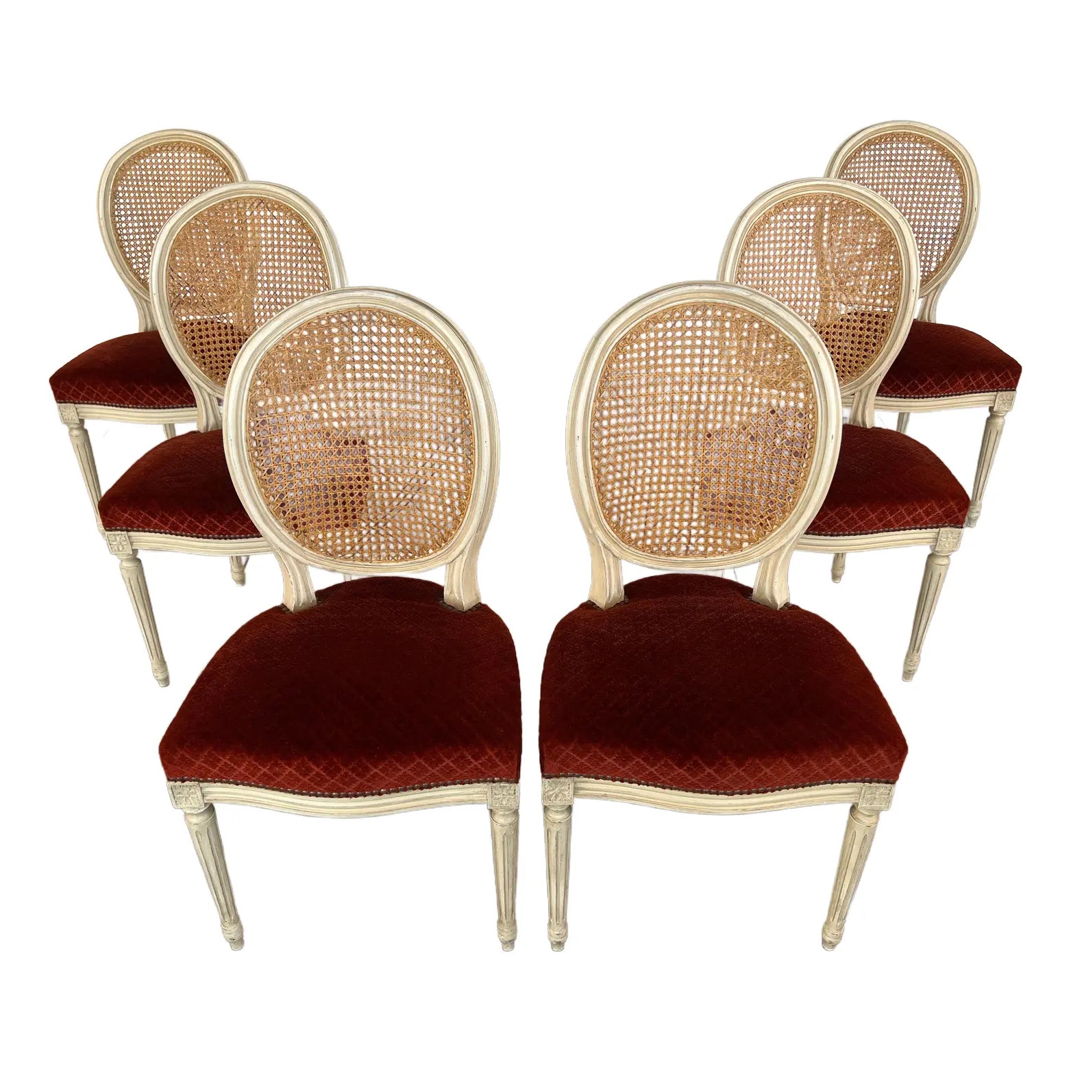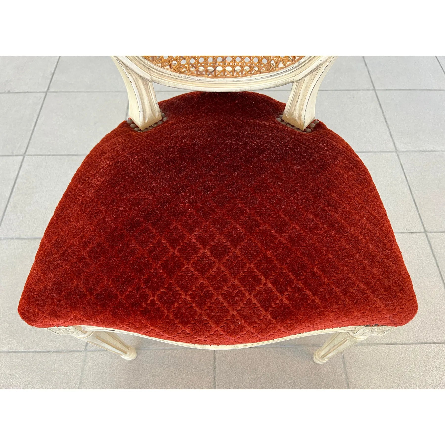 Set of 6 French Louis XVI style oval/medallion cane back dining chairs with original dark red upholstery with nail trim accent. Painted in antique white color. Amazing design and quality craftsmanship. A wonderful addition to your interior.