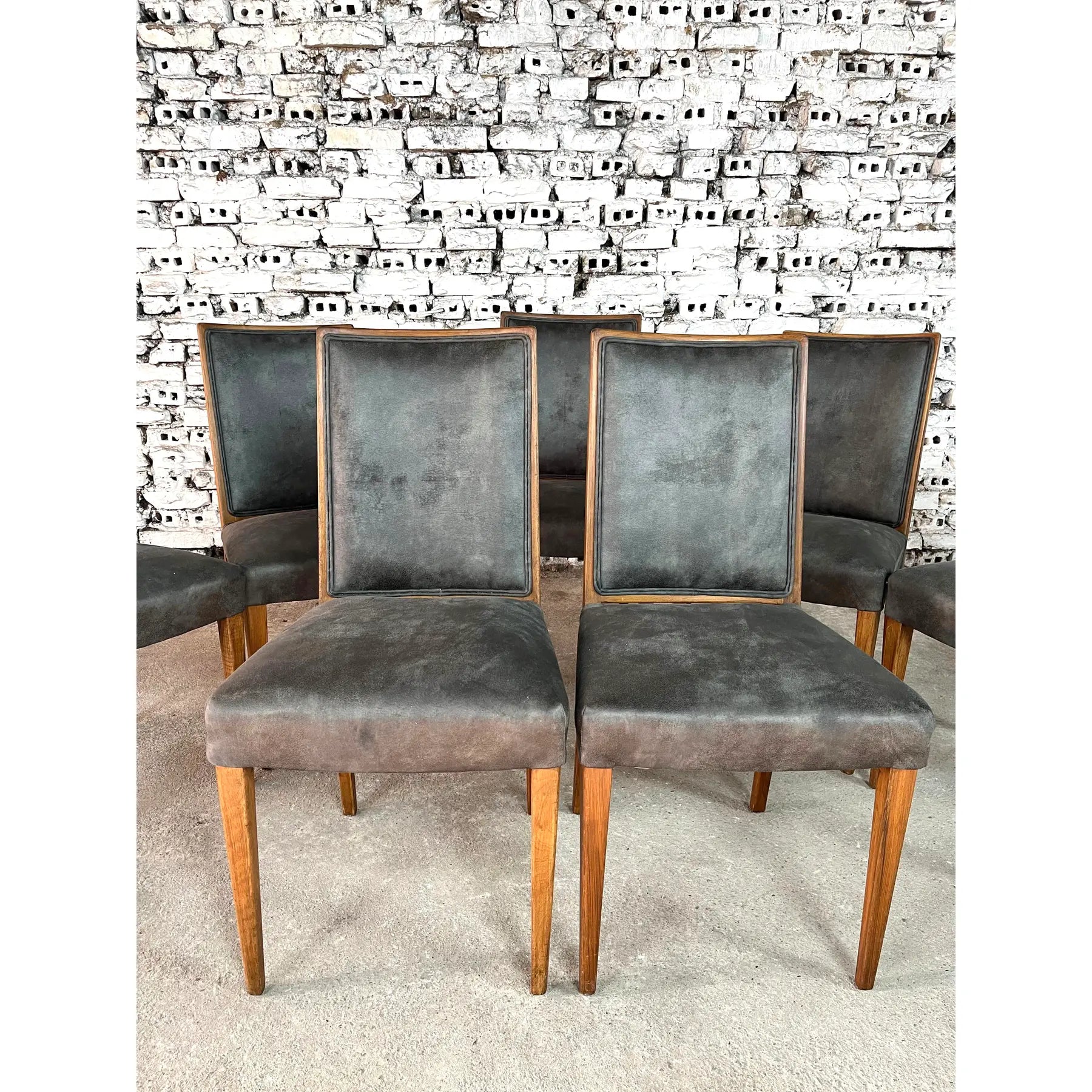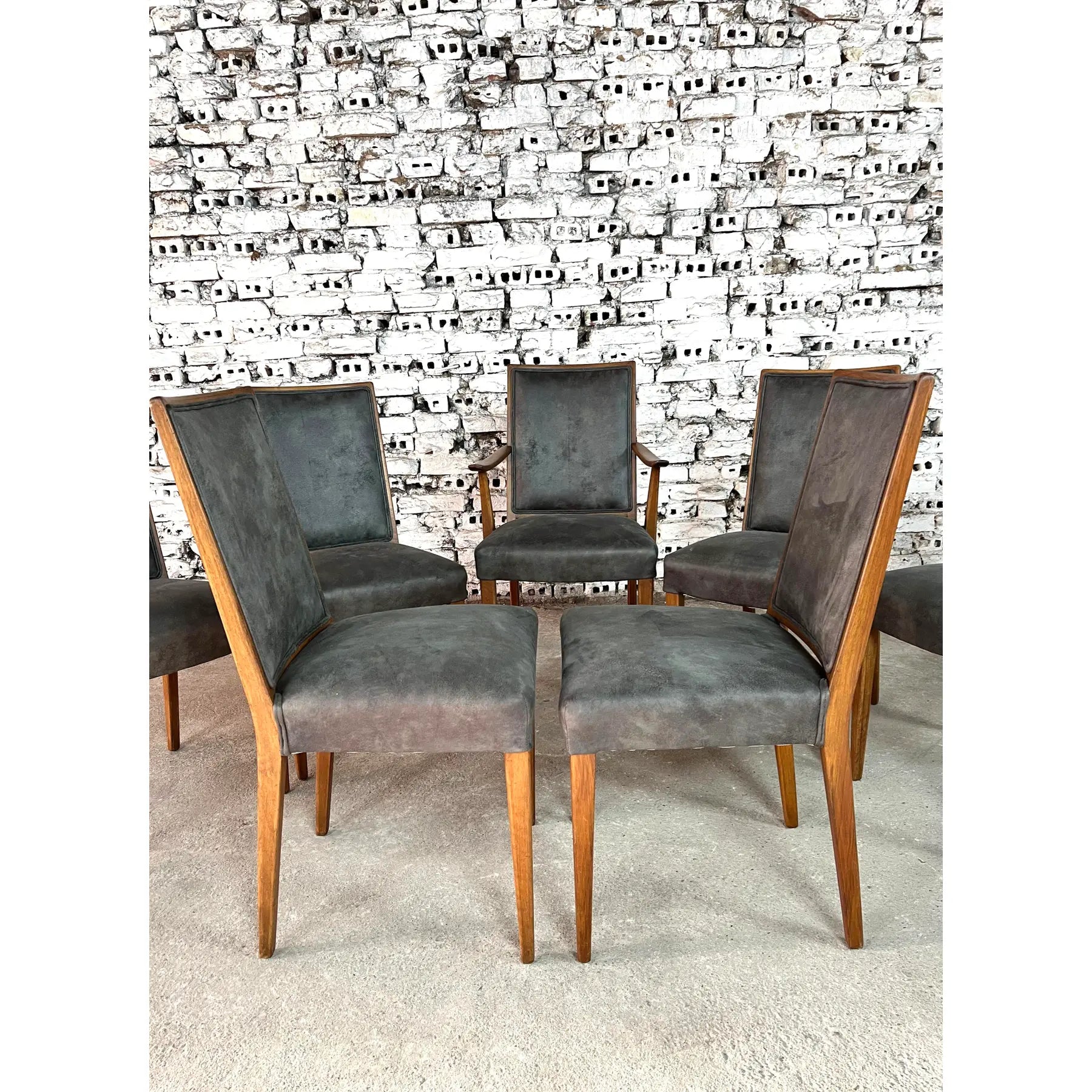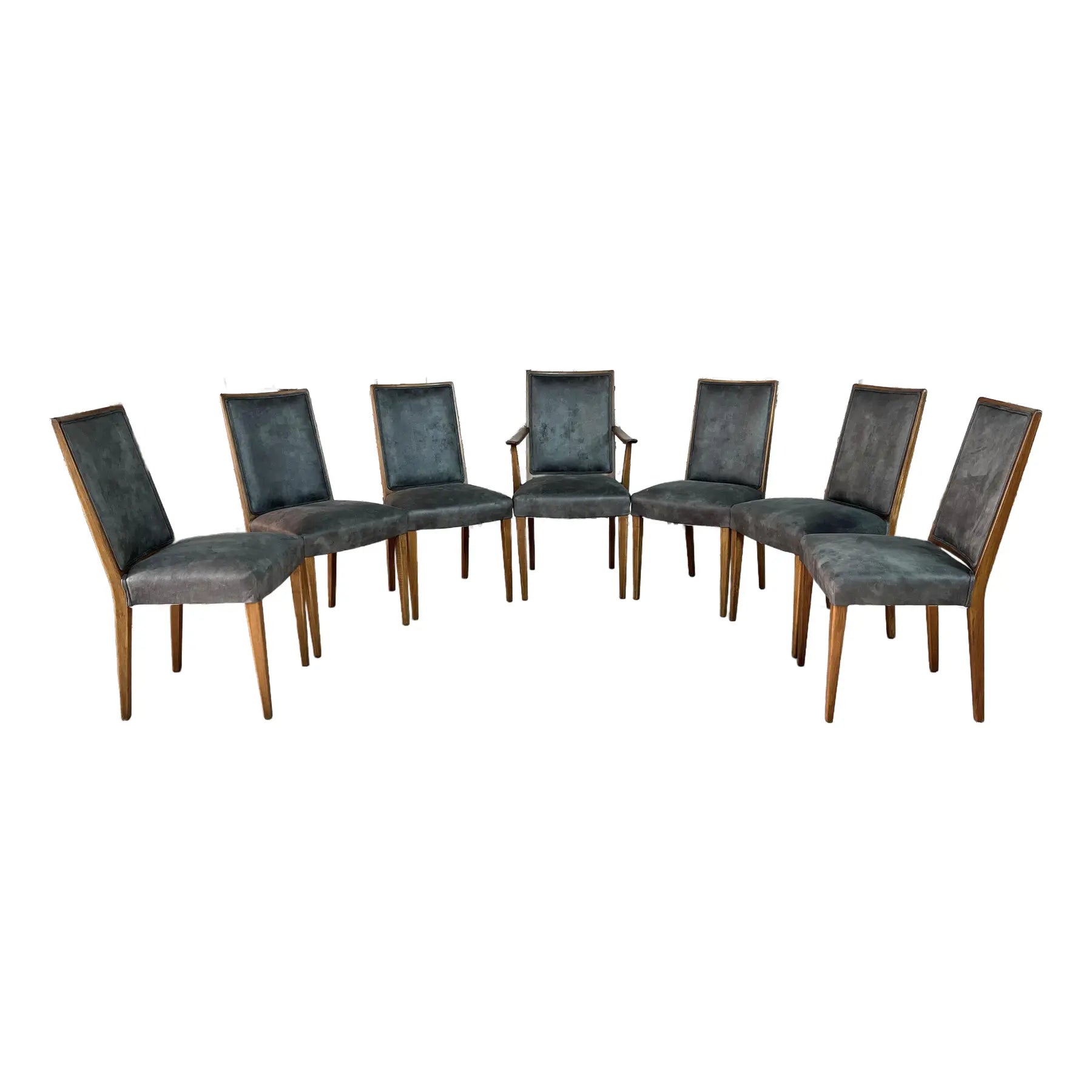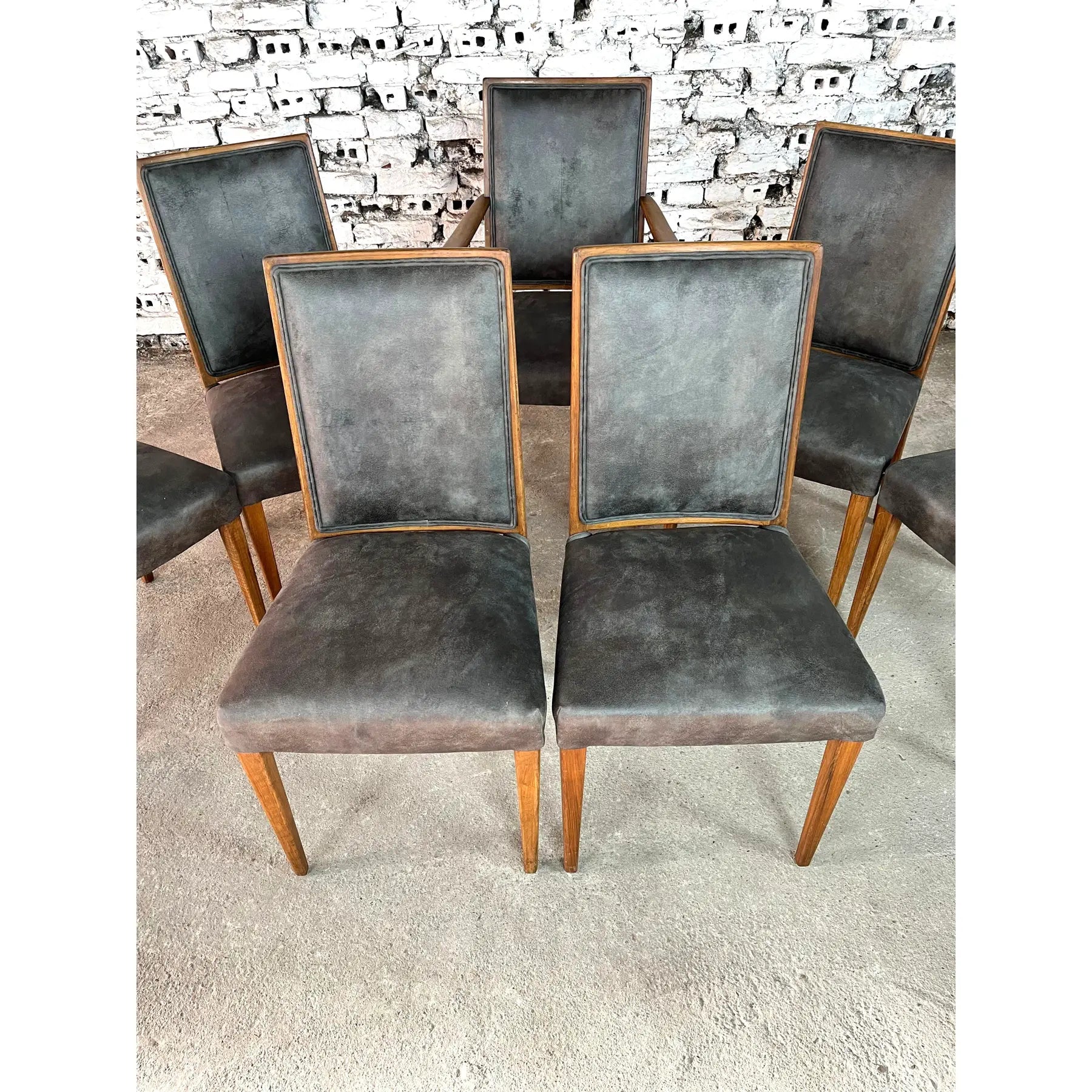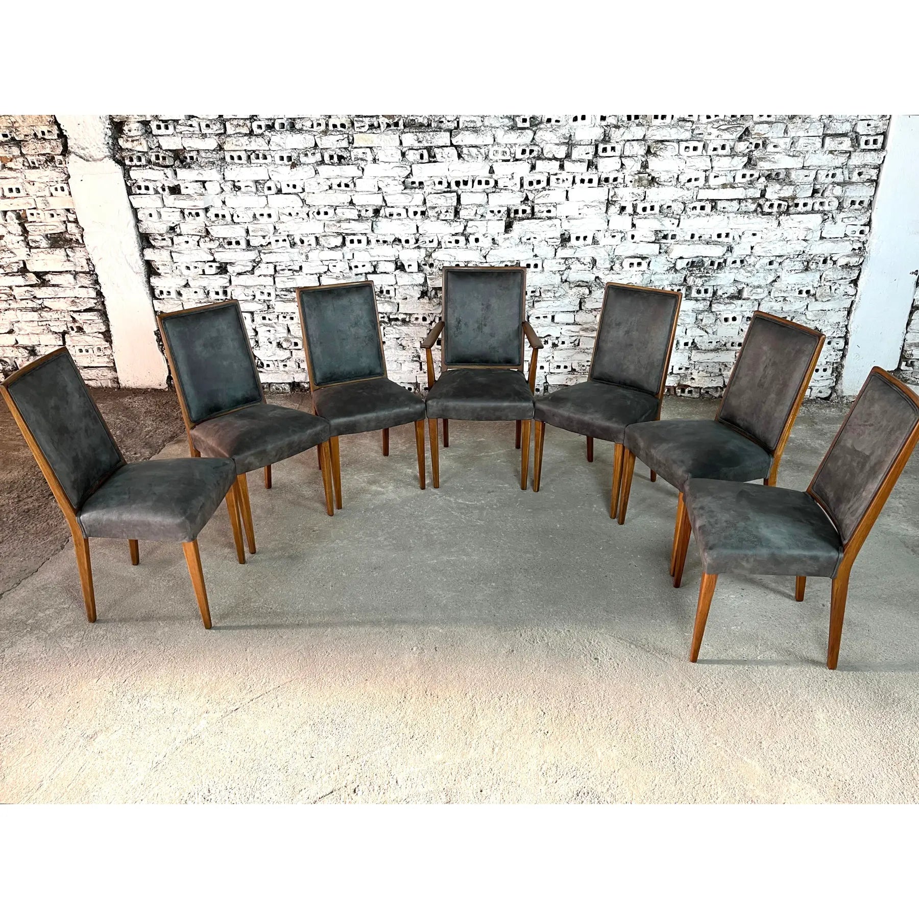 Set of 7 French Art Deco Dining Chairs. Newly upholstered in dark grey fabric. One of the chairs is with curved armrests. Solid oak frame. Comfortable and stylish set.