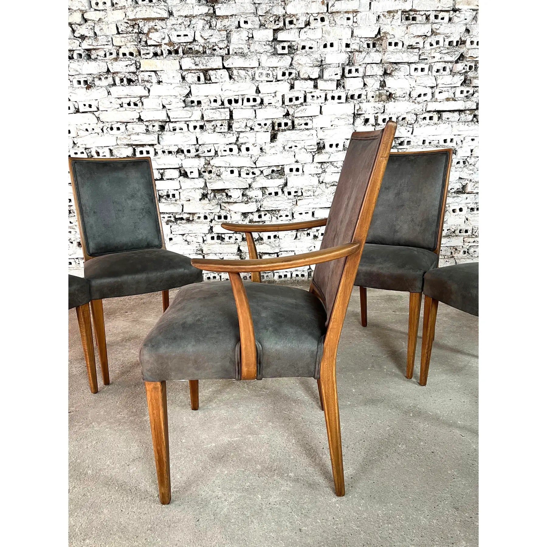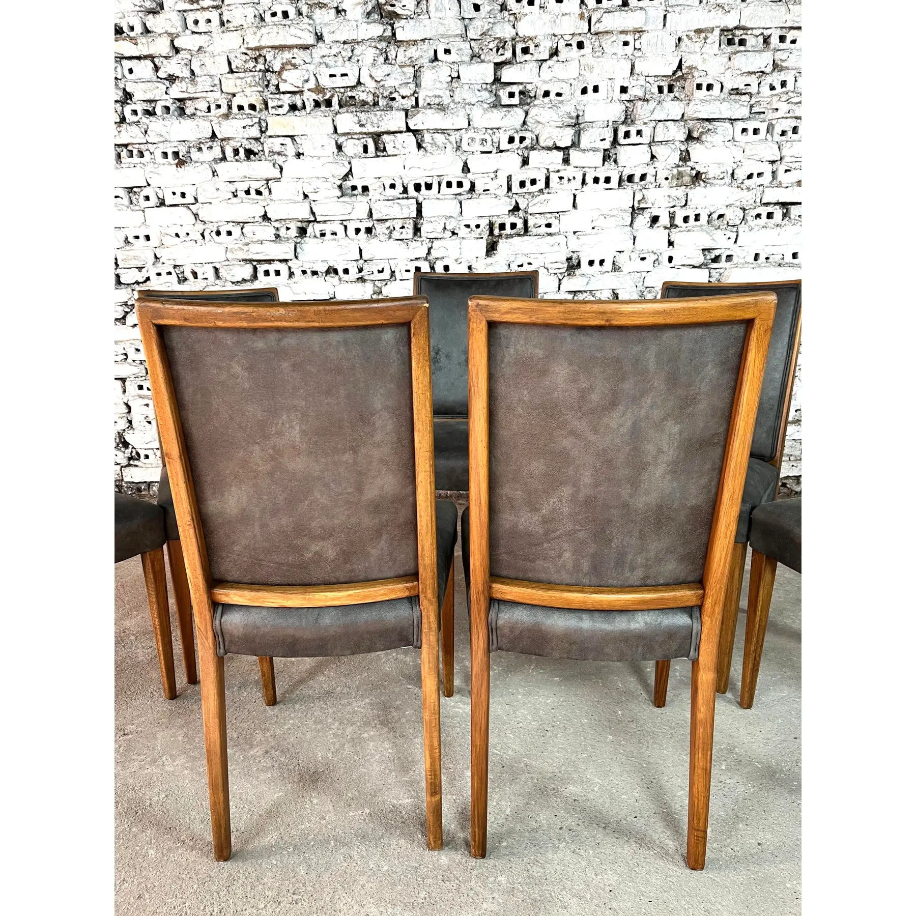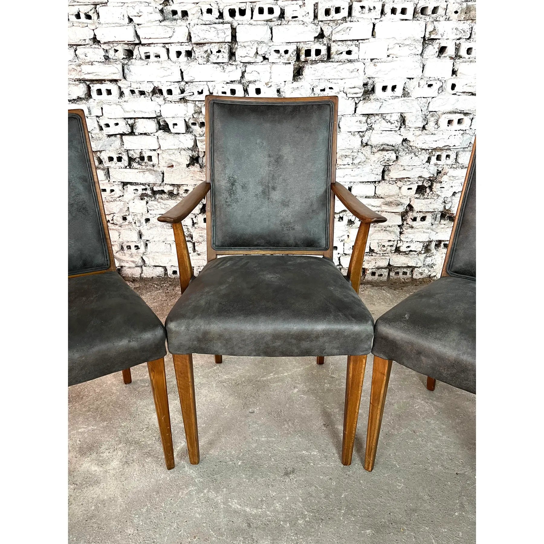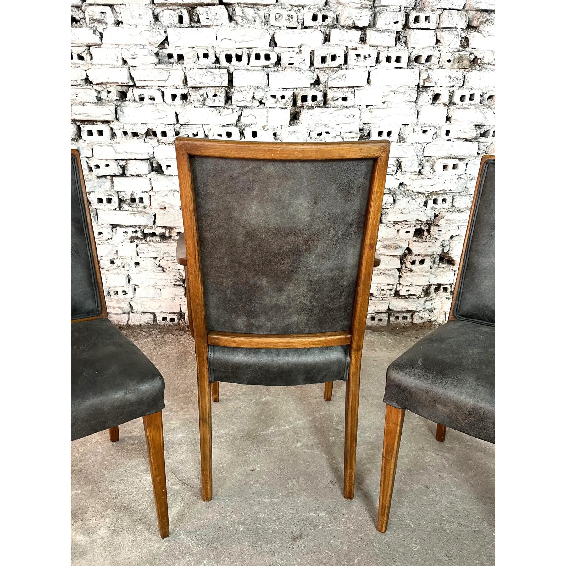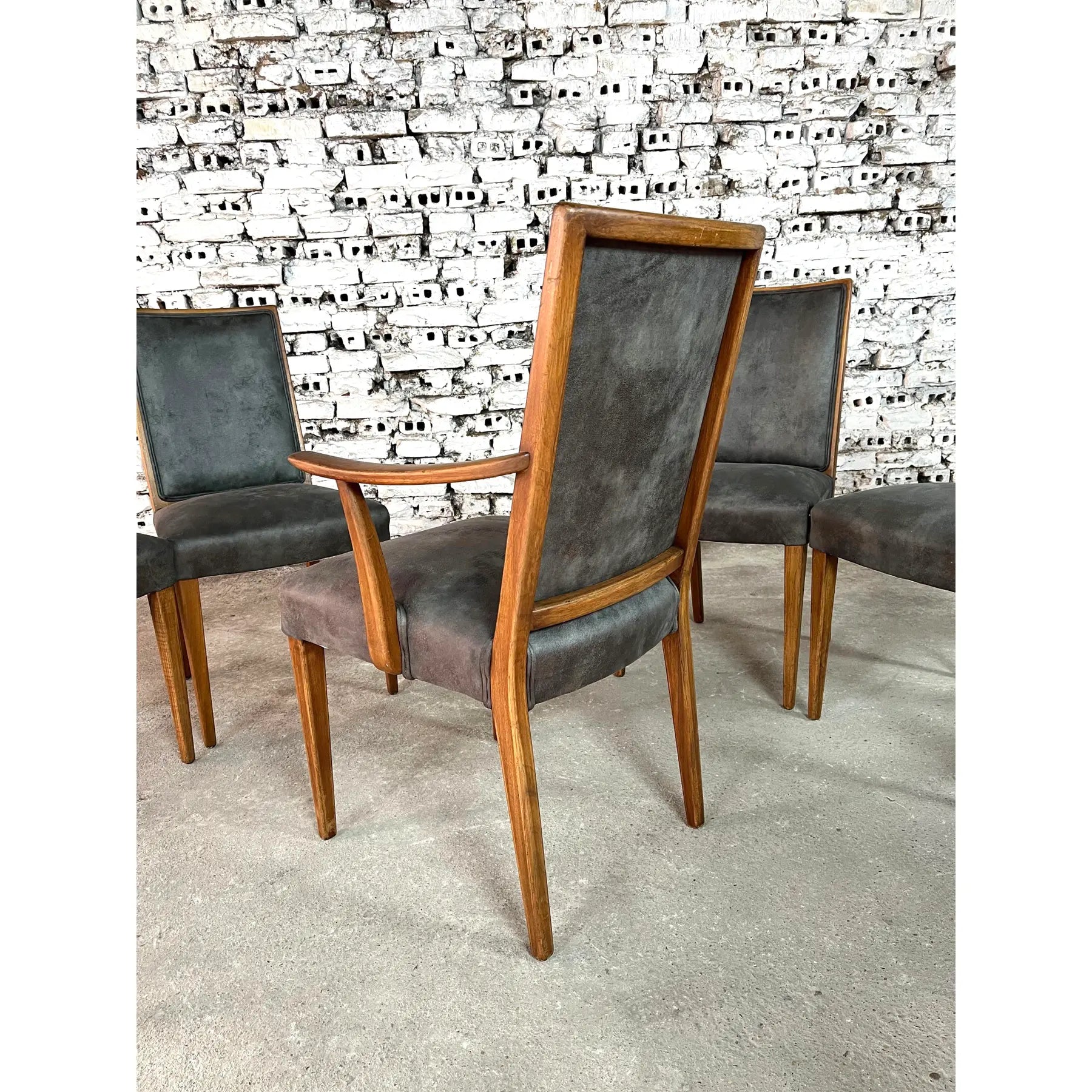 Set of 7 French Art Deco Dining Chairs. Newly upholstered in dark grey fabric. One of the chairs is with curved armrests. Solid oak frame. Comfortable and stylish set.