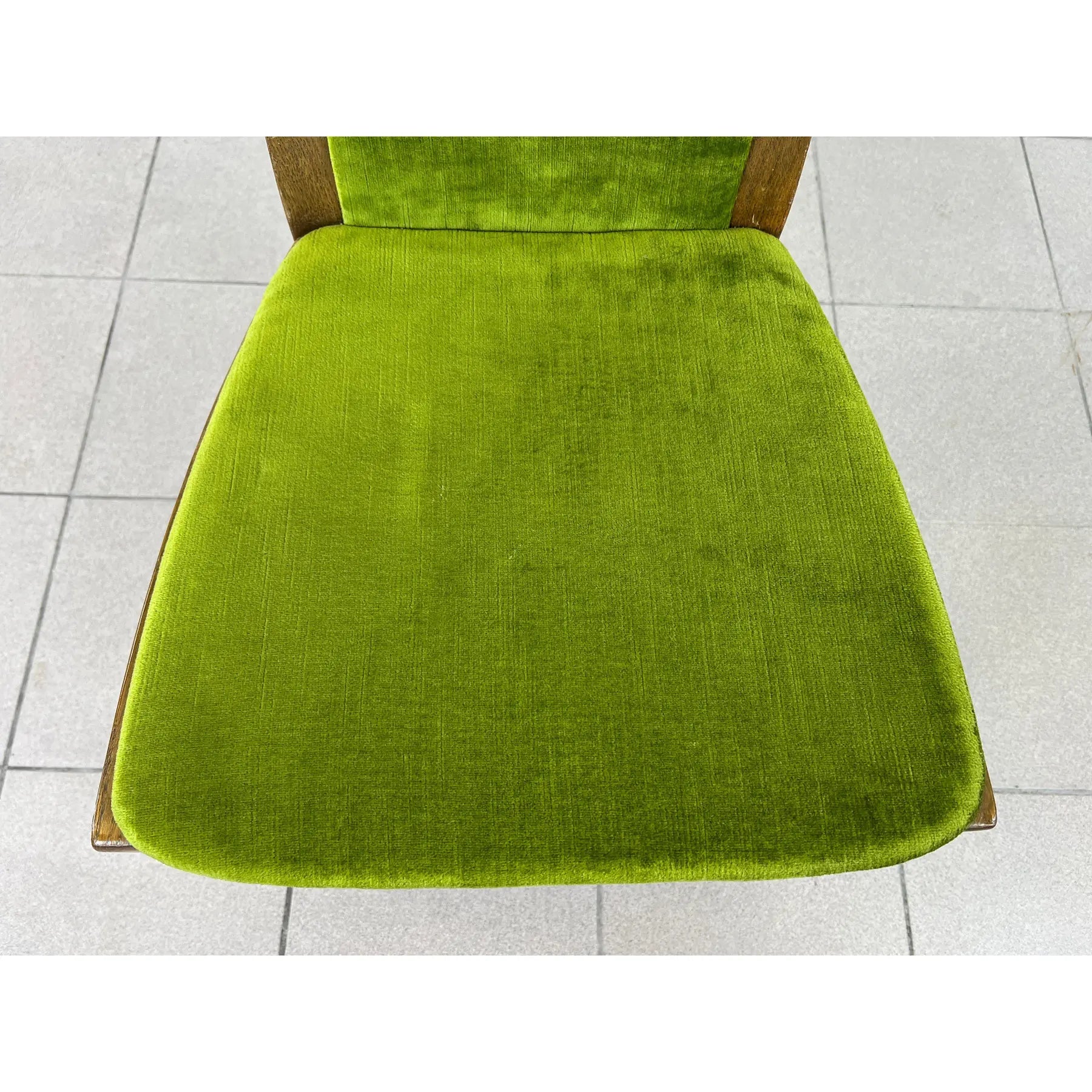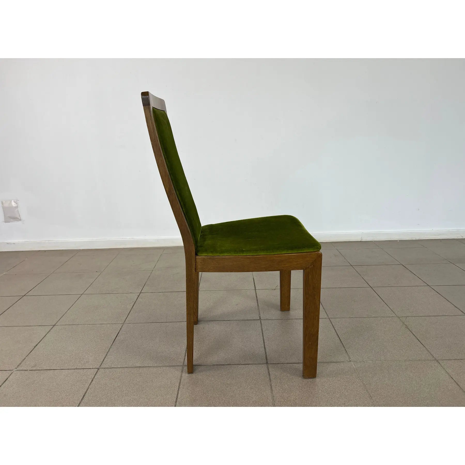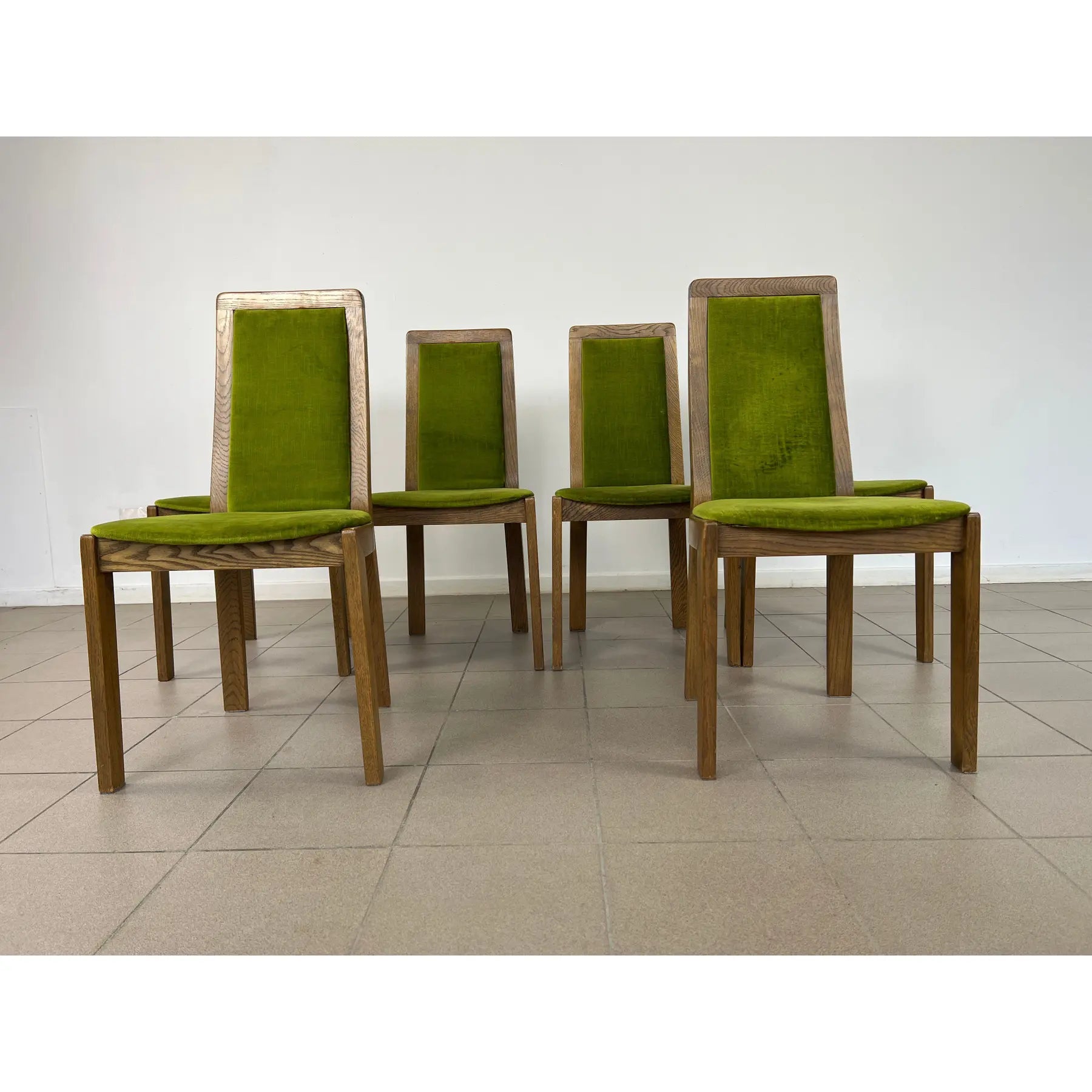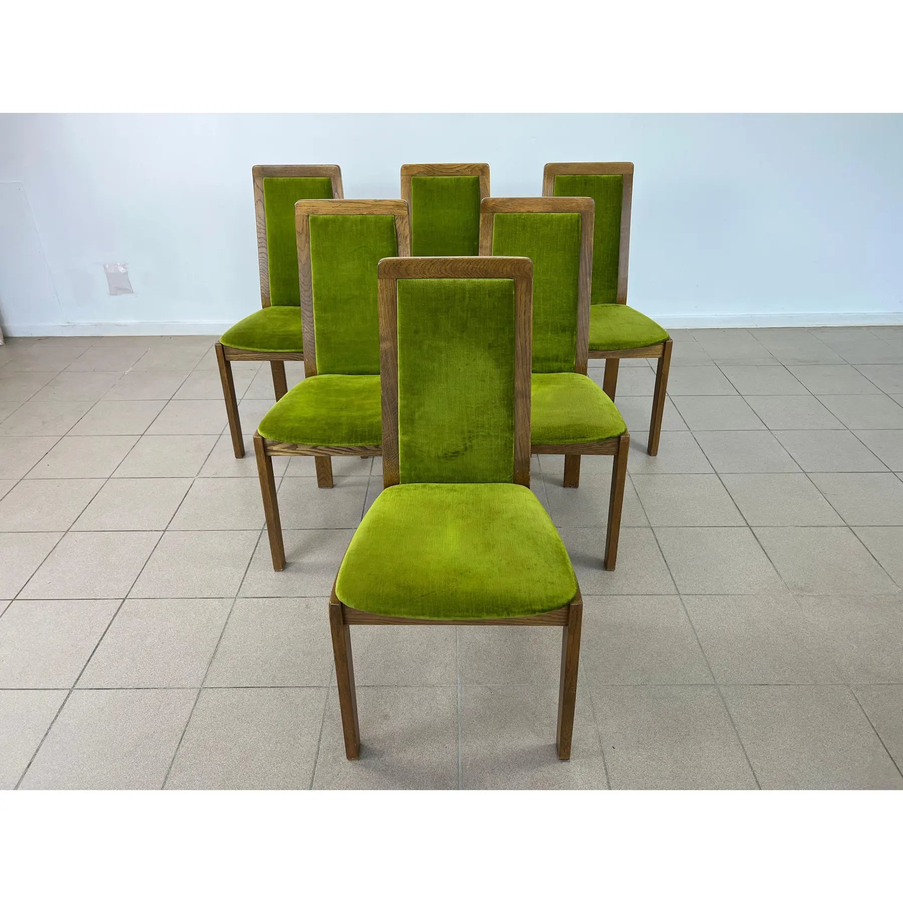 Set of 6 Mid-Century Modern Scandinavian dining chairs with high backs. Upholstered in original green mohair type fabric. Solid wood frames and legs. The chairs have straight, brutalist clean lines typical of mid-century design. A wonderful addition to your interior.