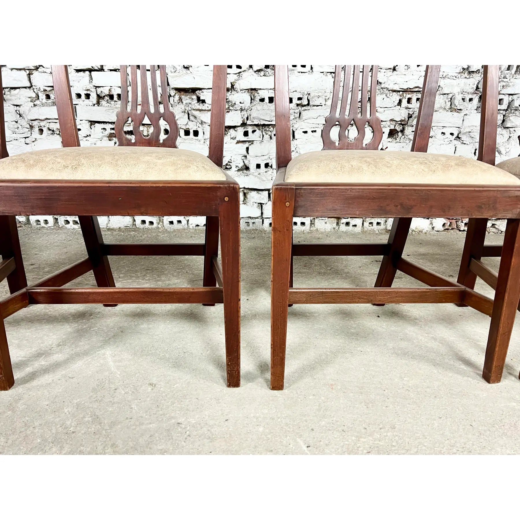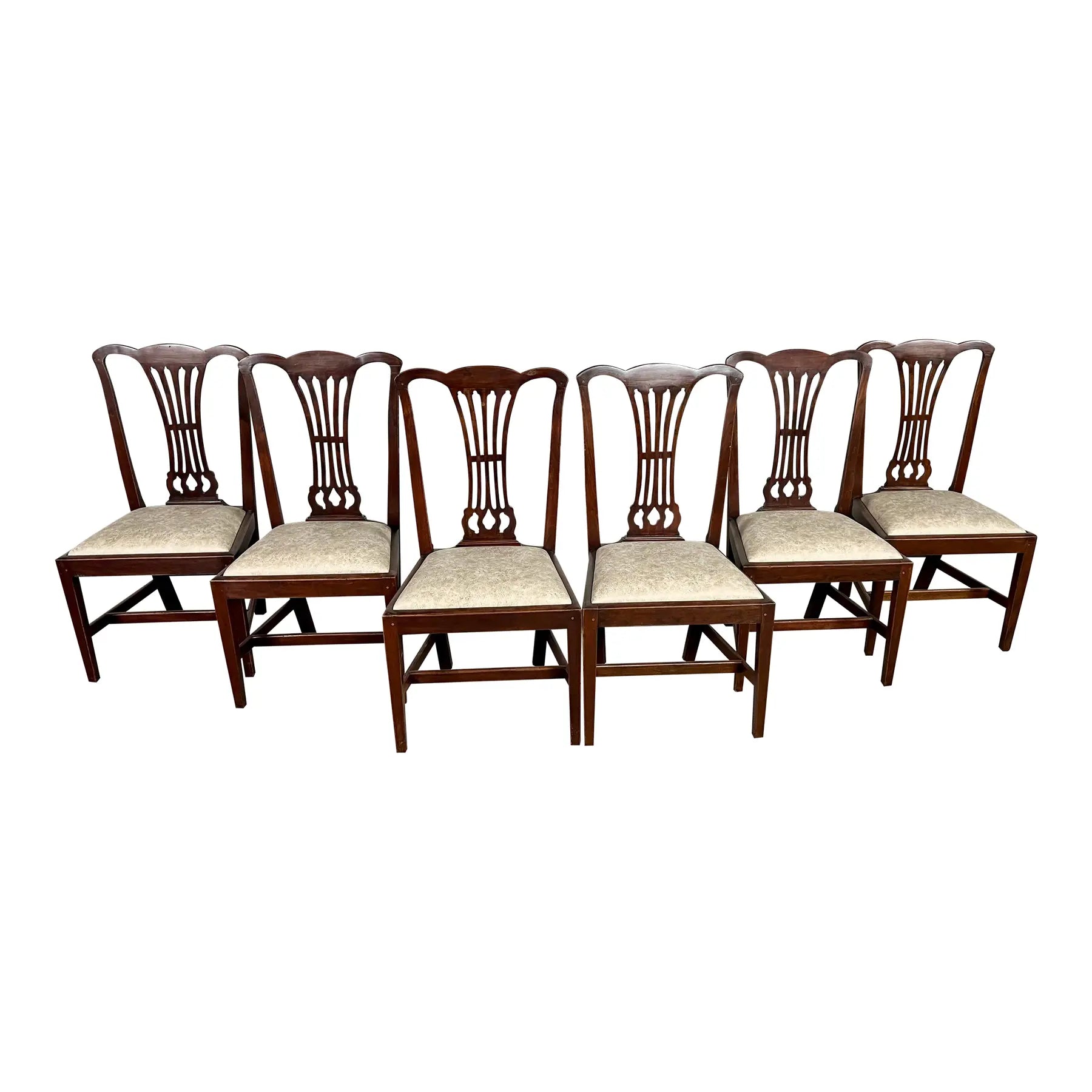 Solid carved mahogany frames with shaped crest rails and pierced backsplats with ivory leather upholstered seats. Lovely decoratively carved backs. Their design was inspired by the early English Chippendale style straight leg dining chairs from the Georgian period. The set includes 8 regular dining chairs + 1 armchair.
