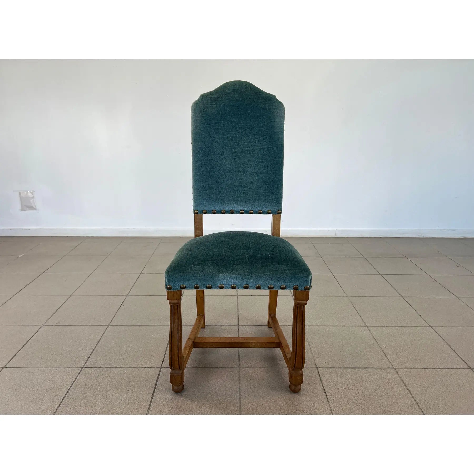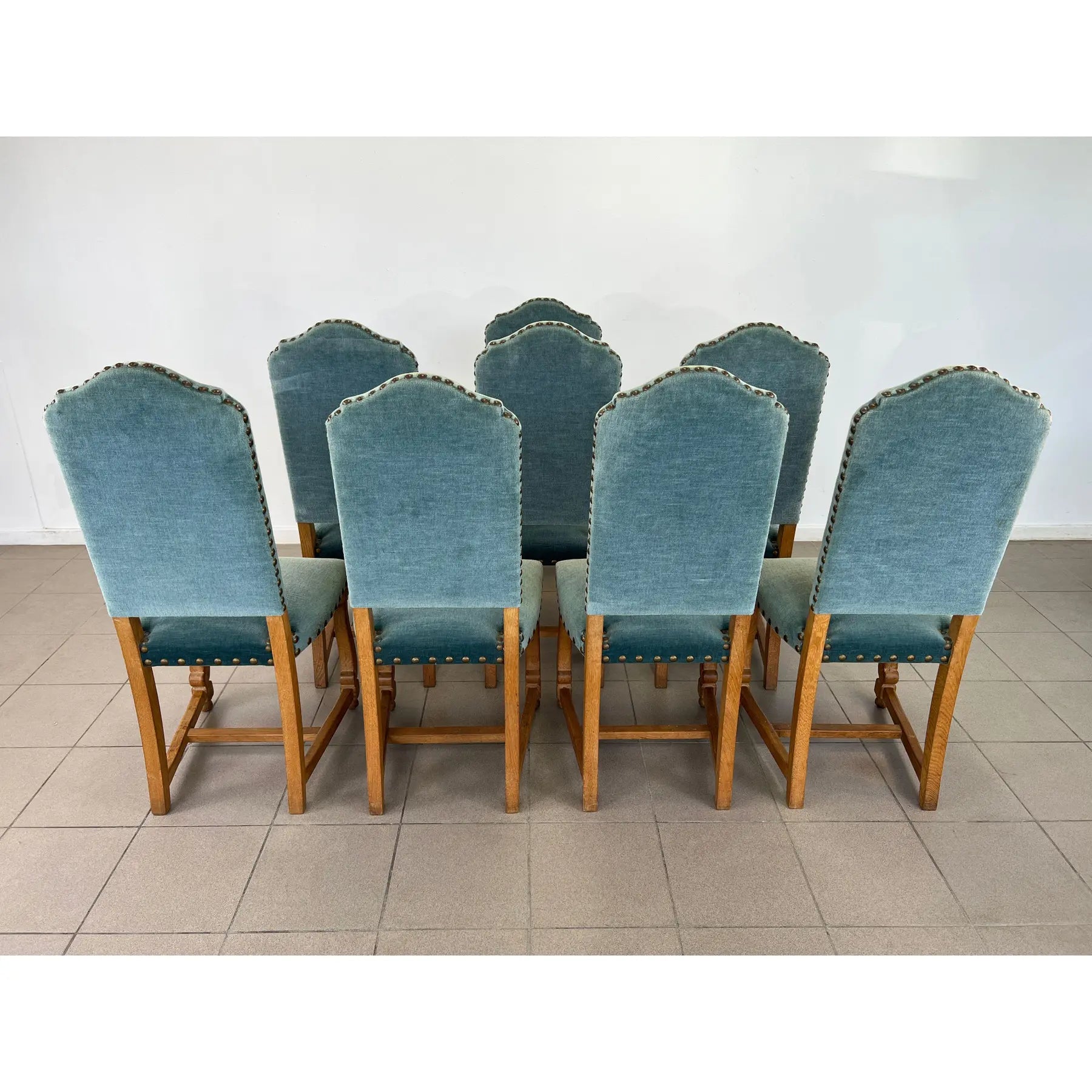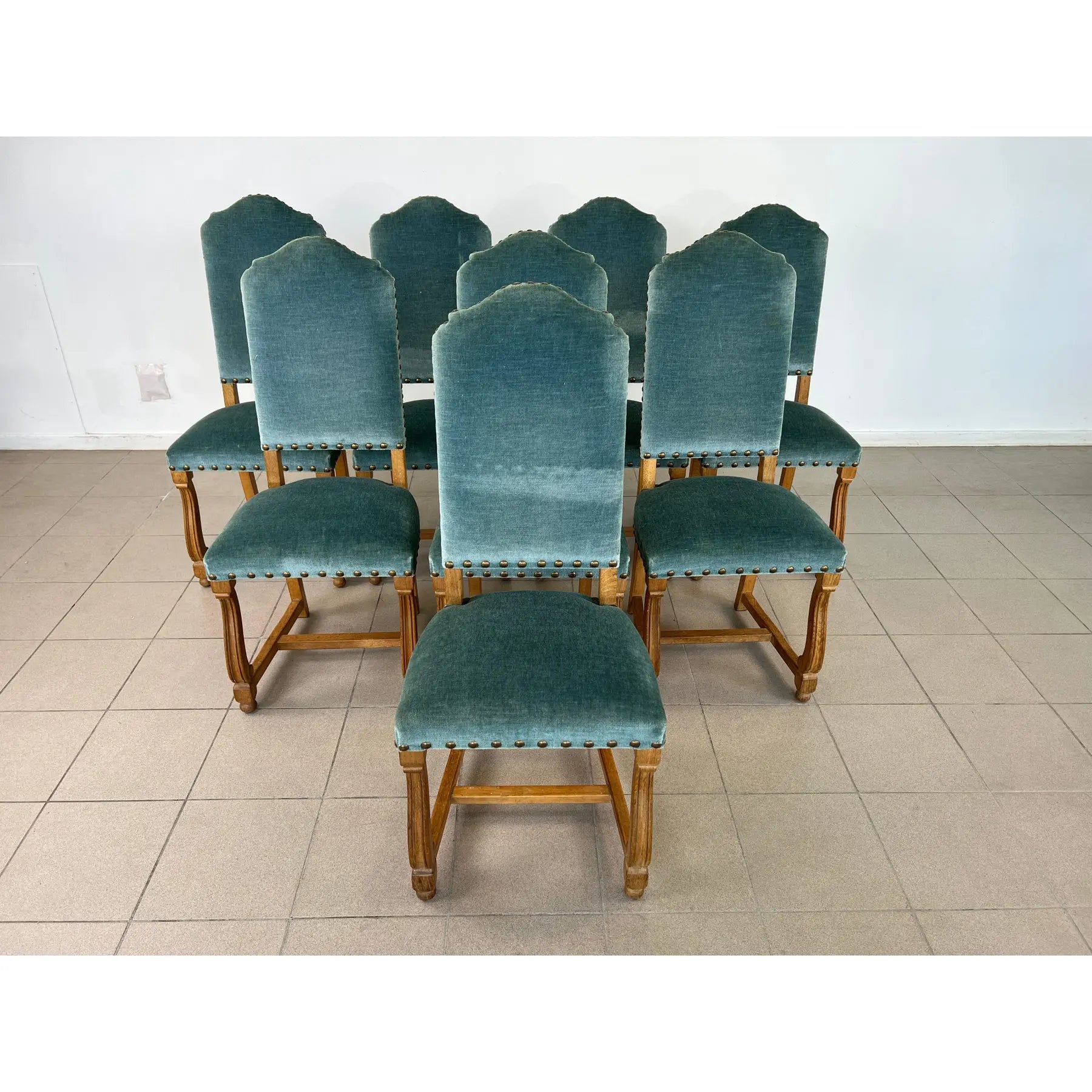 Vintage set of 8 Classic French Louis XIII Dining chairs with original blue fabric with nail trim finish. Comfortable high backs with wooden carved legs.