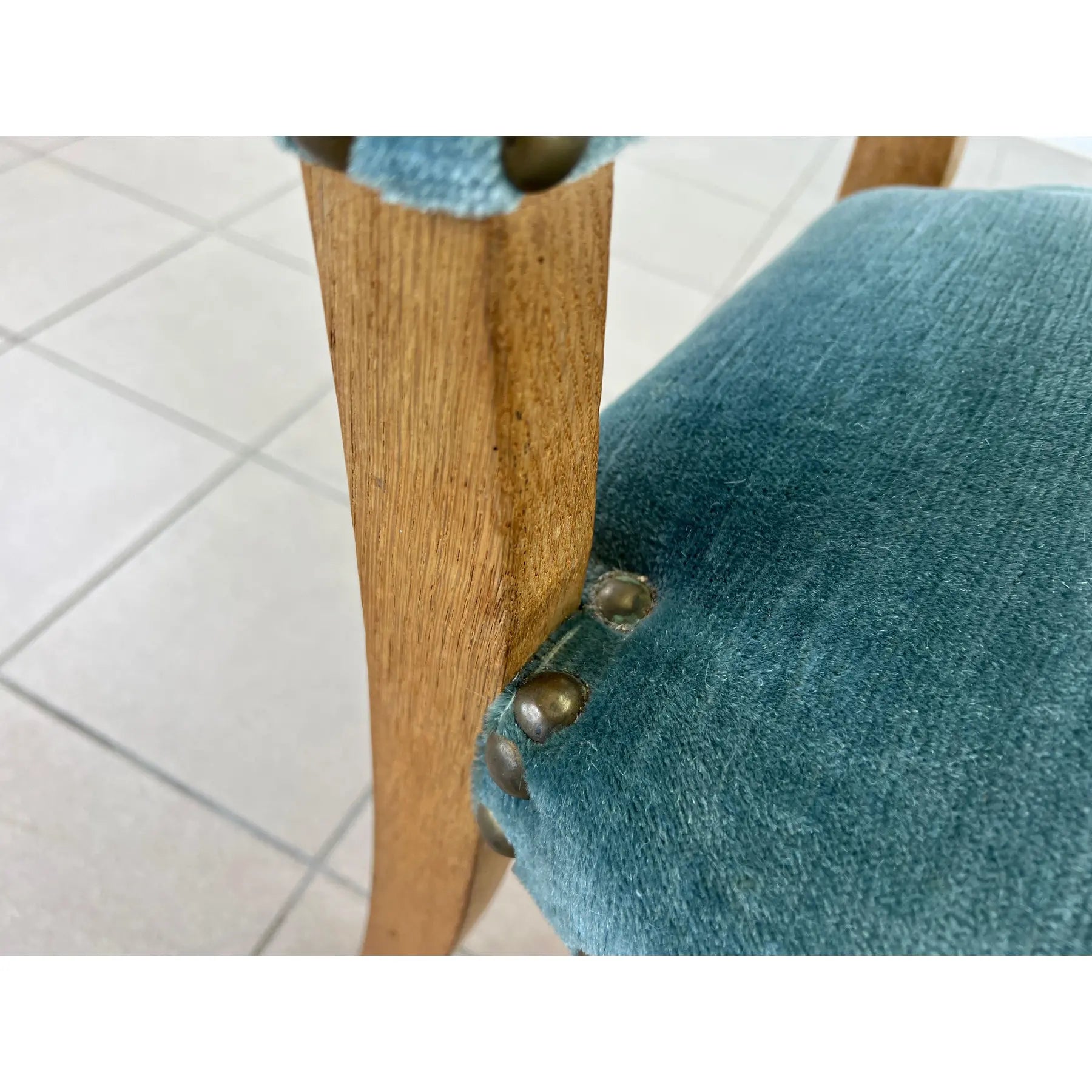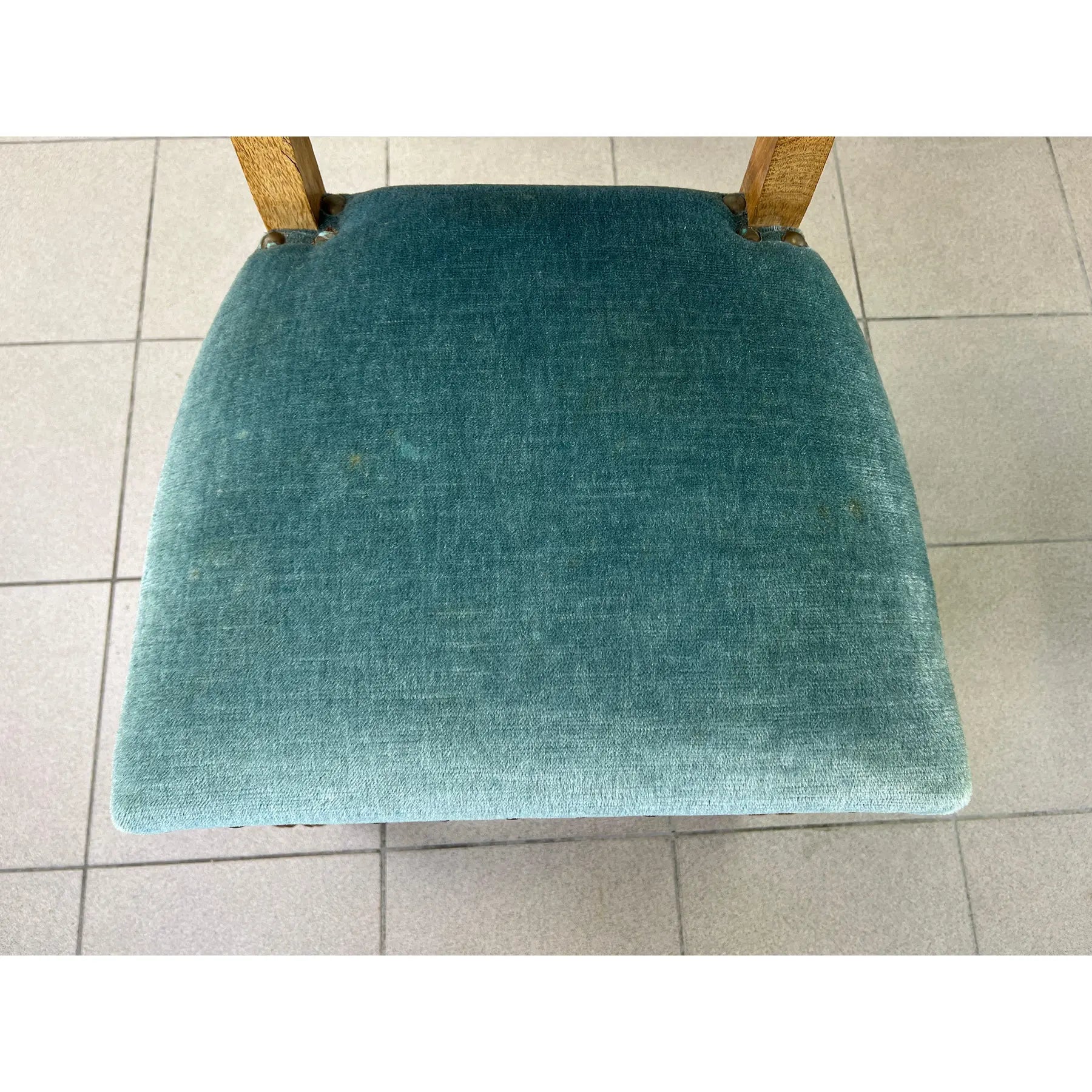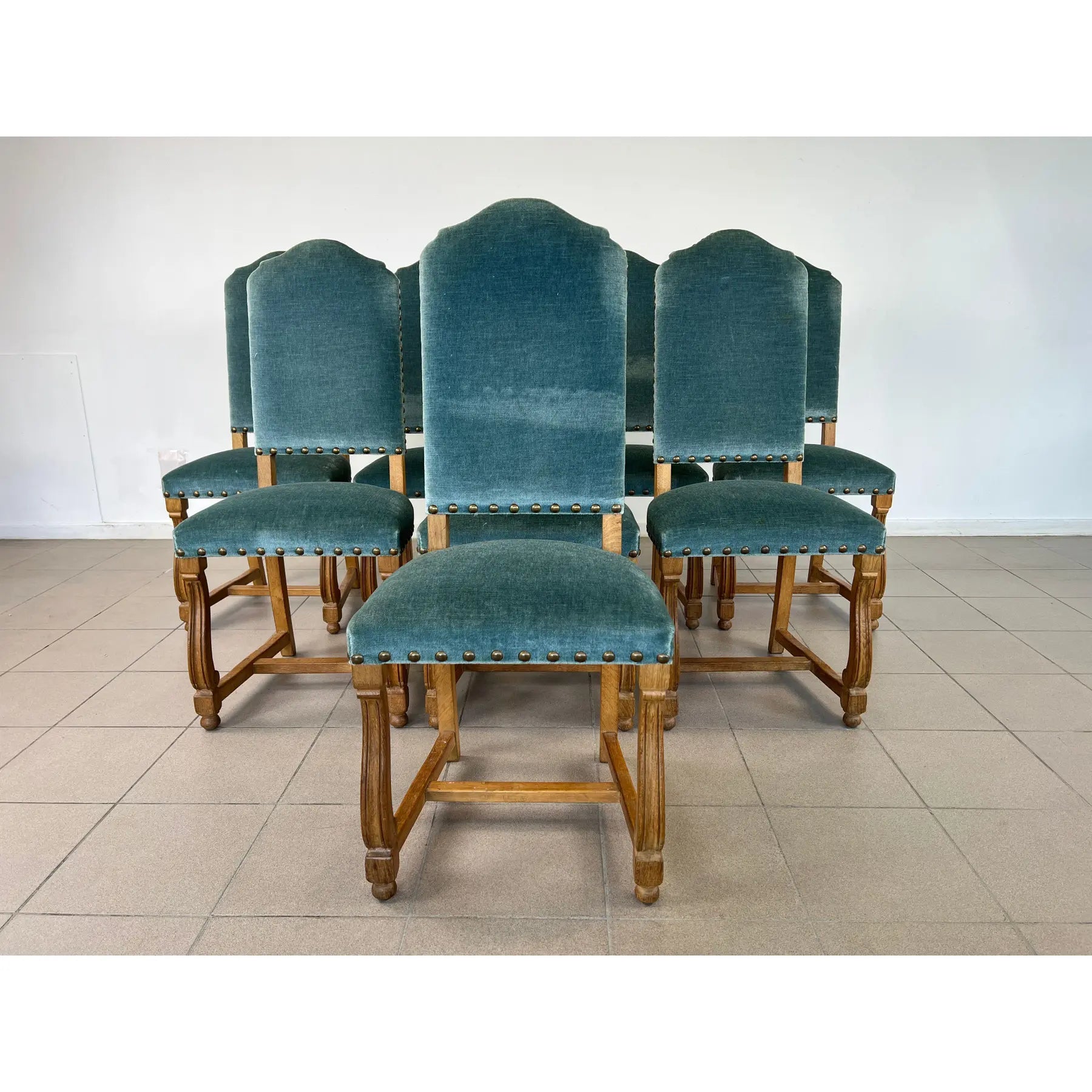 Vintage set of 8 Classic French Louis XIII Dining chairs with original blue fabric with nail trim finish. Comfortable high backs with wooden carved legs.