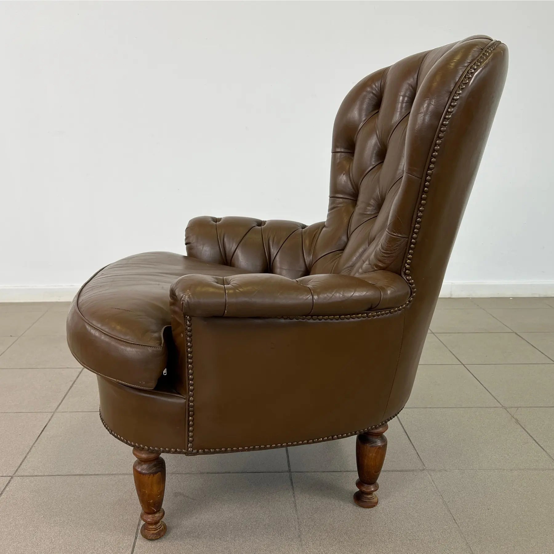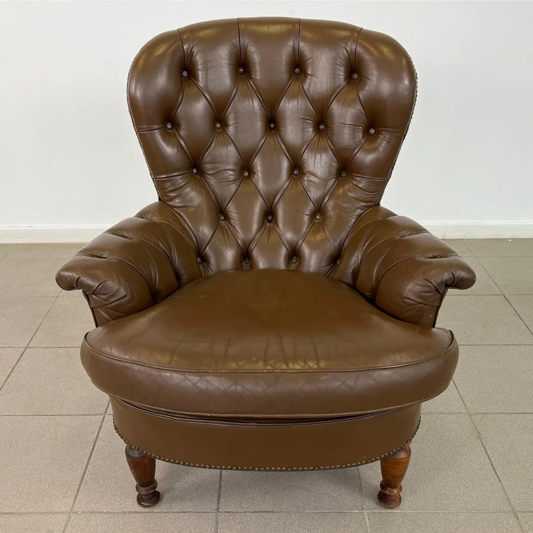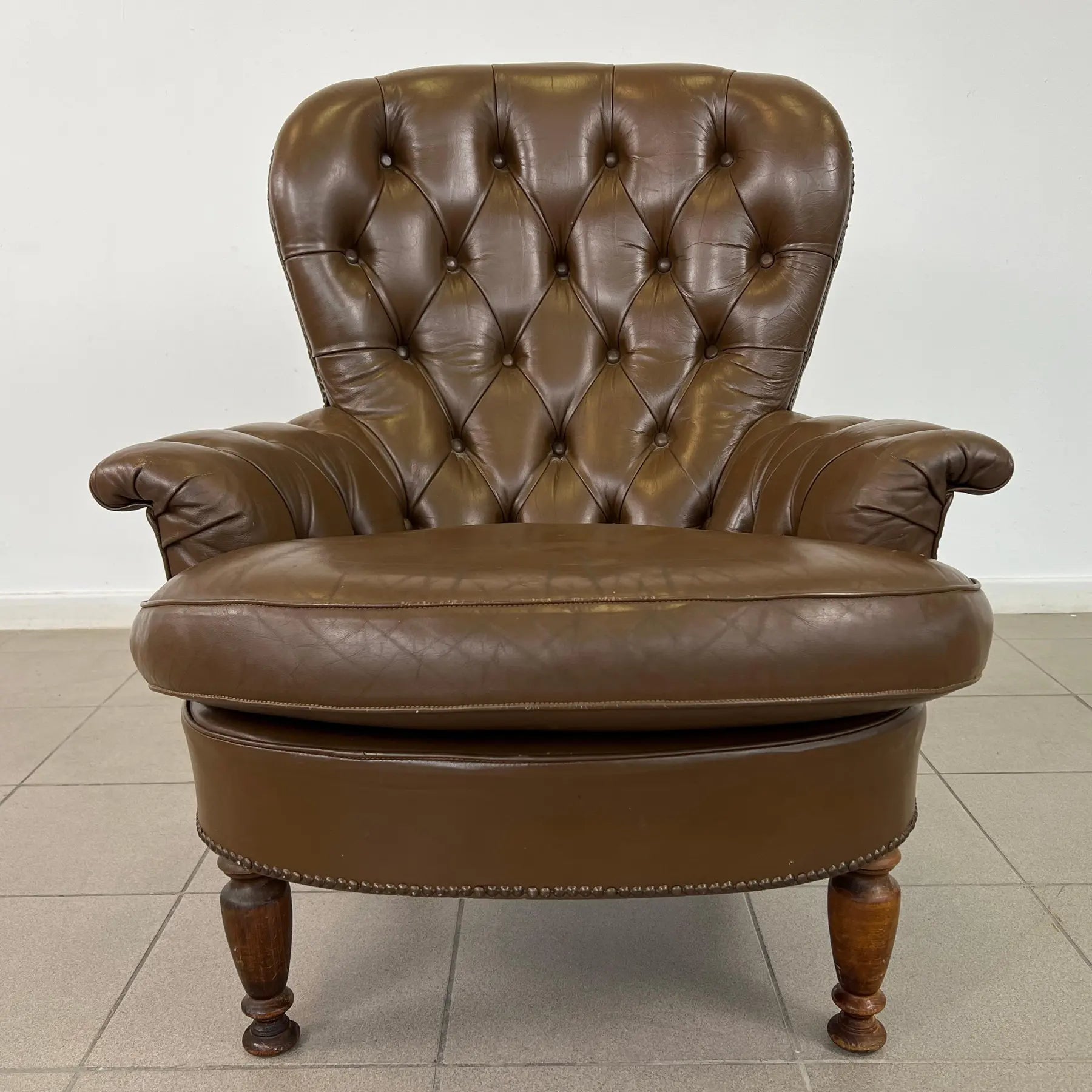 Vintage Dutch brown leather club chair. Button tufted back and armrests. Manufactured 1970s. Removable cushion.