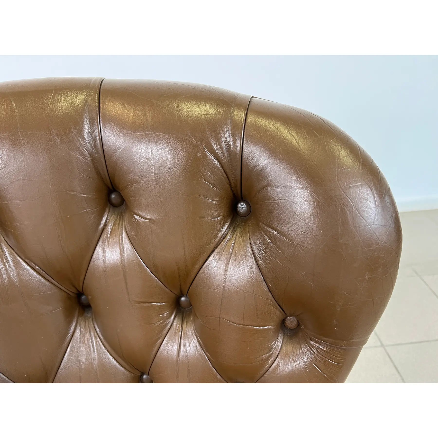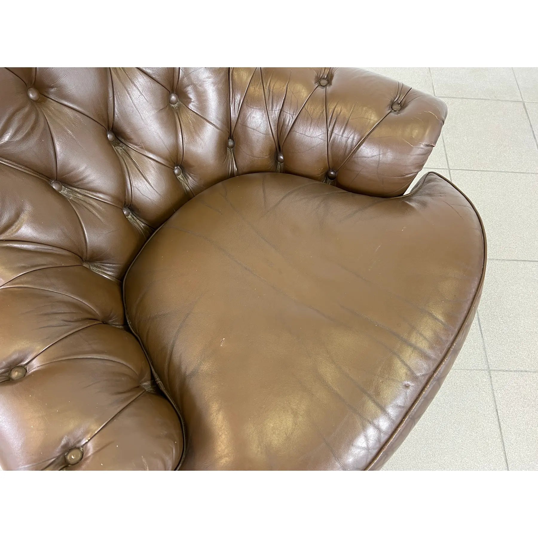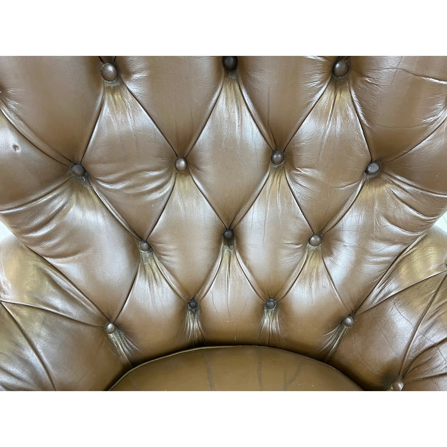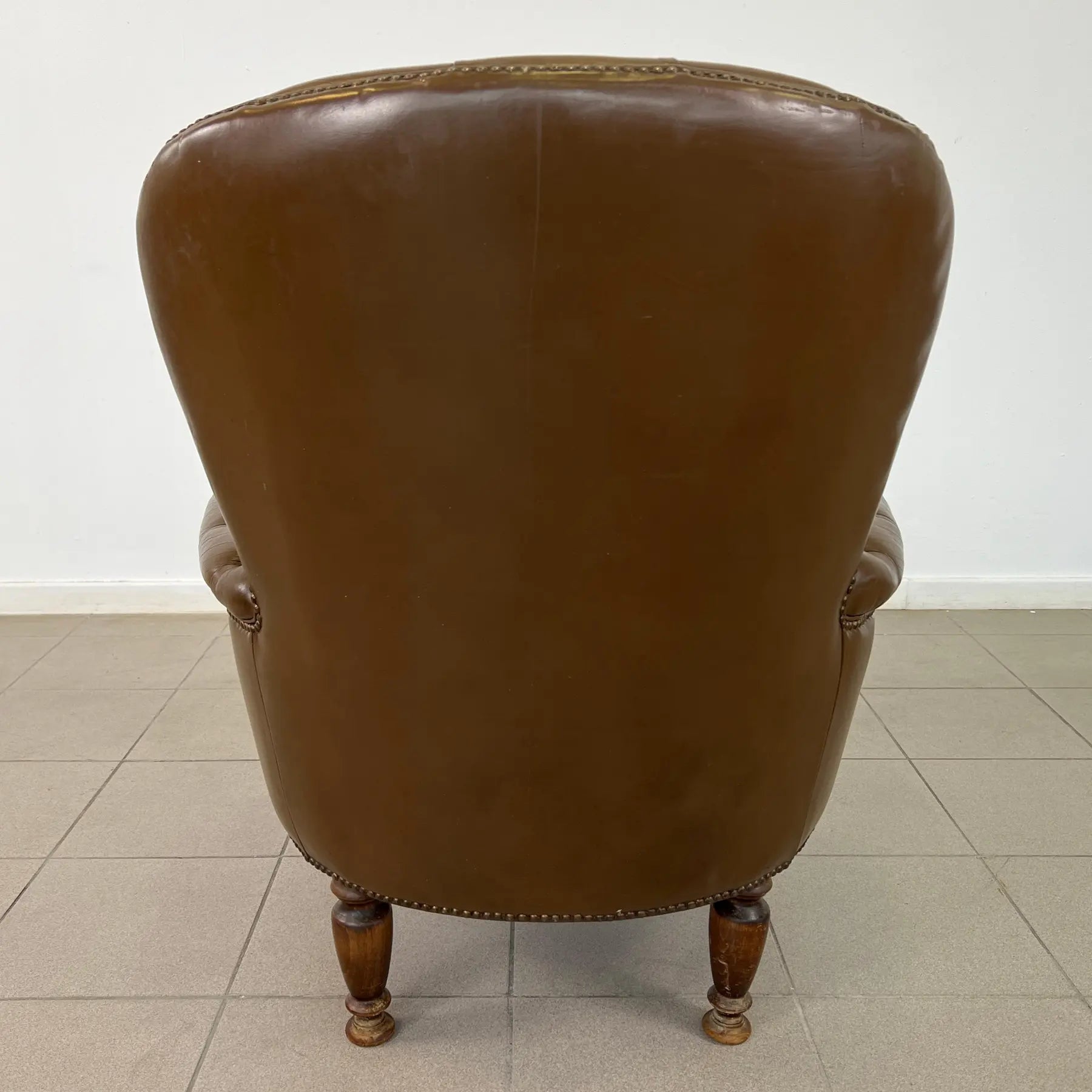 Vintage Dutch brown leather club chair. Button tufted back and armrests. Manufactured 1970s. Removable cushion.