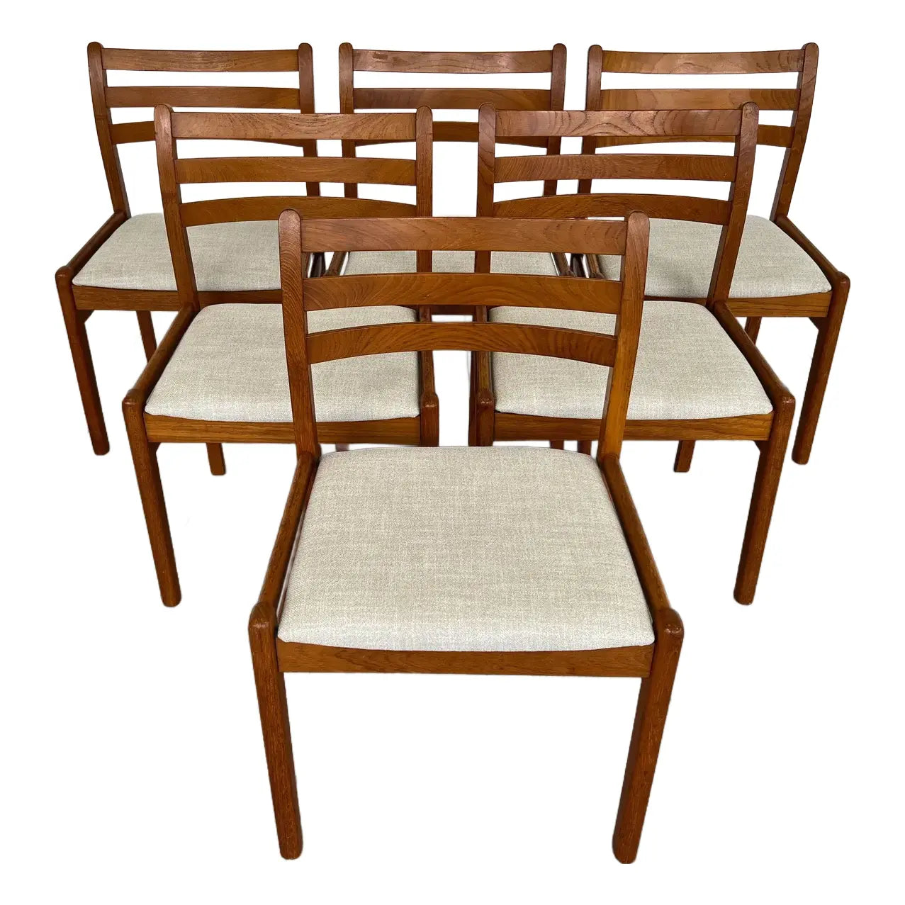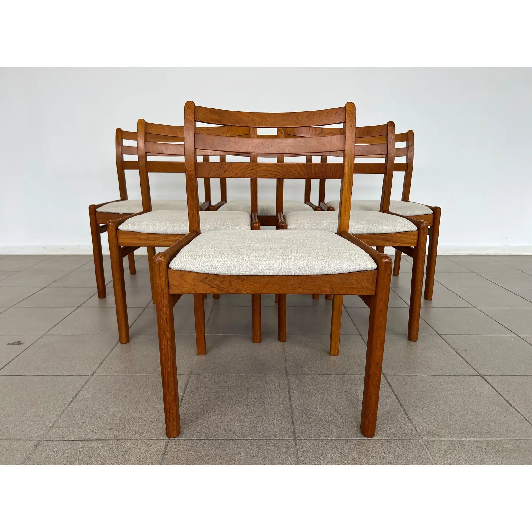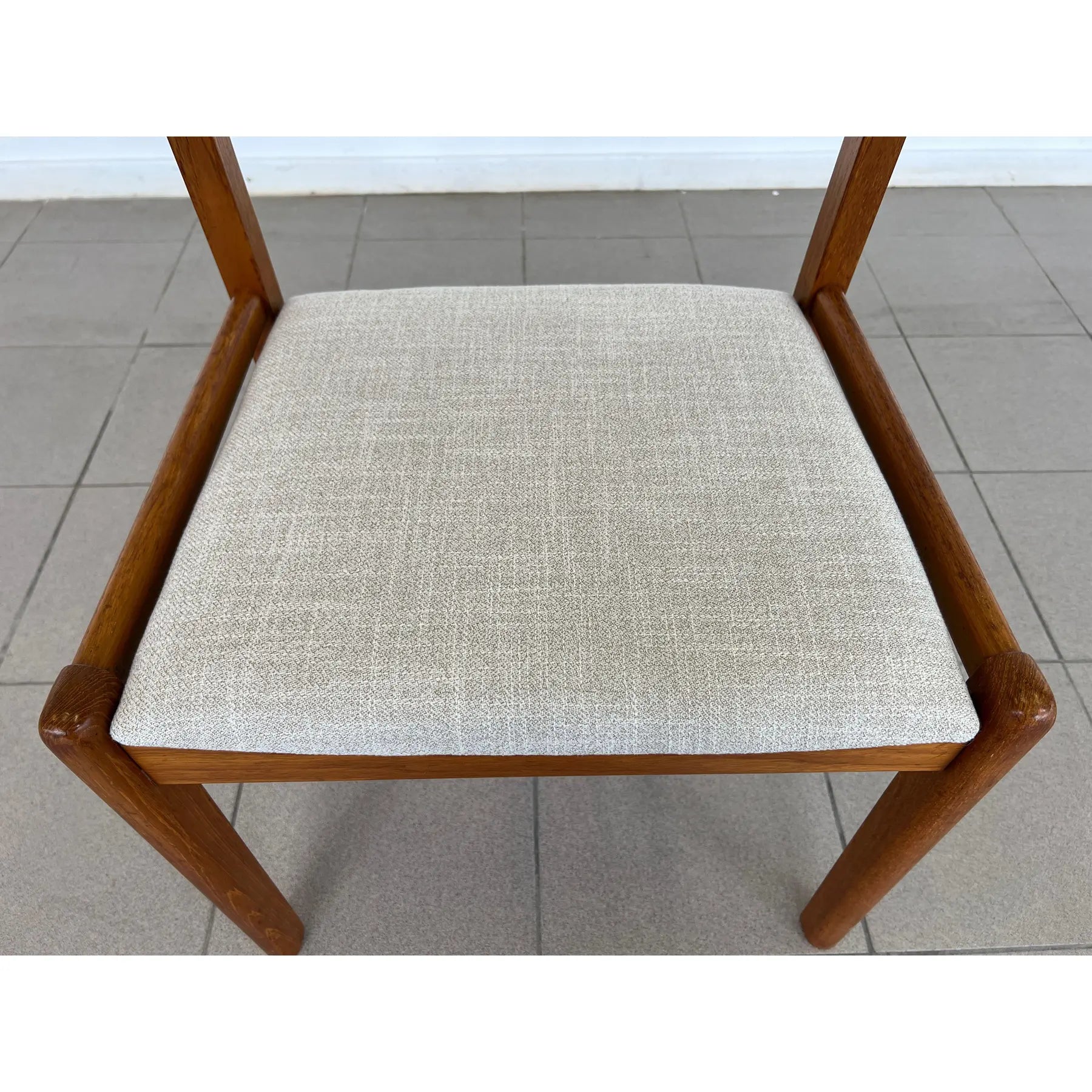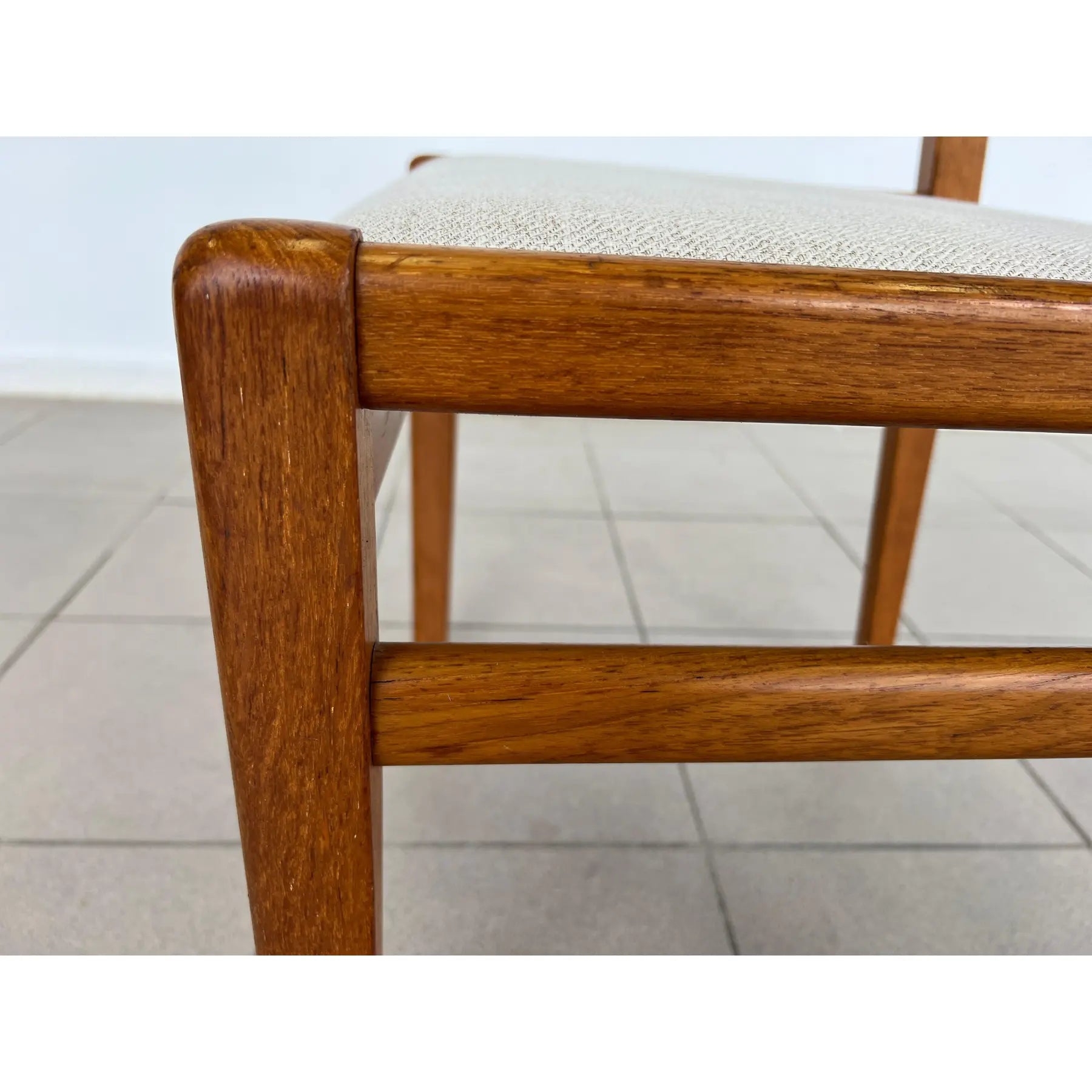 Set of 6 Mid Century Modern Scandinavian dining chairs. Solid wood frames and newly reupholstered seats. Stable and in very good condition with minimal signs of wear. A gorgeous addition to any interior.