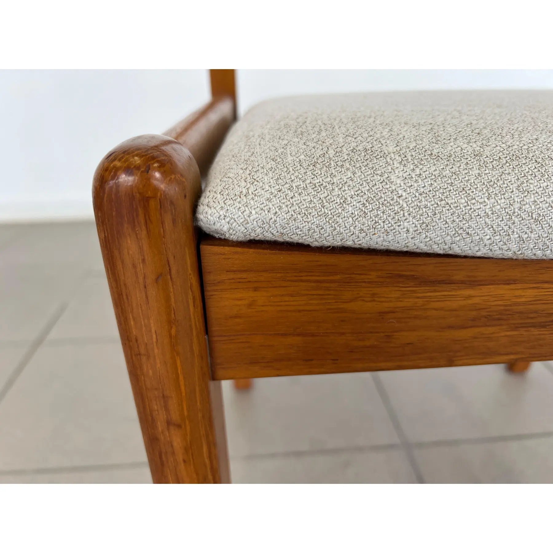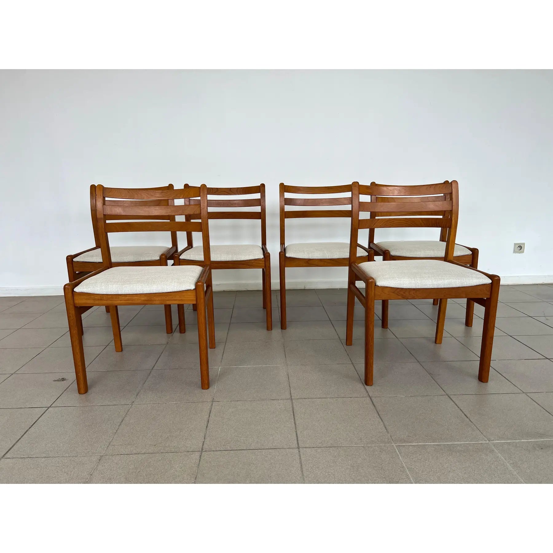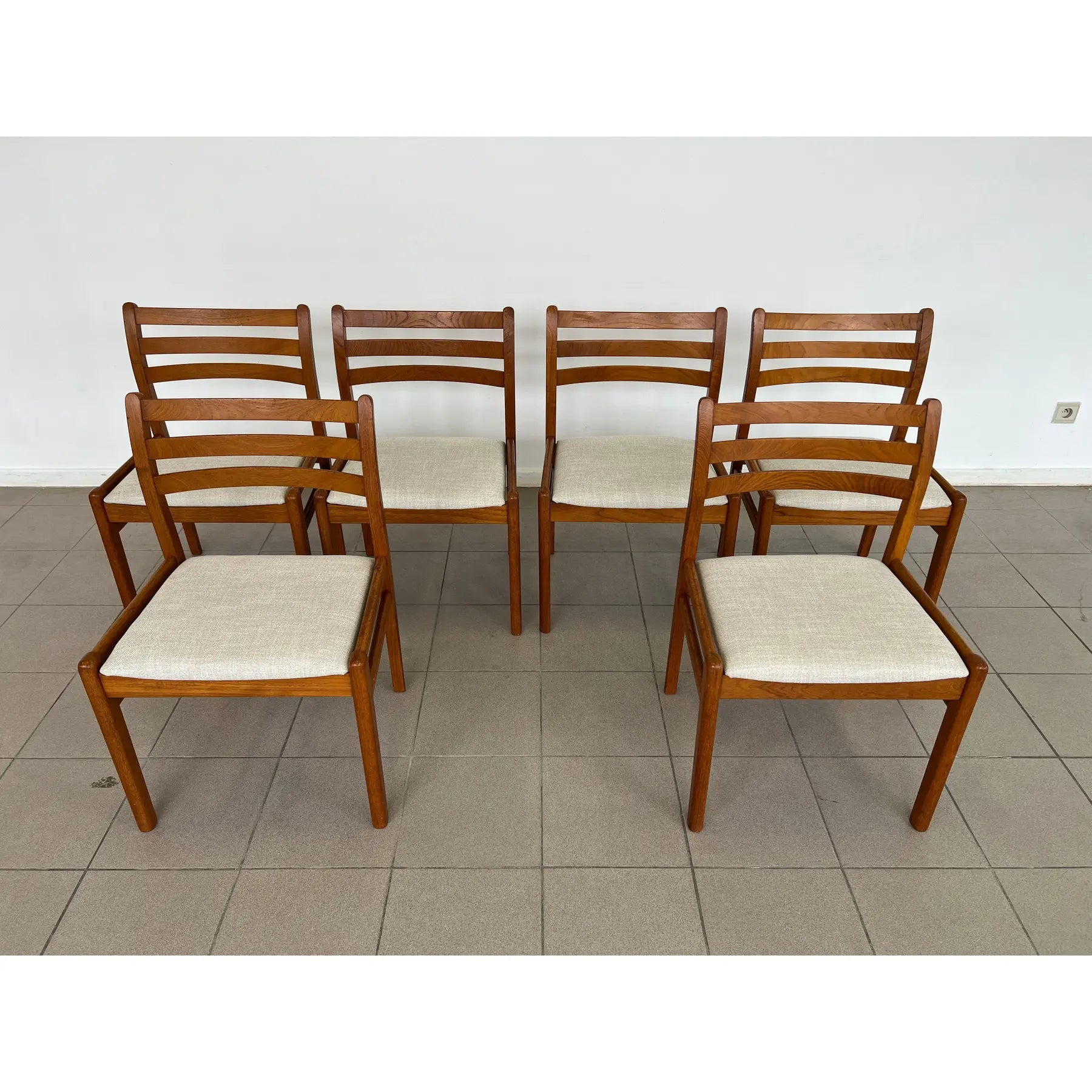 Set of 6 Mid Century Modern Scandinavian dining chairs. Solid wood frames and newly reupholstered seats. Stable and in very good condition with minimal signs of wear. A gorgeous addition to any interior.
