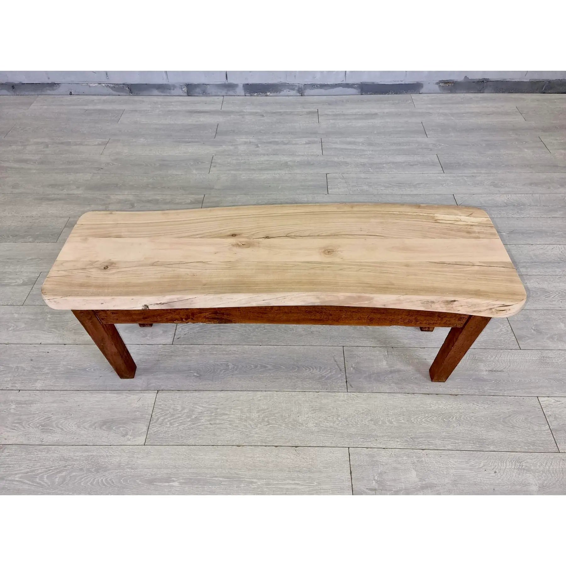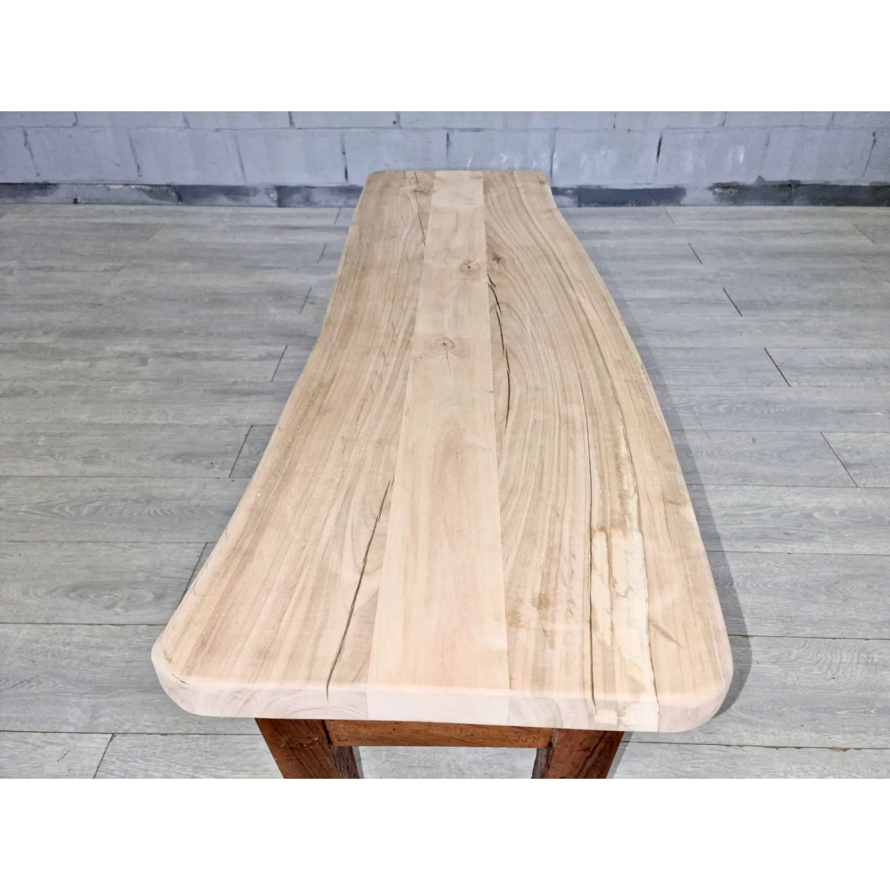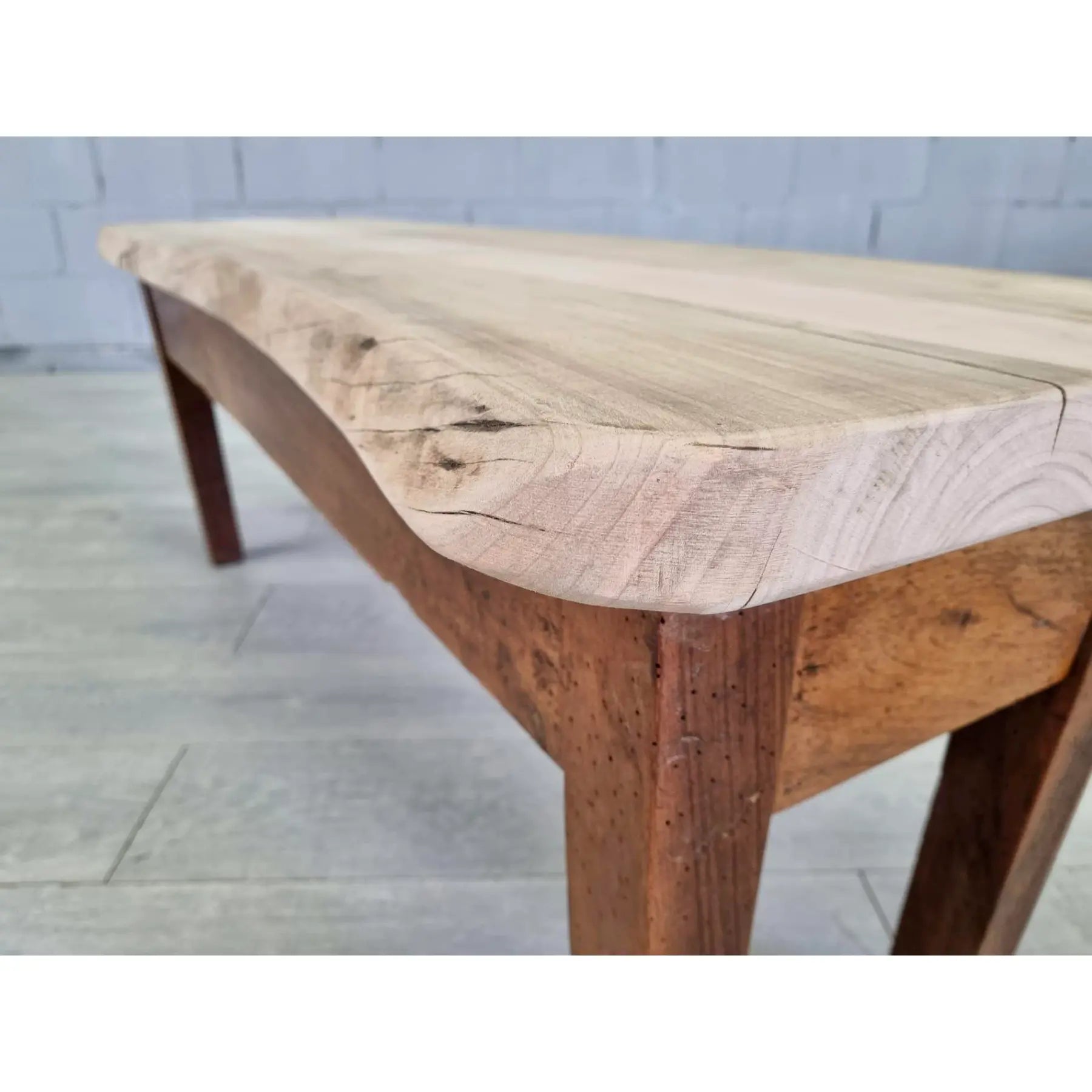 This fantastic bench is precisely distressed, sanded, stained and has many practical applications. It features a beautiful wave-shaped organic bleached hardwood top (seating space) standing on four solid square legs. A design that celebrates simplicity of form and purity of function. Most commonly used in entryways for sitting on, but it also works pretty well along the long side of most dining room tables or as a plant stand. A wonderful addition to your interior and outdoor.