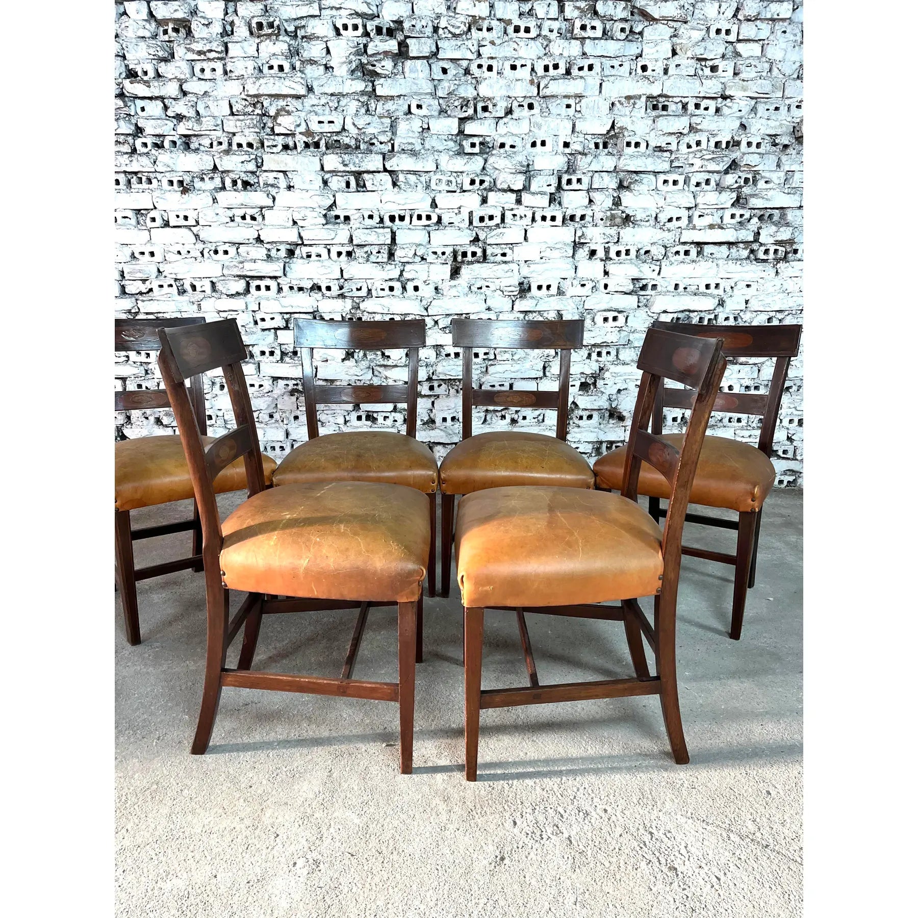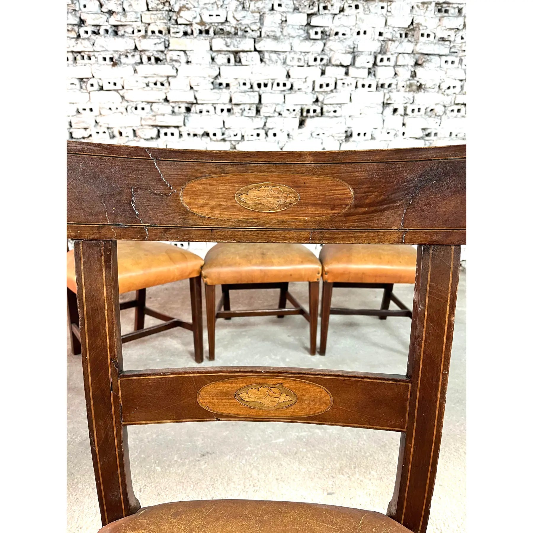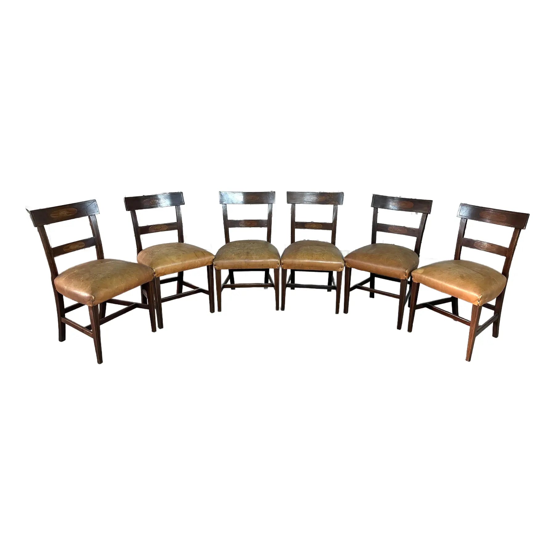 Set of 6 antique Regency period inlaid mahogany bar-back dining chairs. Comfortable back rests and original distressed brown leather seats. Raised on tapered legs with understretcher.