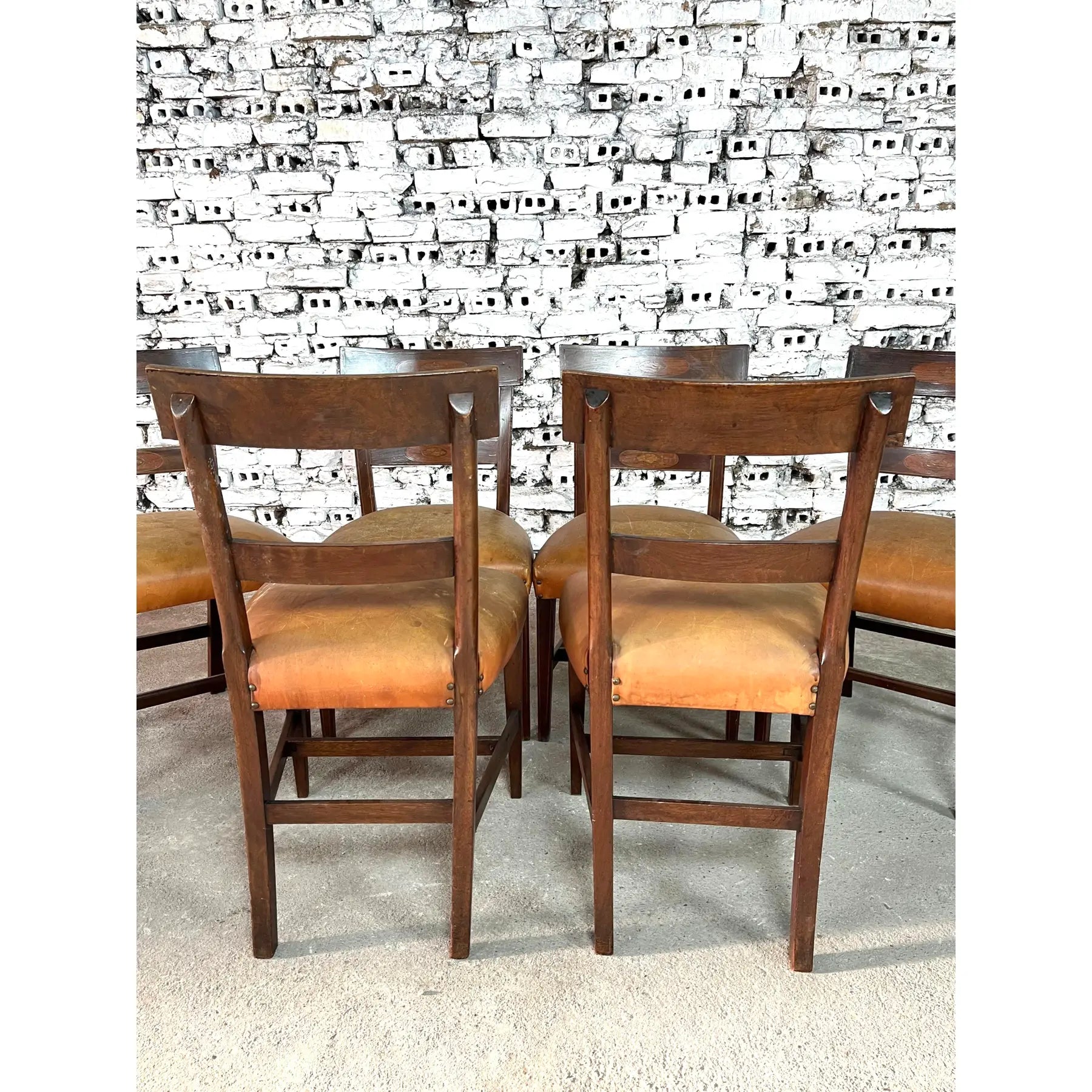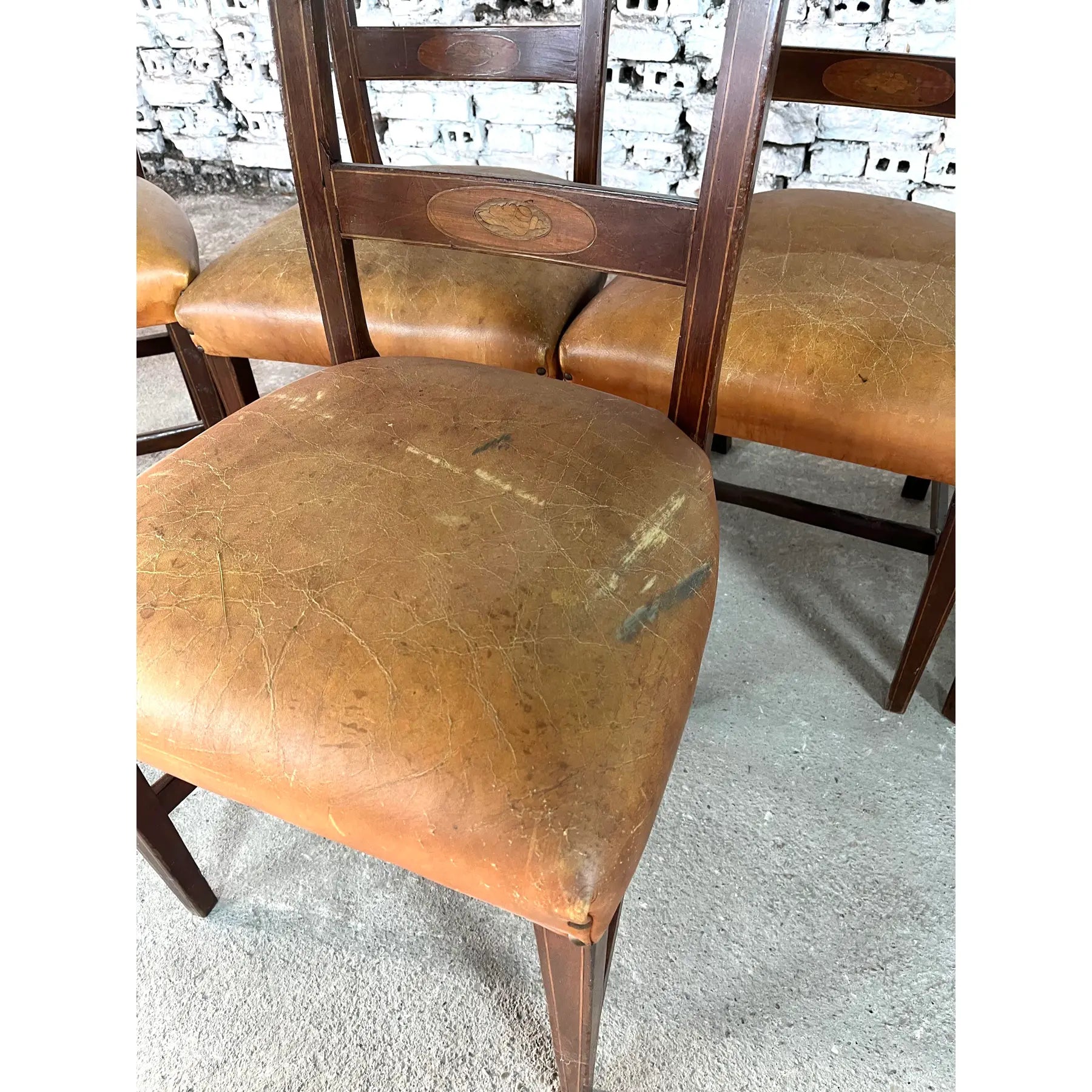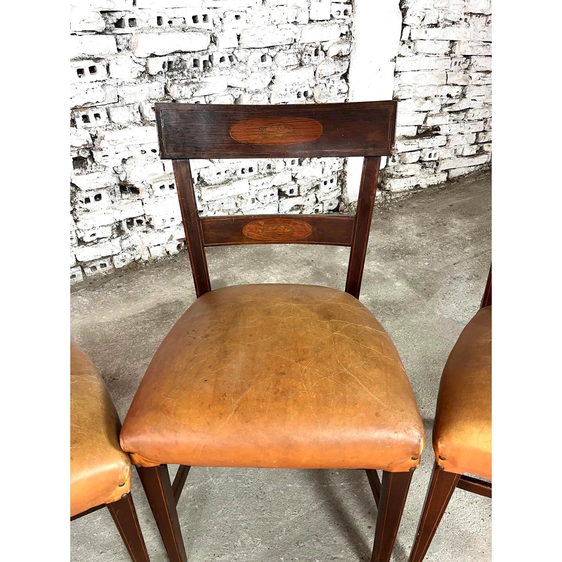 Set of 6 antique Regency period inlaid mahogany bar-back dining chairs. Comfortable back rests and original distressed brown leather seats. Raised on tapered legs with understretcher.