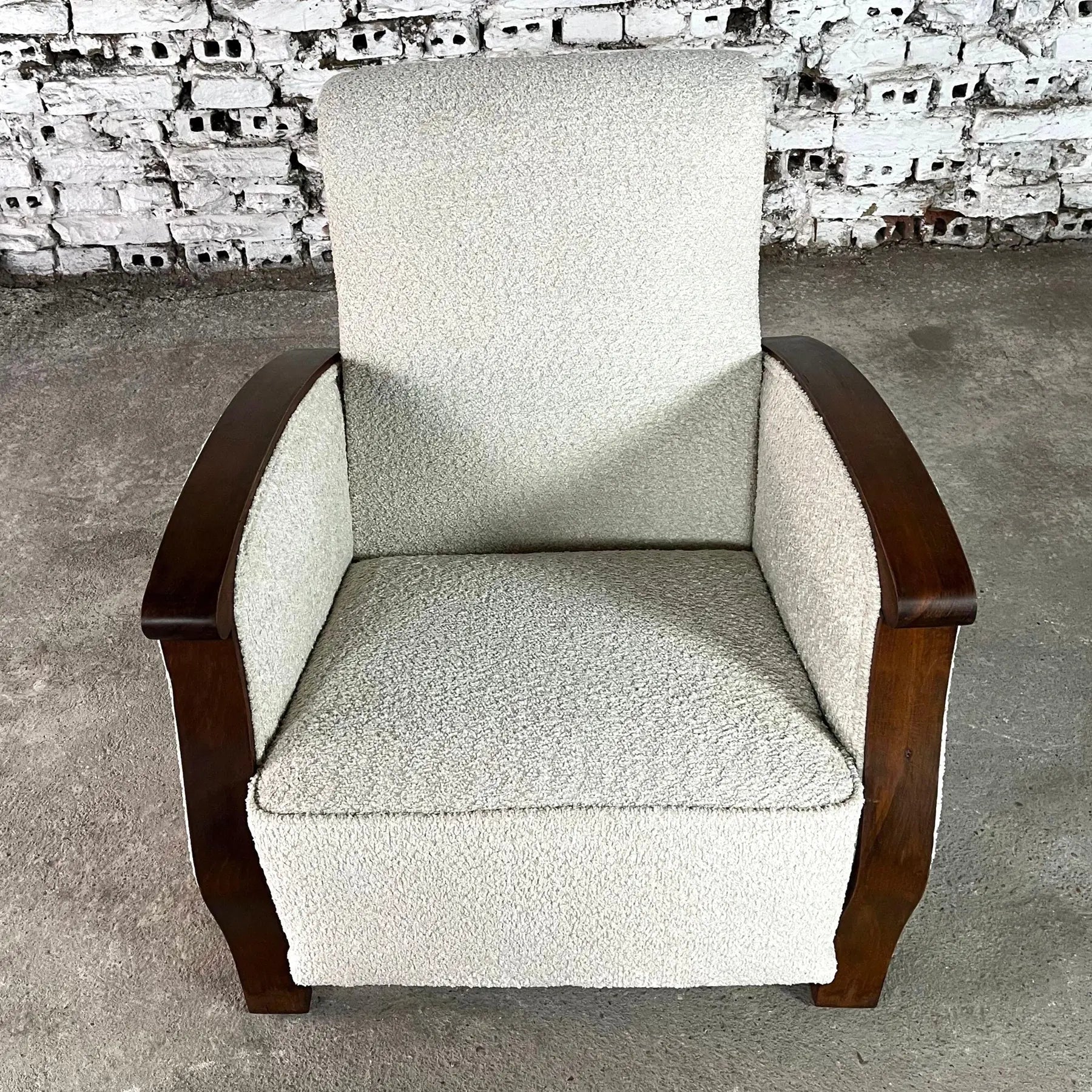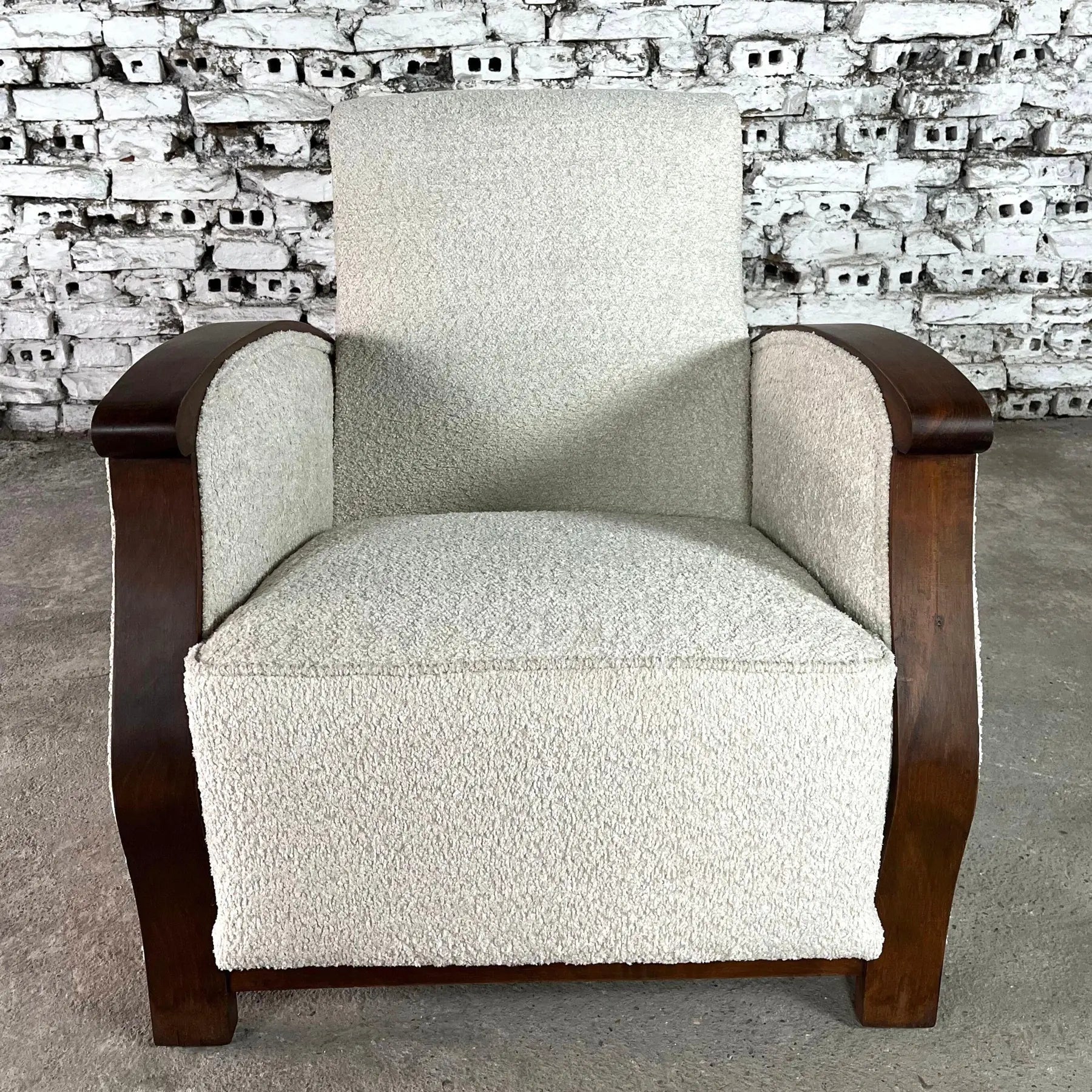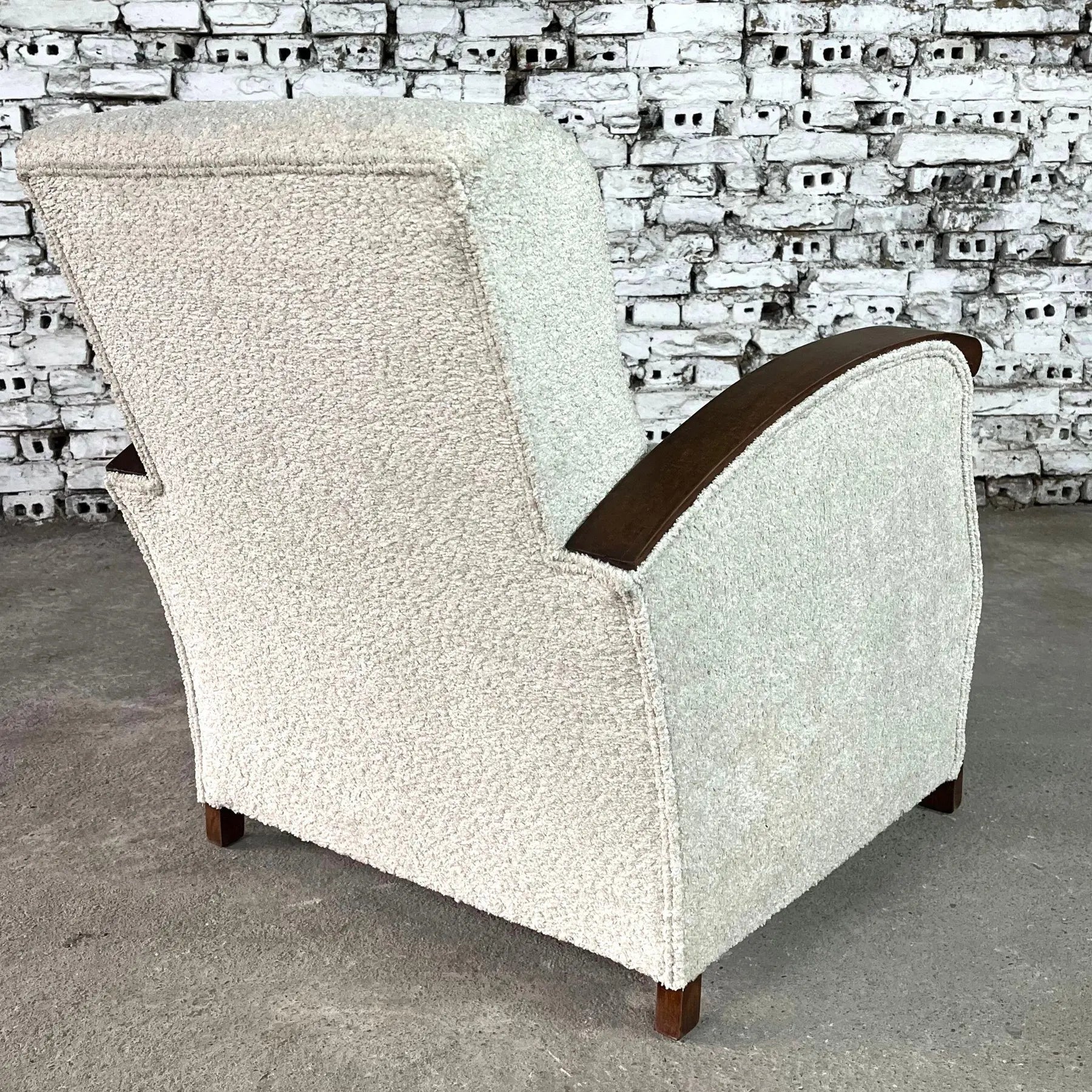 Dutch Art Deco armchair, newly upholstered in white boucle with curved wooden armrests in dark brown color. Comfortable and stylish armchair.
