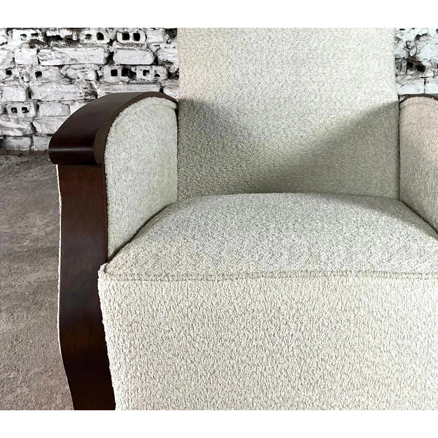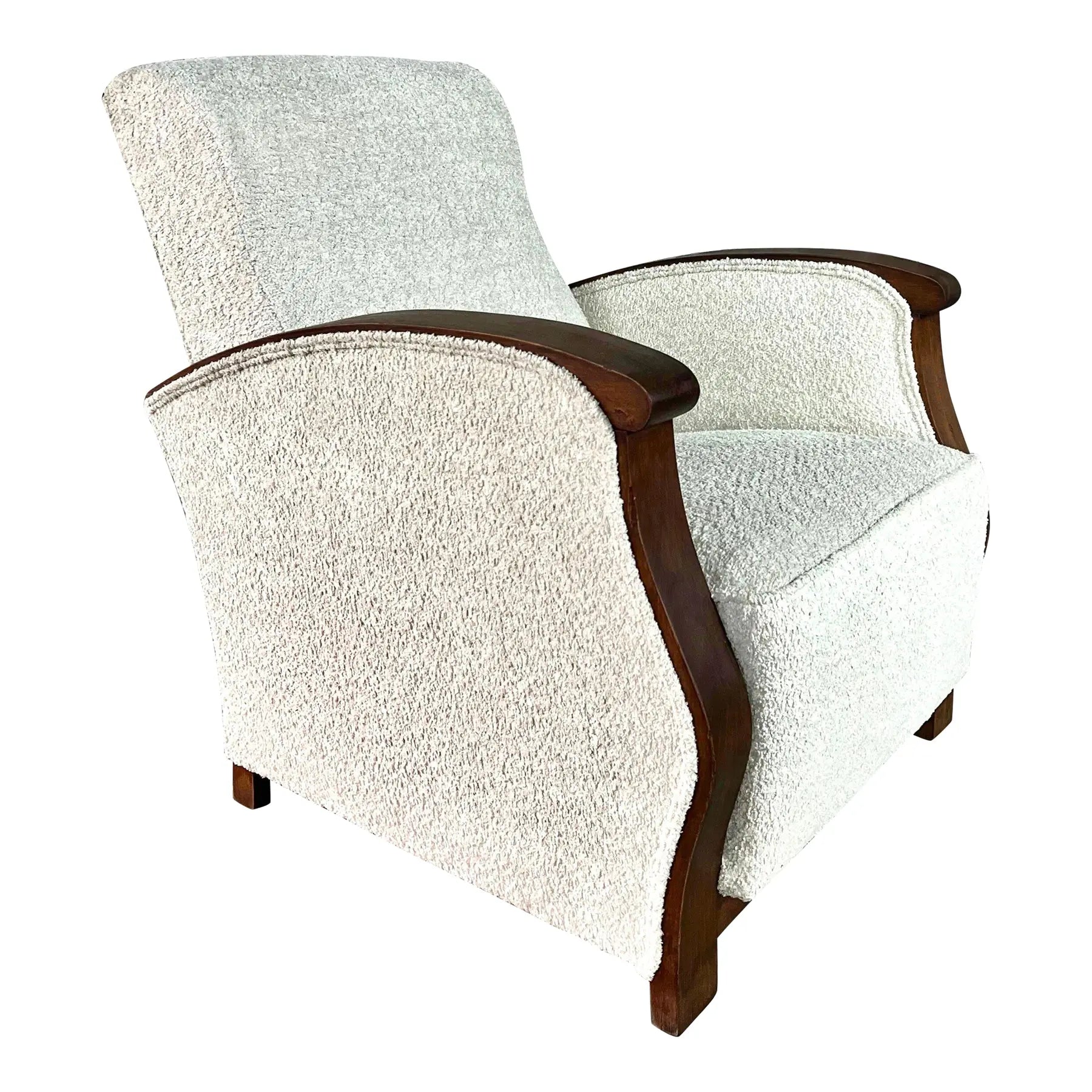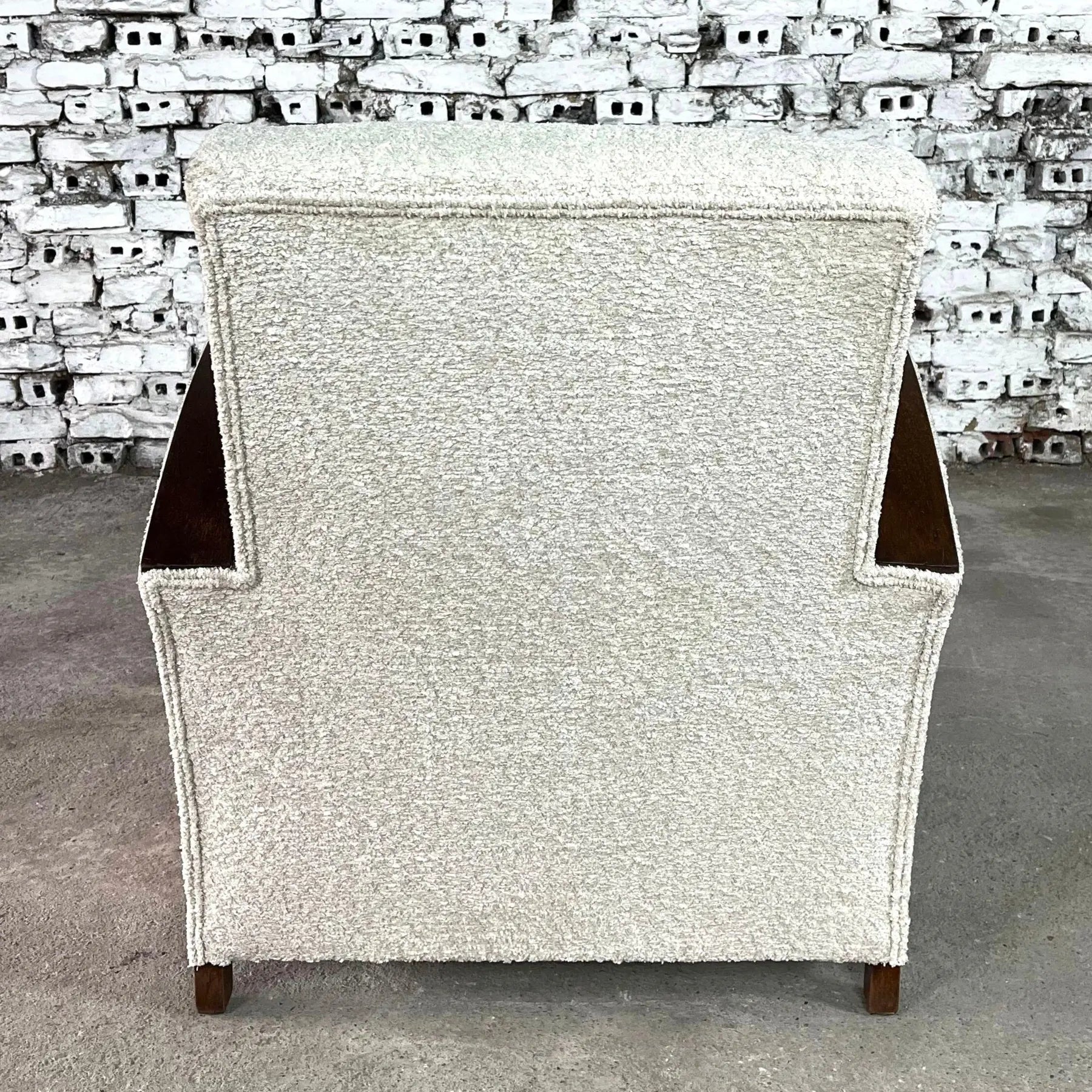 Dutch Art Deco armchair, newly upholstered in white boucle with curved wooden armrests in dark brown color. Comfortable and stylish armchair.