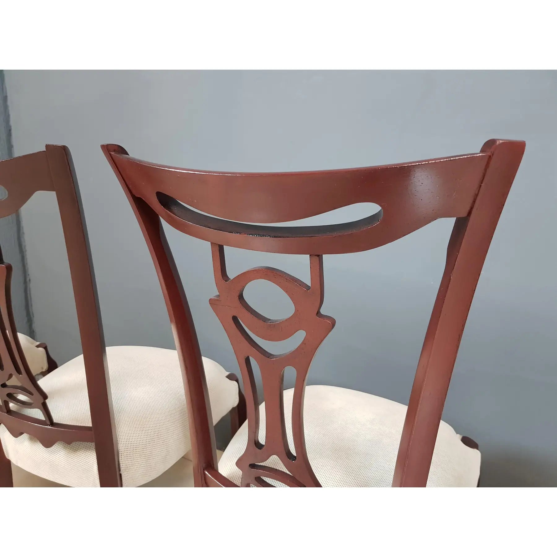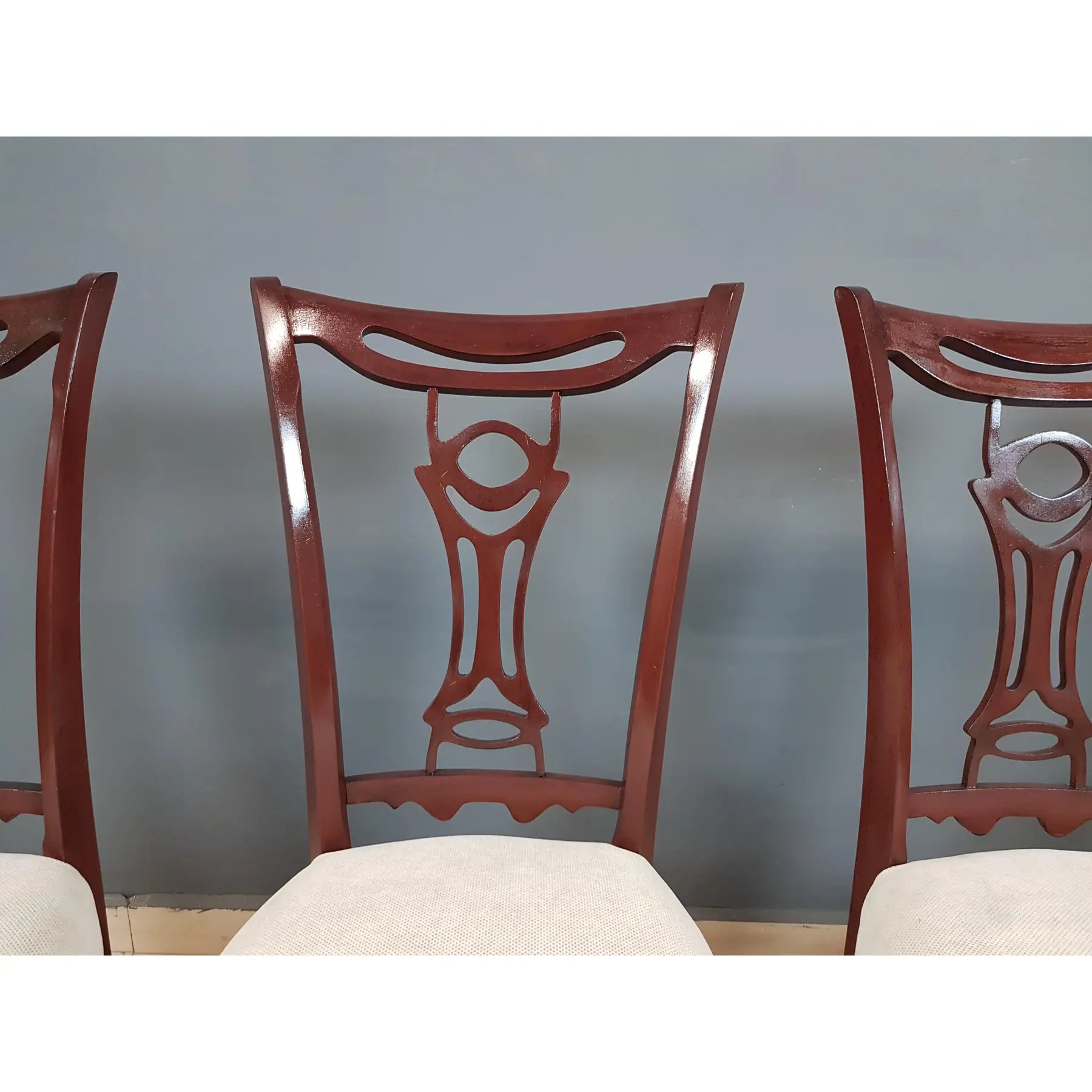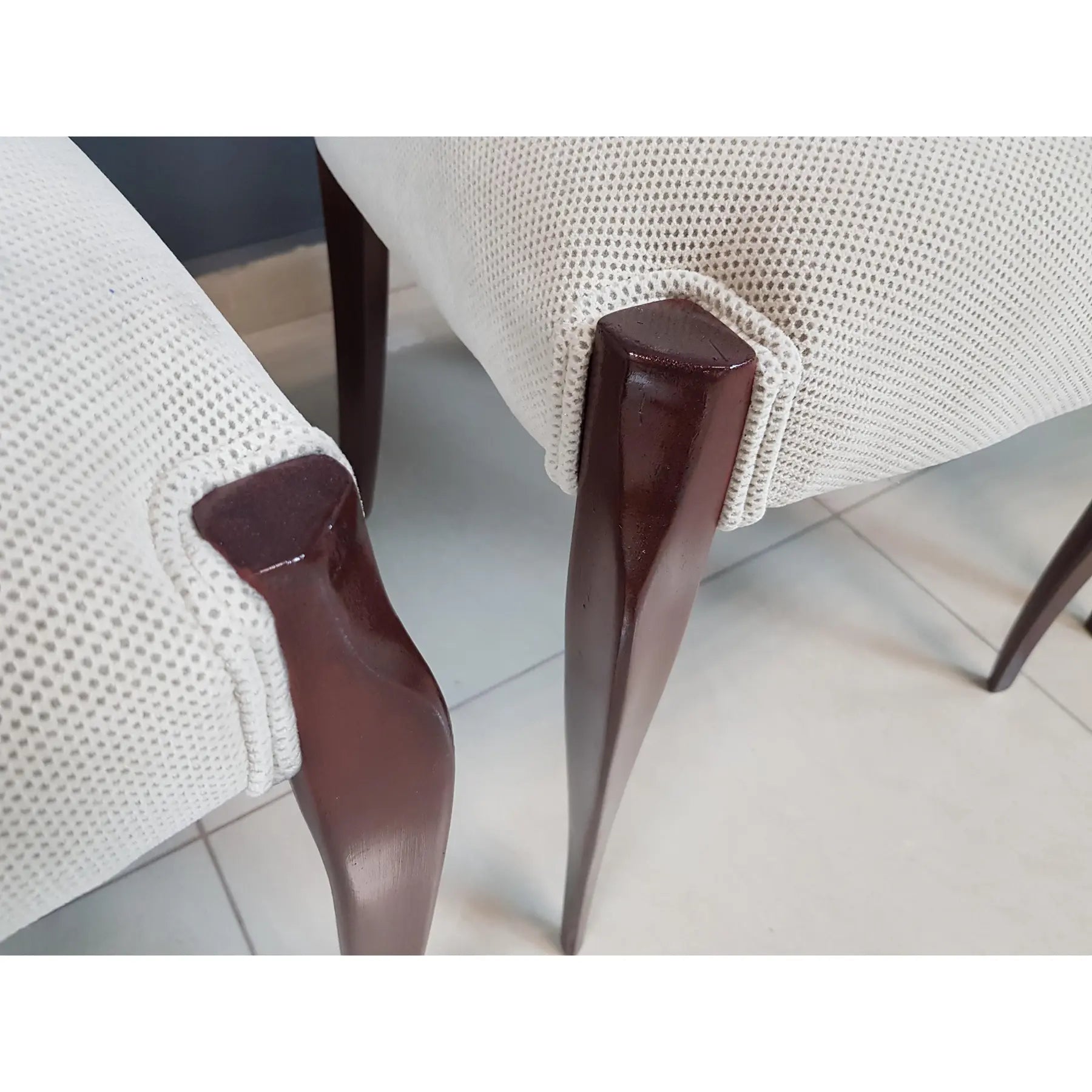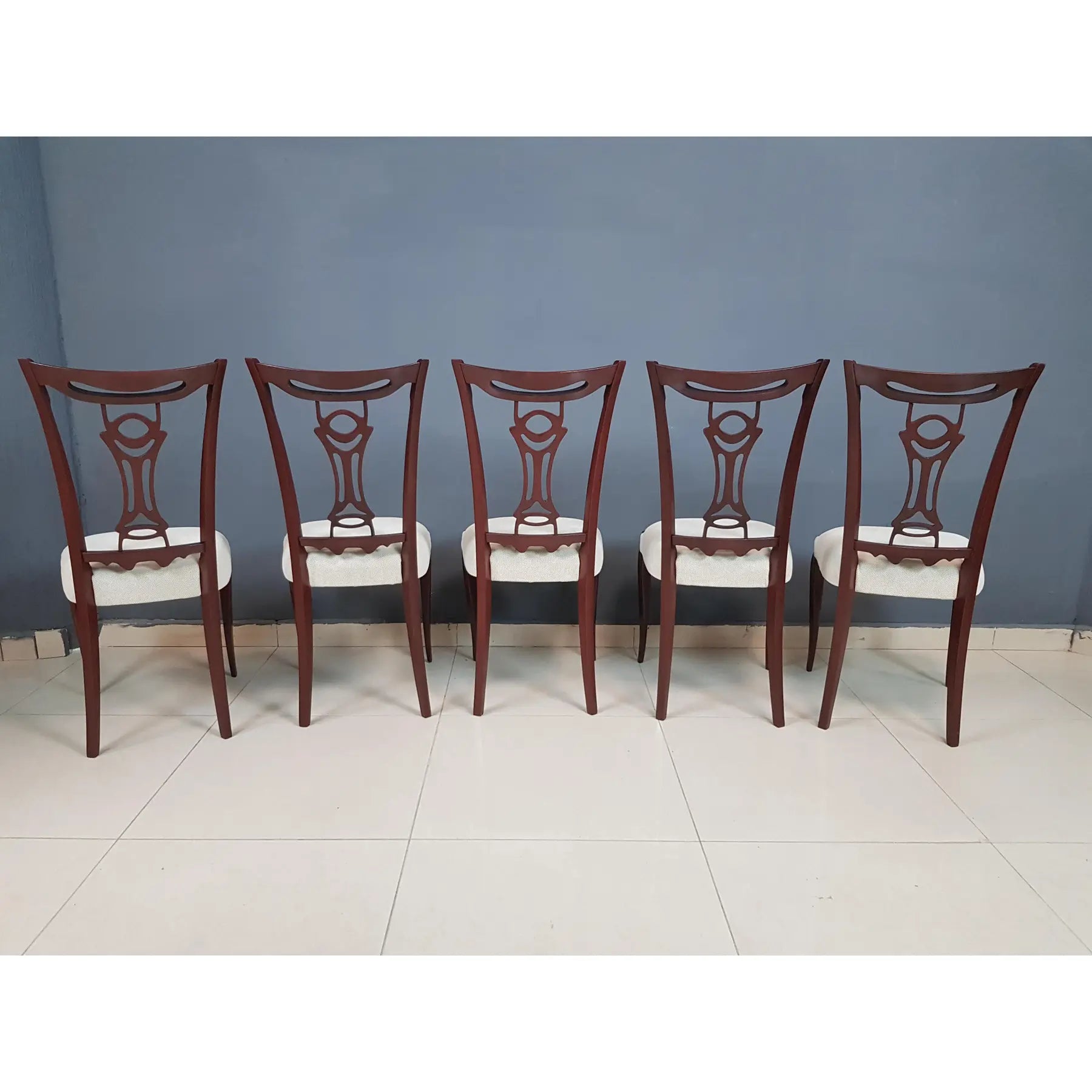 Stylish set of 5 Italian vintage modern reupholstered dining chairs and elegant solid wood frame. They could make an elegant mid-century addition to home dining and living room seating. The sculptural lacquered frame and reupholstered seat offer timeless comfort and the iconic style after Paolo Buffa.