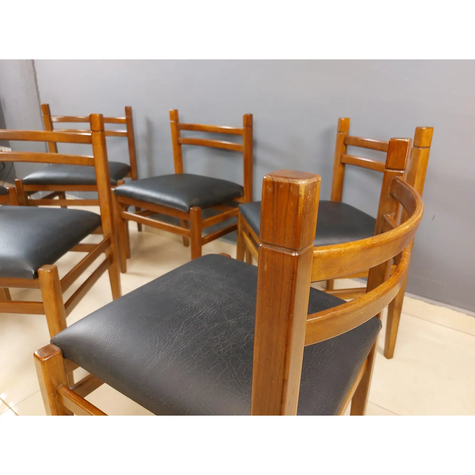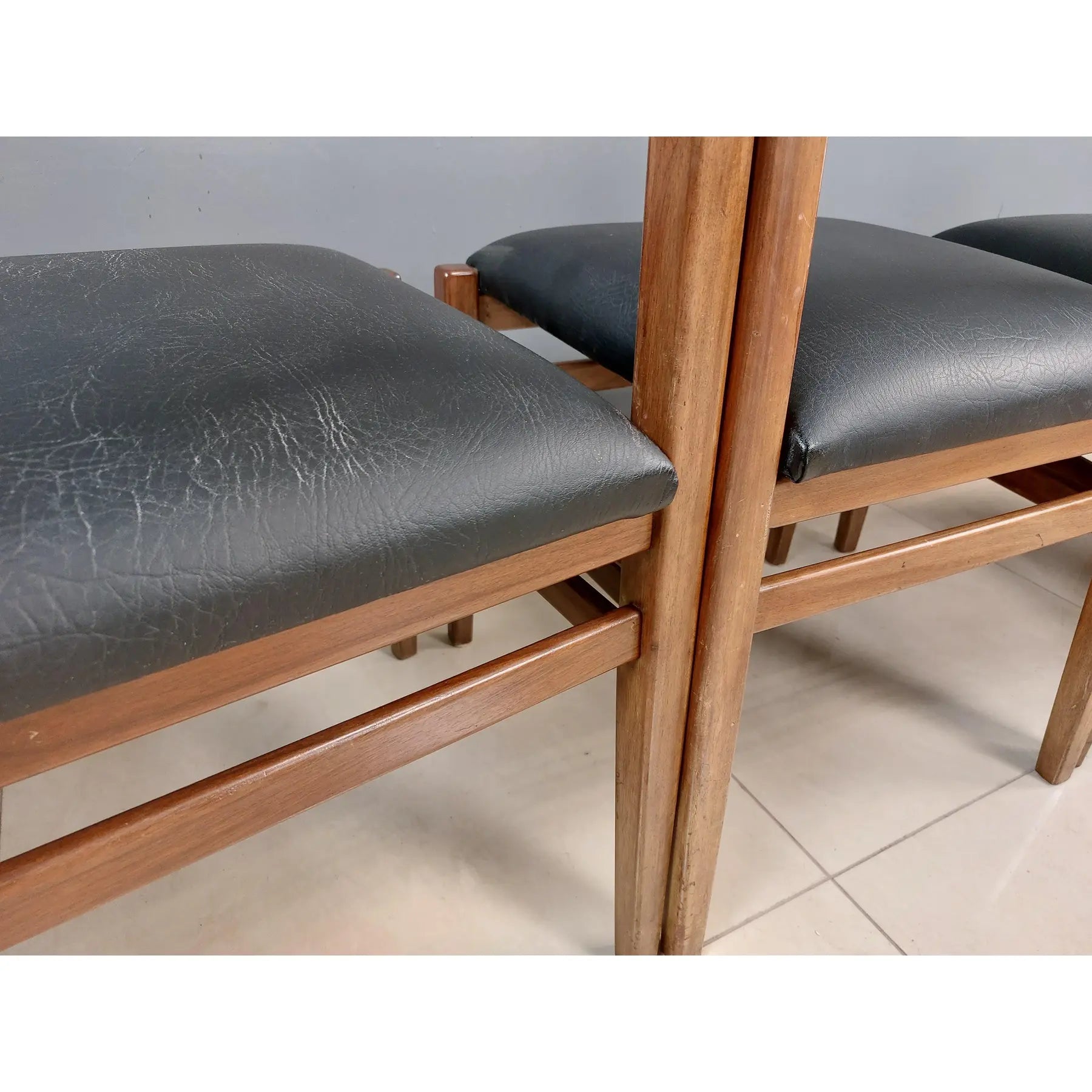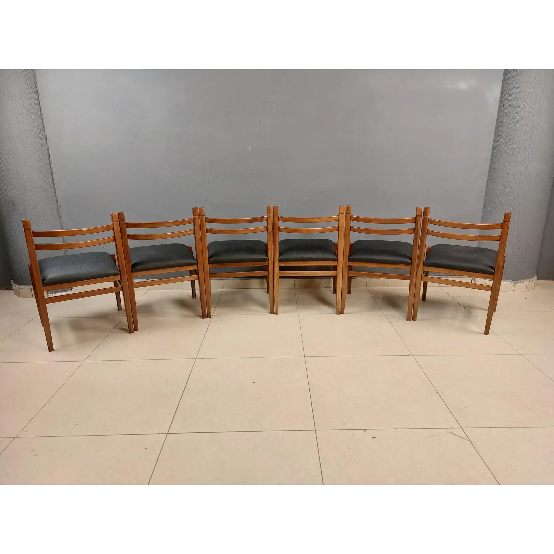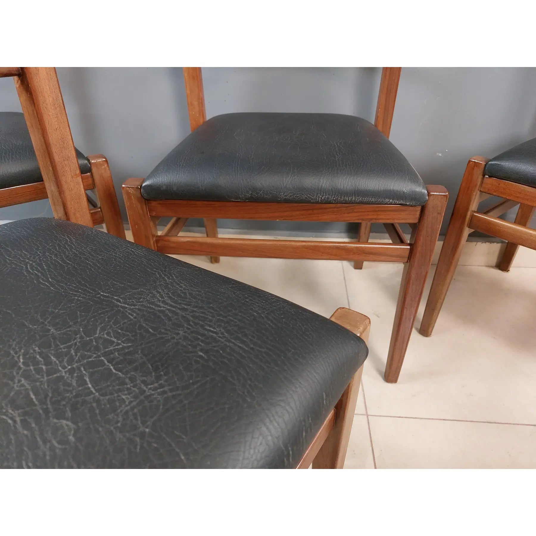 Set of 6 Mid Century Modern Dining Chairs with vintage faux leather upholstery. Gorgeous solid wood frame with original black faux leather seat. Chic Scandinavian design. A great designer set of dining or side chairs ready for everyday use. Simple, clean lines and compact design make these chairs perfect for the home or office.