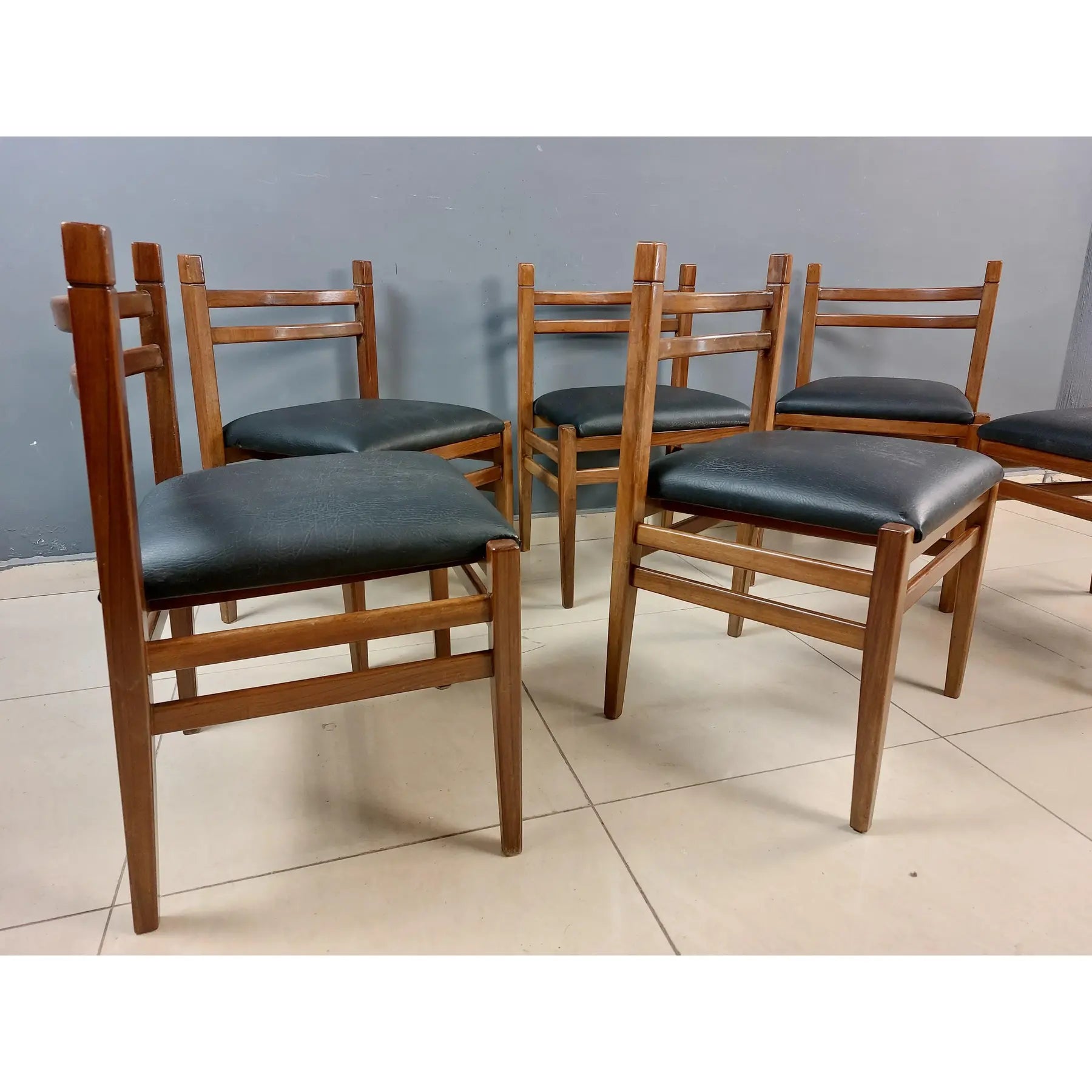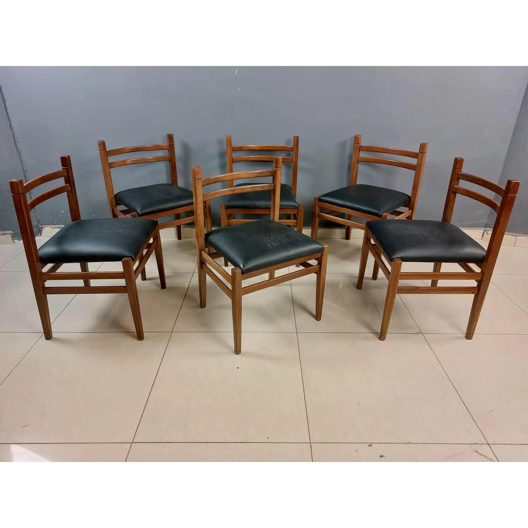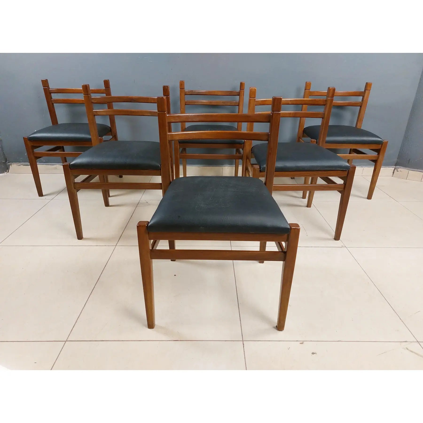 Set of 6 Mid Century Modern Dining Chairs with vintage faux leather upholstery. Gorgeous solid wood frame with original black faux leather seat. Chic Scandinavian design. A great designer set of dining or side chairs ready for everyday use. Simple, clean lines and compact design make these chairs perfect for the home or office.