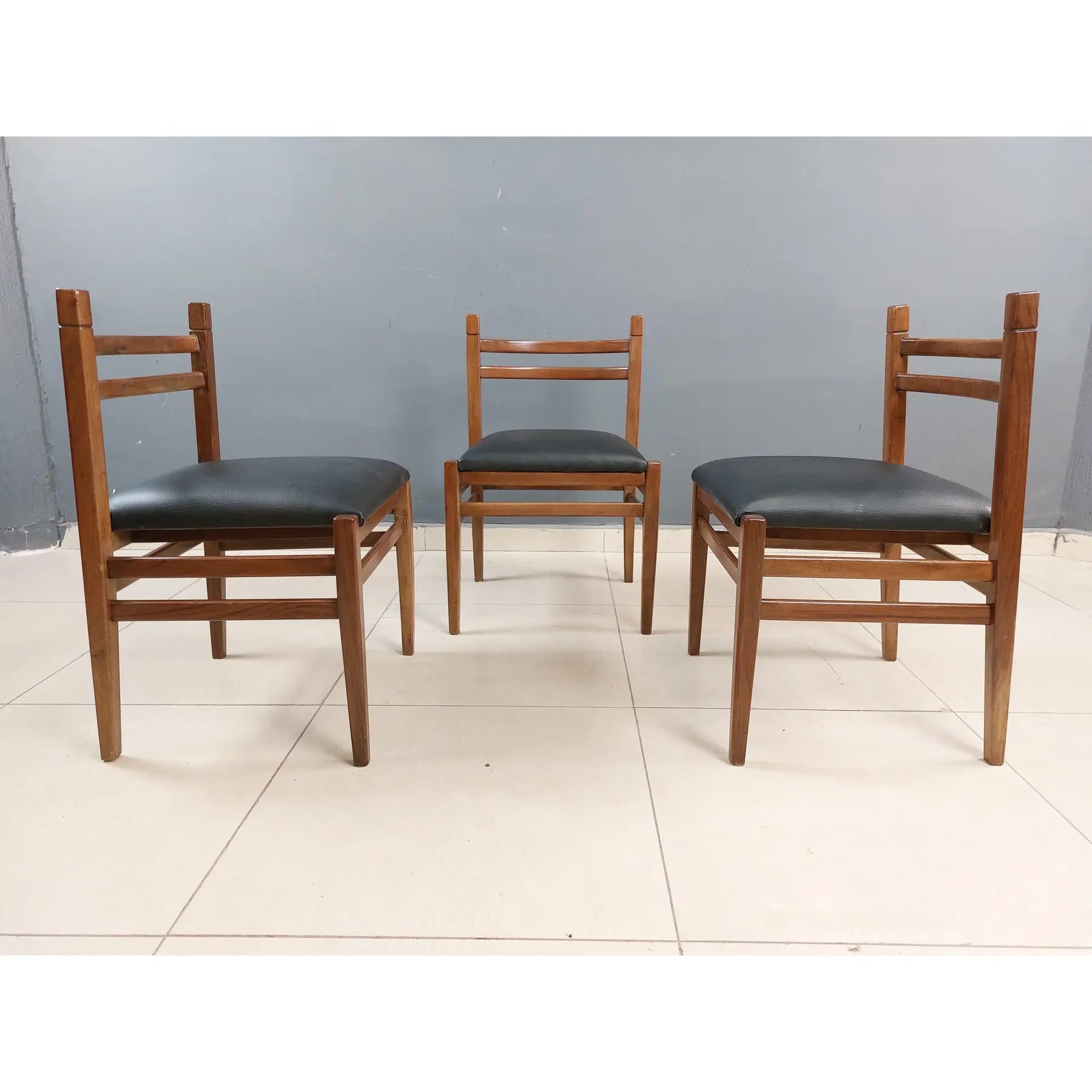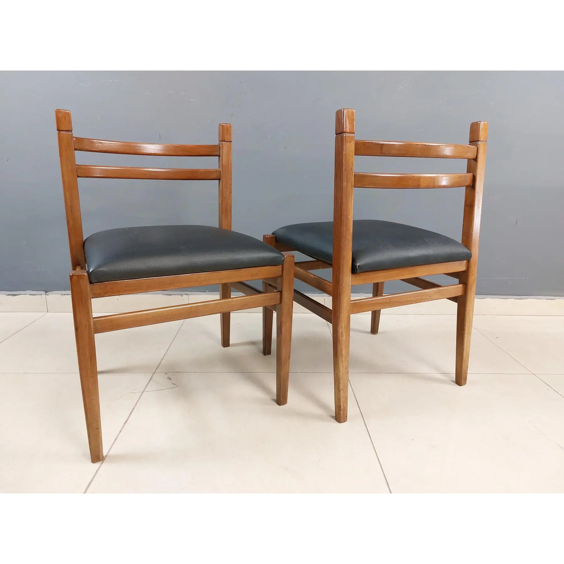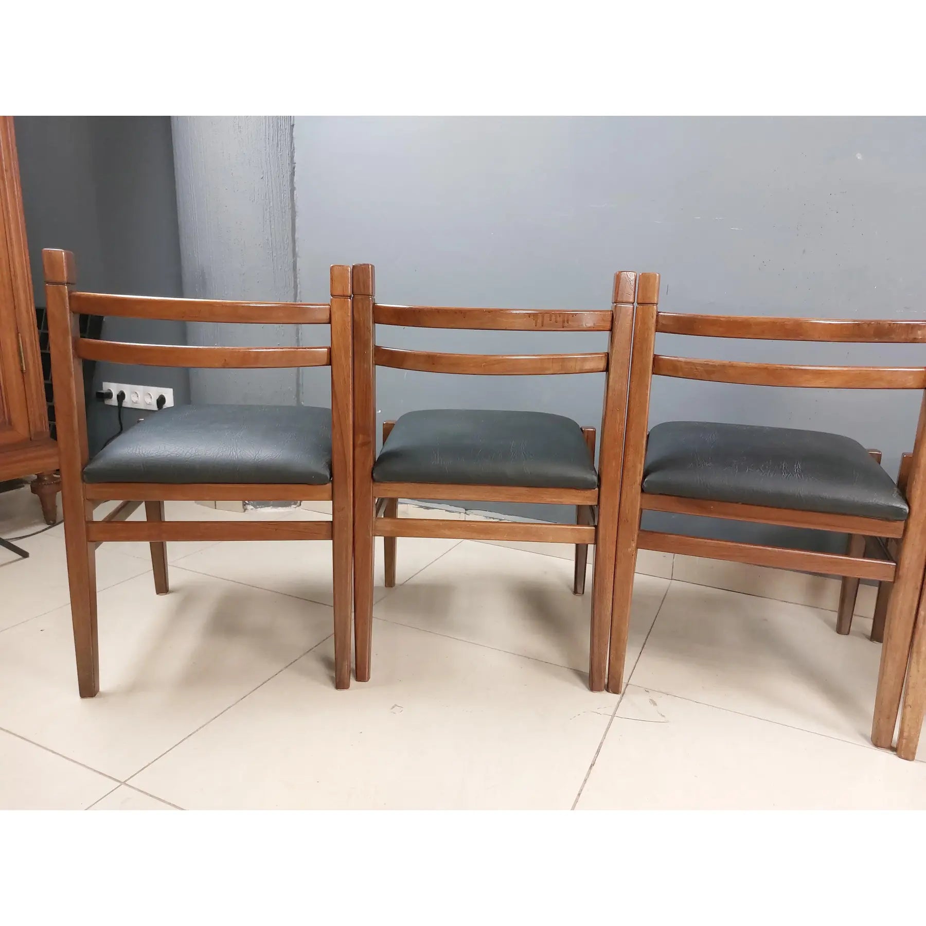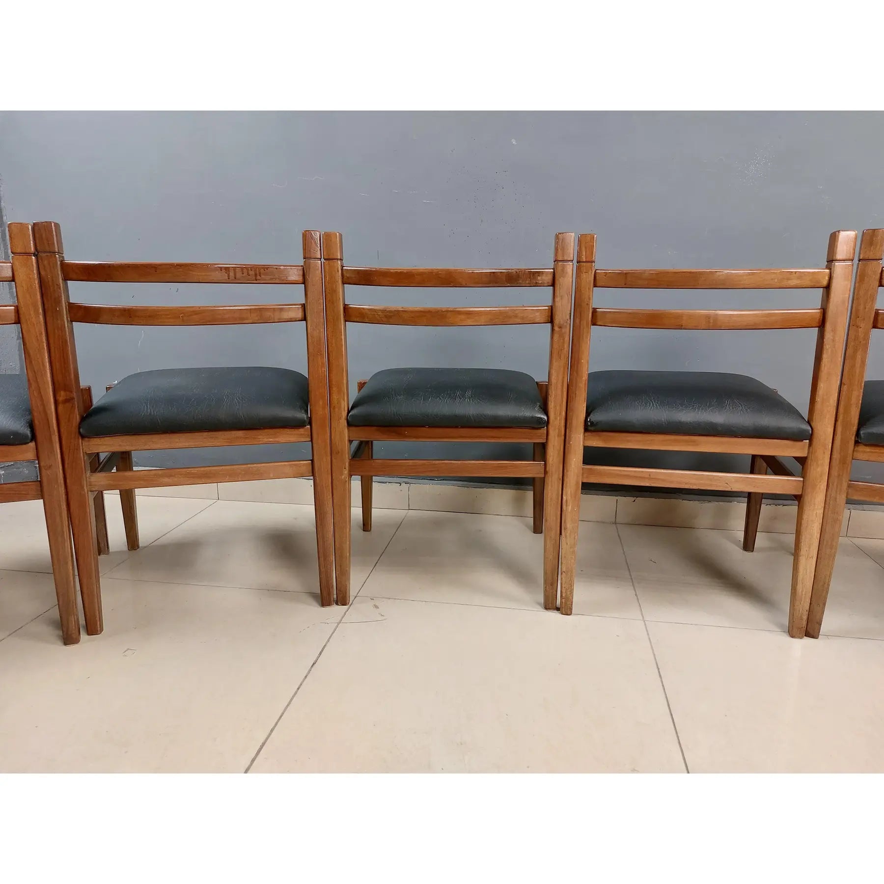 Set of 6 Mid Century Modern Dining Chairs with vintage faux leather upholstery. Gorgeous solid wood frame with original black faux leather seat. Chic Scandinavian design. A great designer set of dining or side chairs ready for everyday use. Simple, clean lines and compact design make these chairs perfect for the home or office.