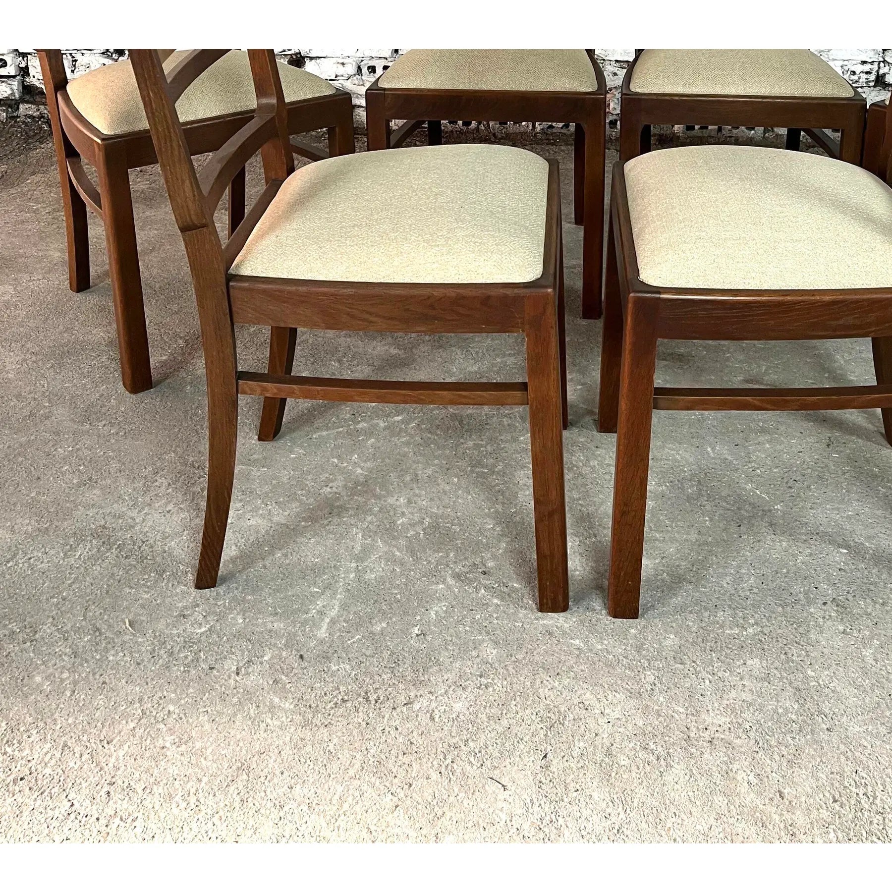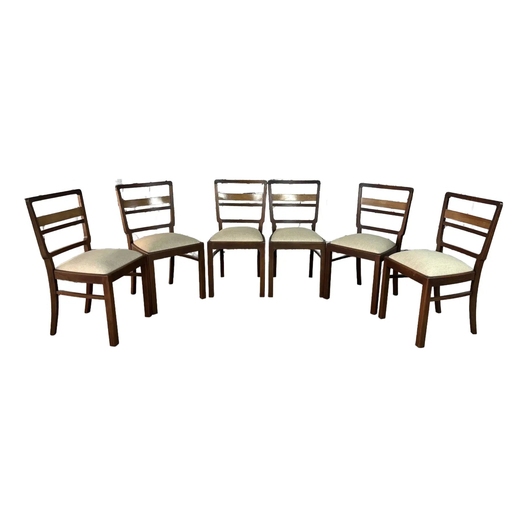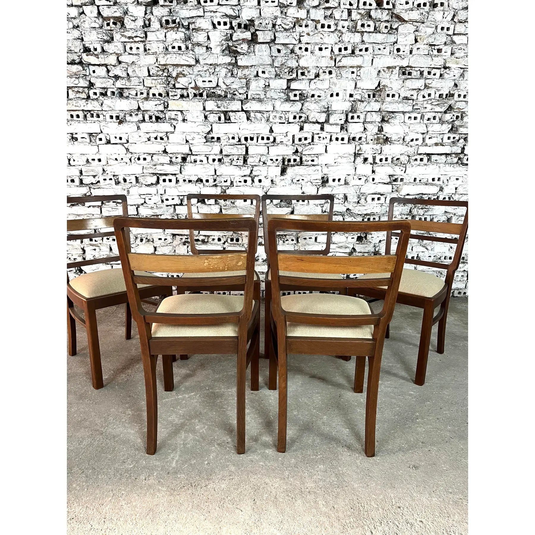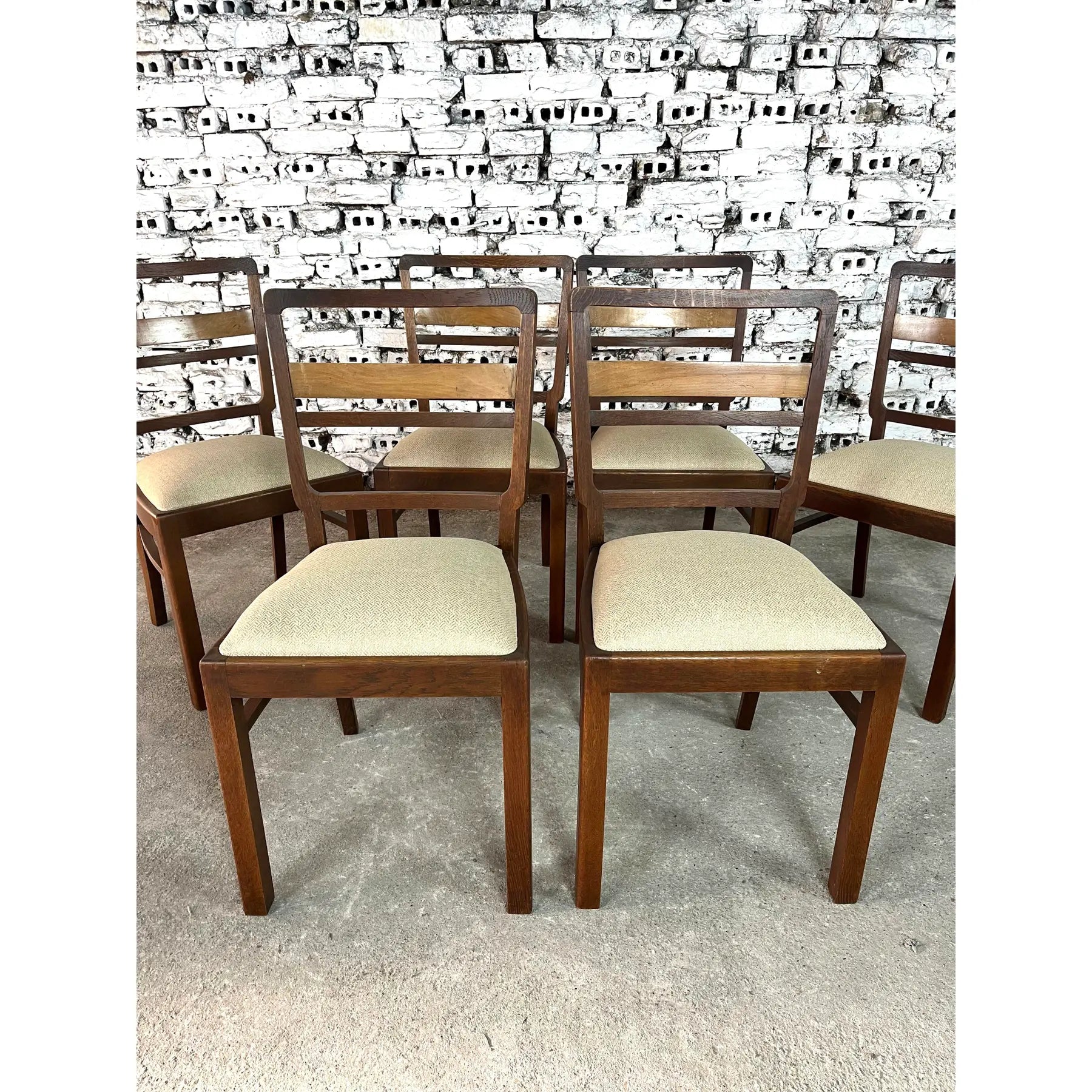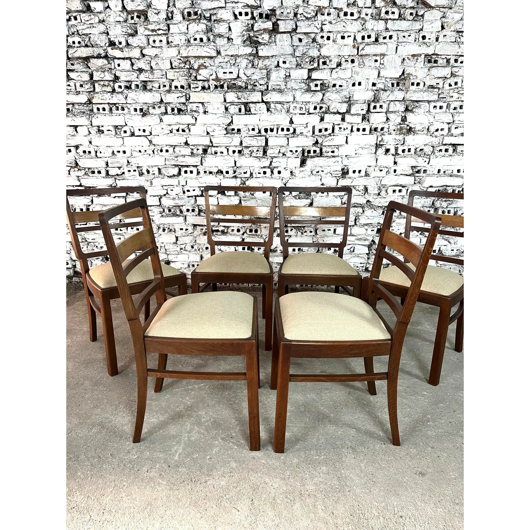 Set of 6 Scandinavian Mid-Century Modern dining chairs with newly upholstered seats in beige fabric. Each chair has a little pitched back with three ladders across for great support and comfort.
