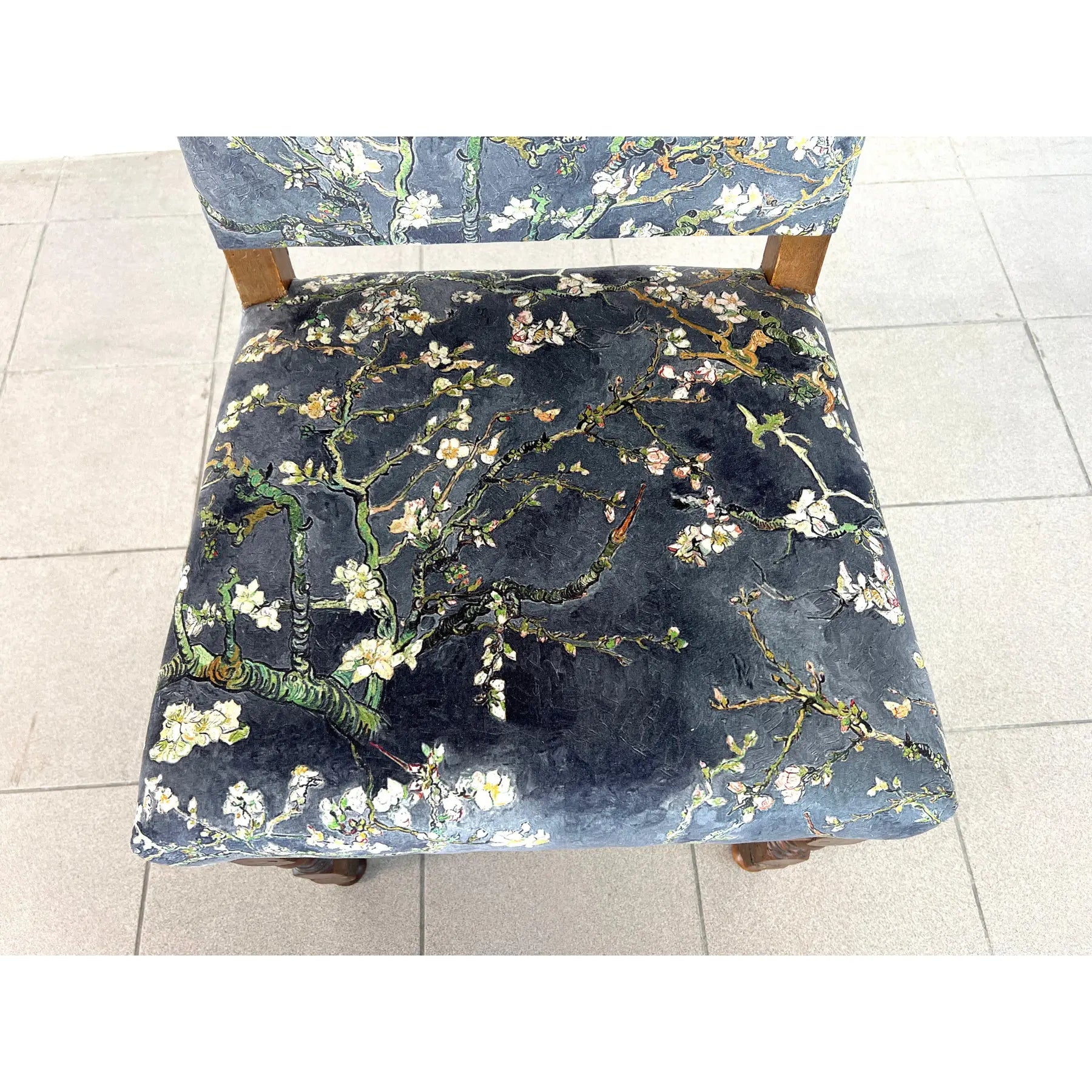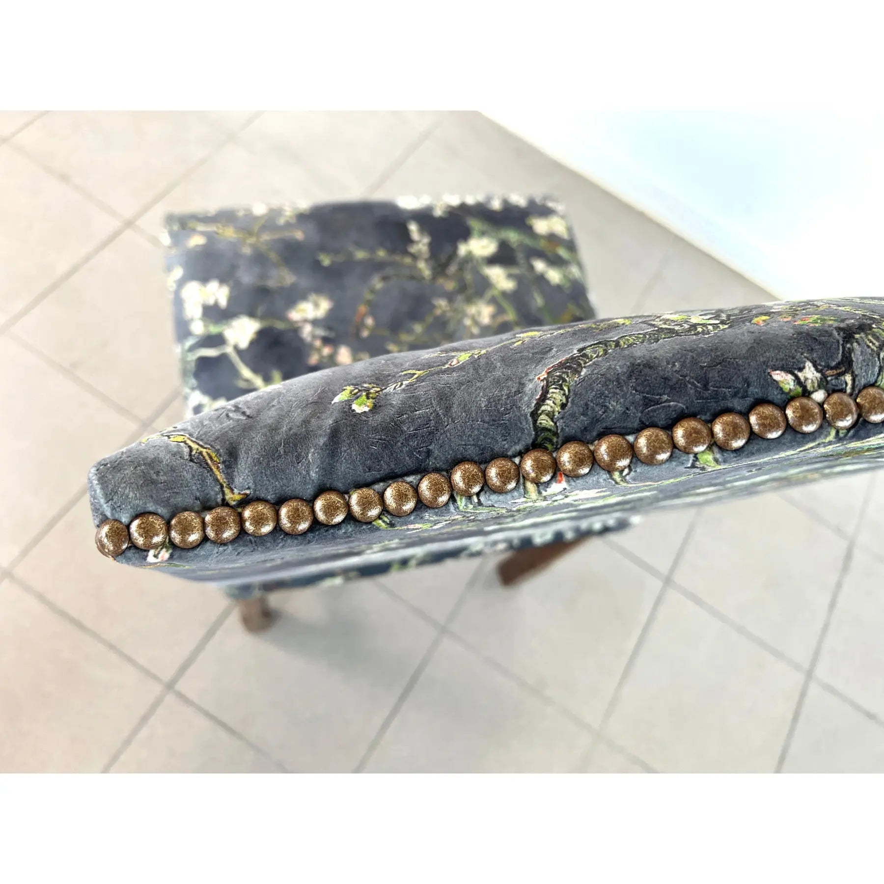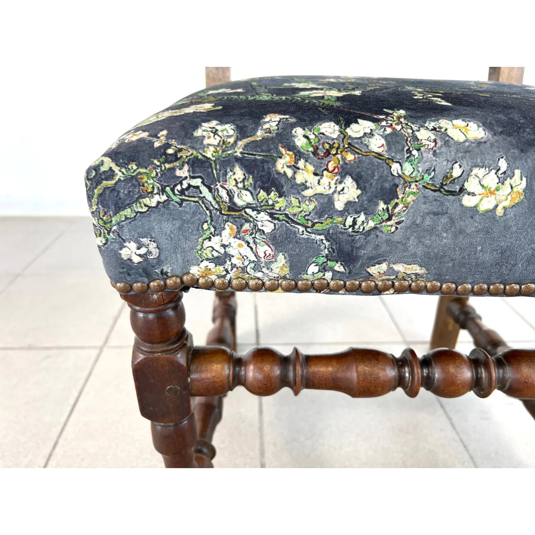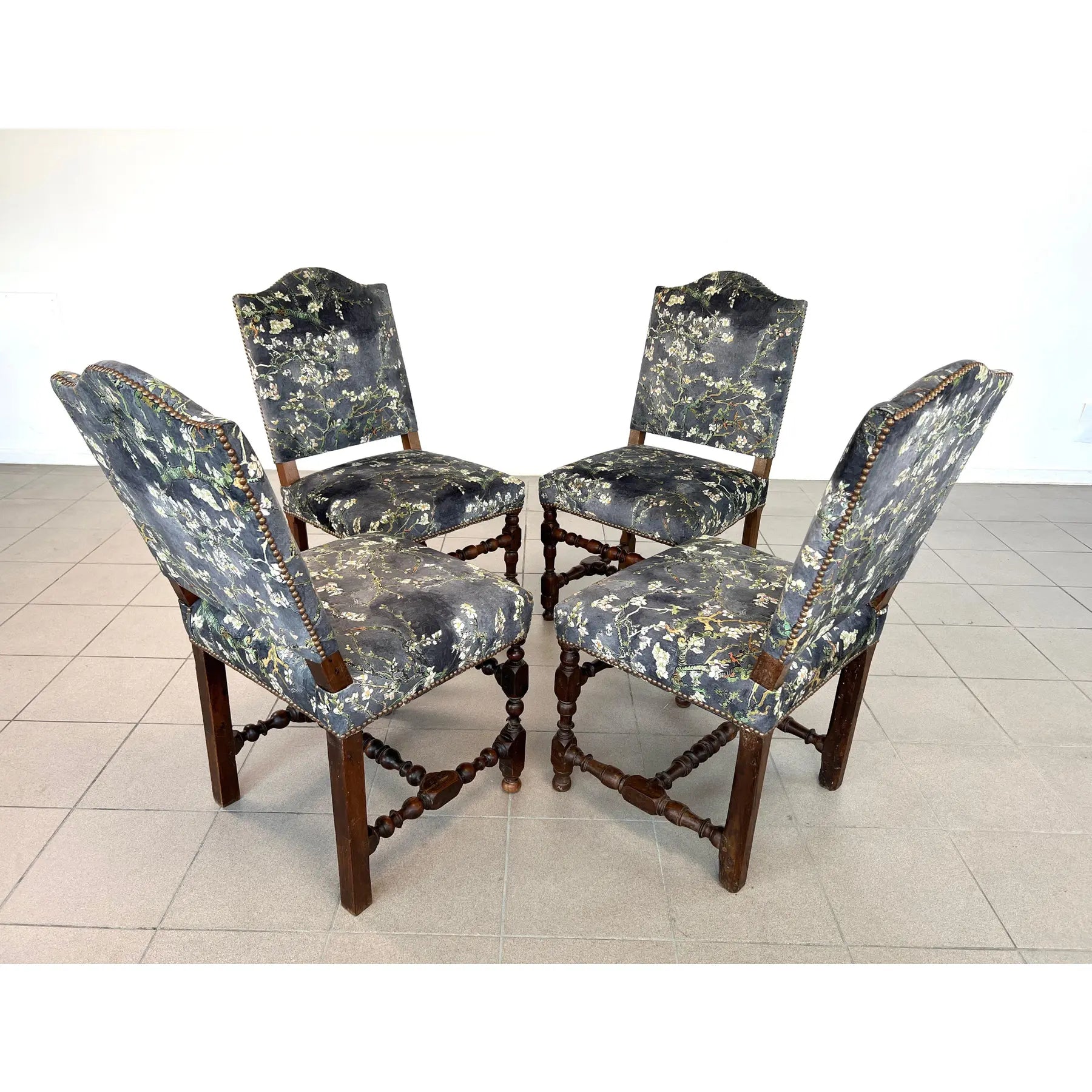 Set of 4 Vintage Louis XIII style dining chairs, upholstered in original Chinoiserie style upholstery with brass nailhead trim. Raised on turned legs with stretchers. One of the chairs is with bigger seat. A wonderful addition to your interior.