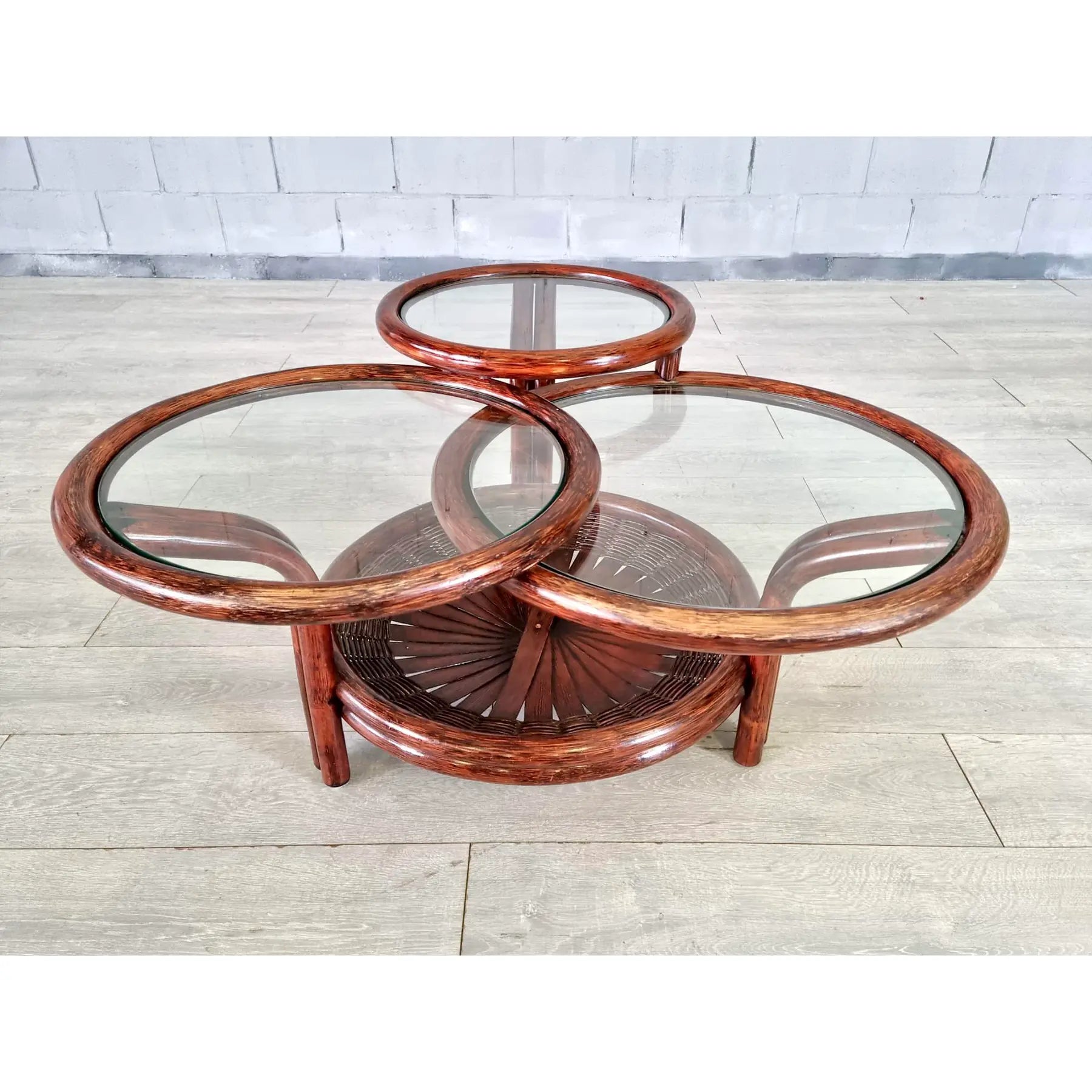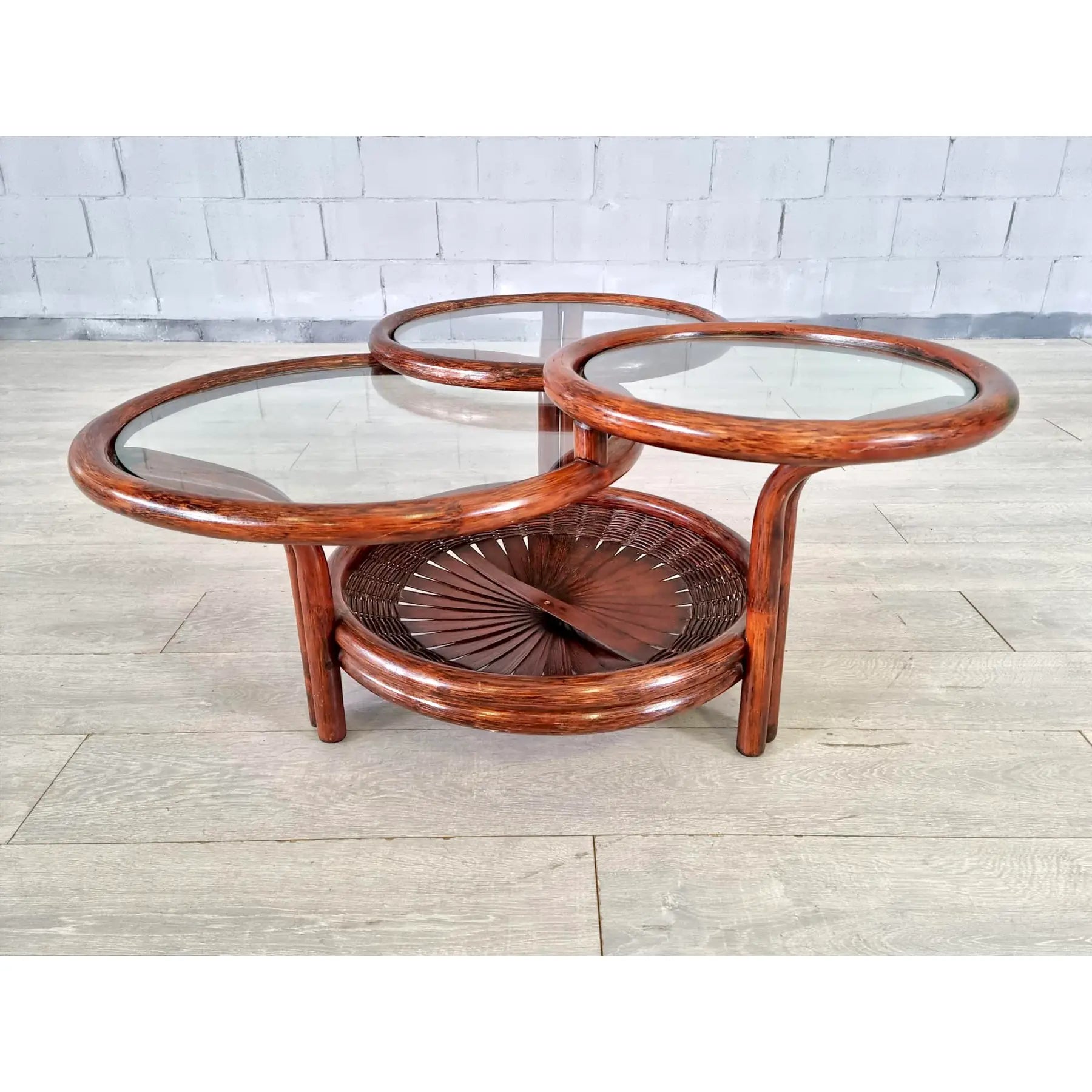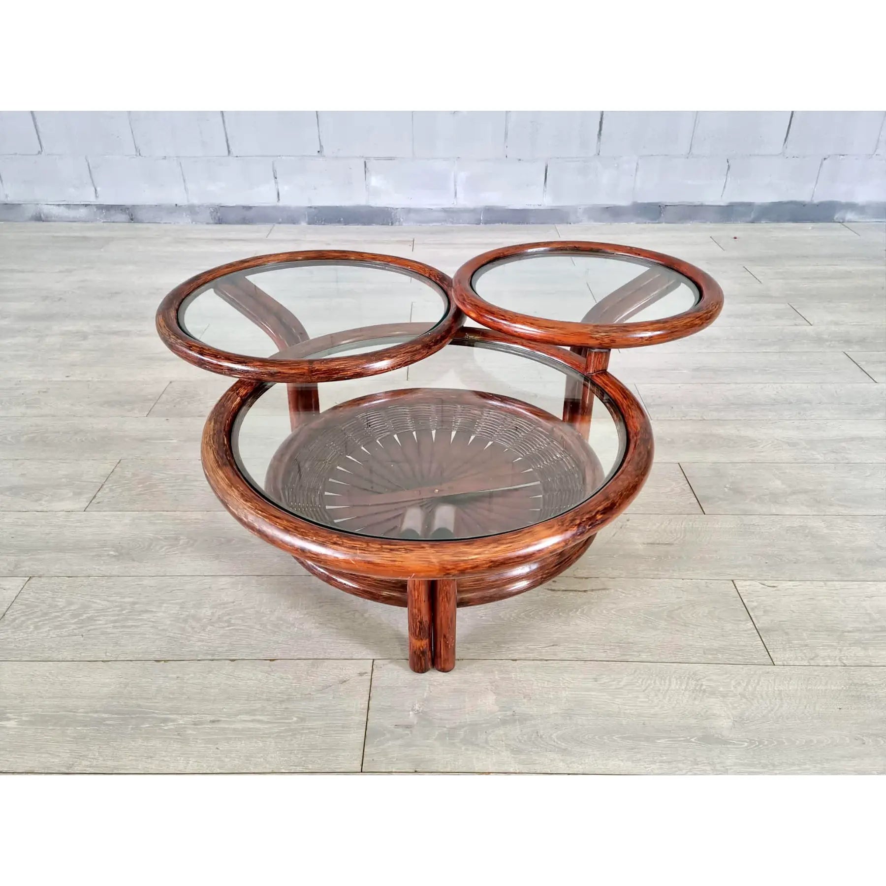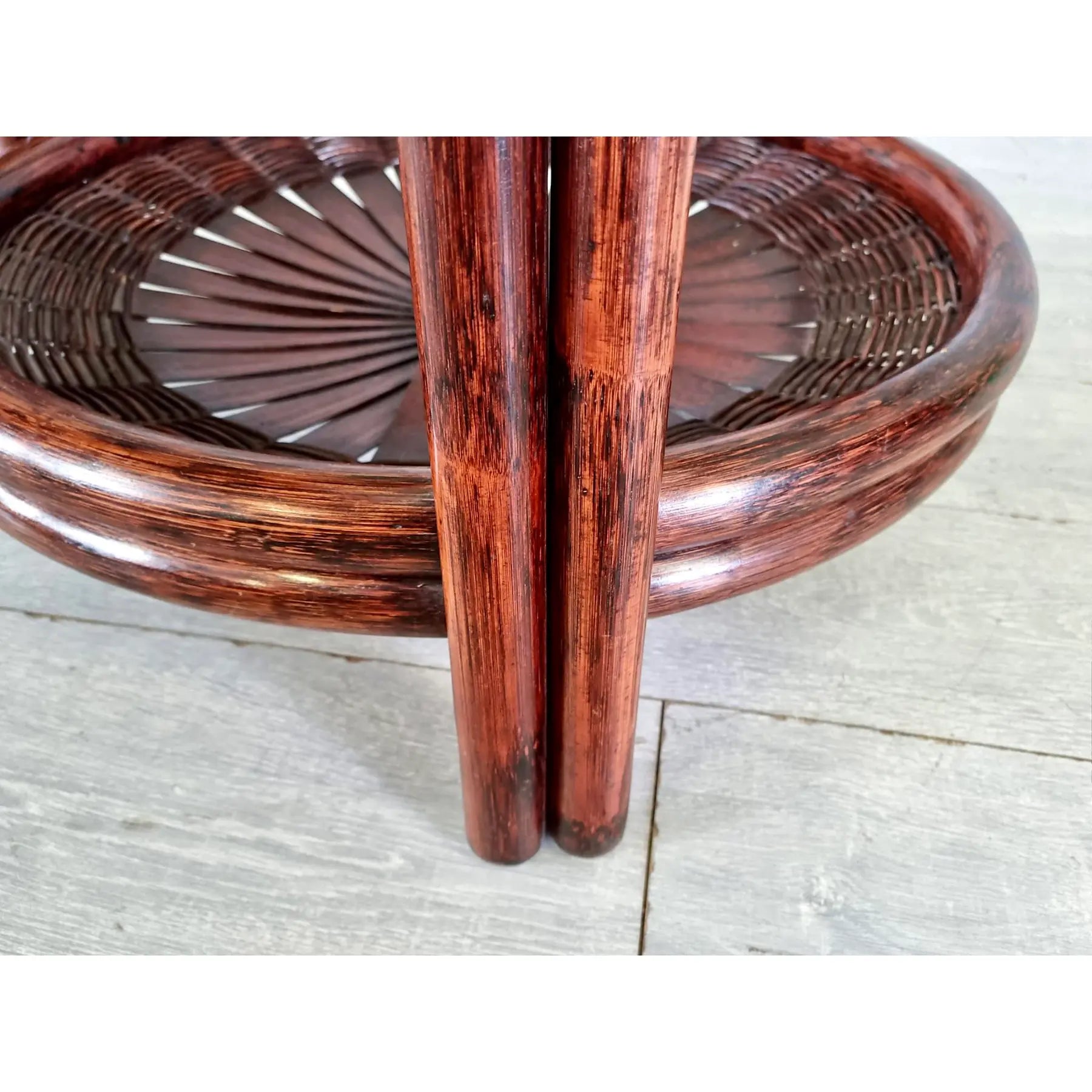 Vintage Mid Century Modern Sculptural Three-Tier Round Coffee or Accent Table With Glass Tops. This beautiful table has an unusual faux bamboo/rattan base with open fan type detail and glass tops. Crafted from faux bamboo cane with natural gloss finish this lovely accent table is standing on 3 sturdy legs. Bamboo, cane and rattan furniture is ideal for a conservatory, boho lounge or patio. A great addition to your interior.