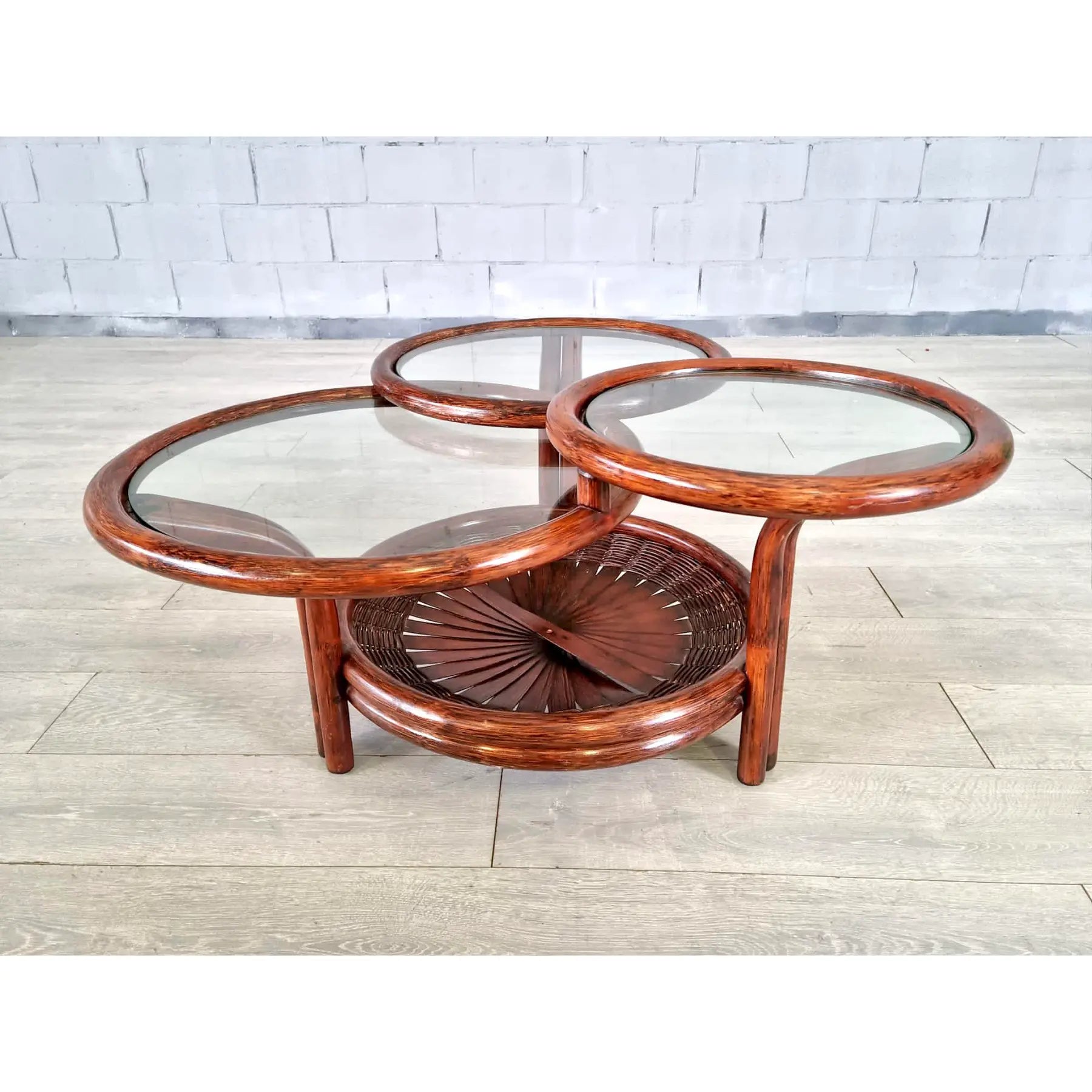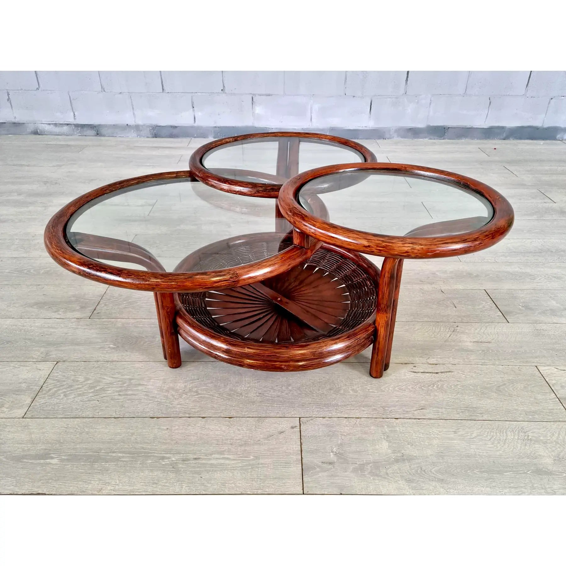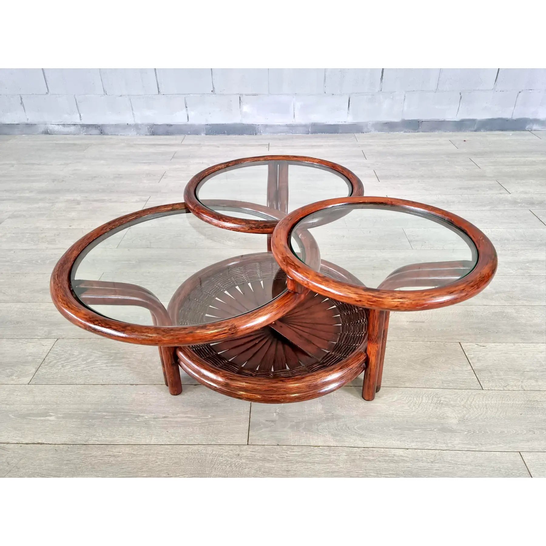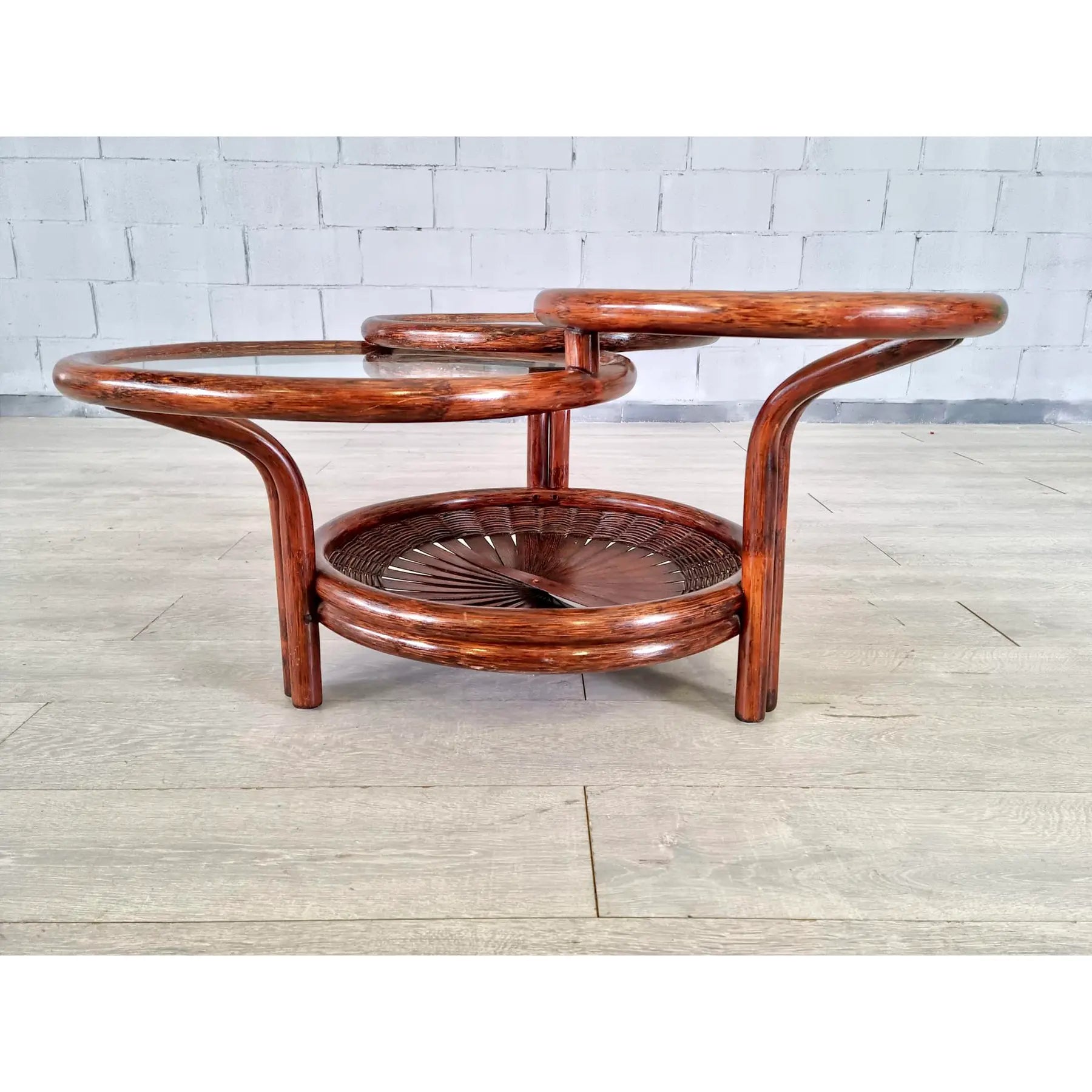 Vintage Mid Century Modern Sculptural Three-Tier Round Coffee or Accent Table With Glass Tops. This beautiful table has an unusual faux bamboo/rattan base with open fan type detail and glass tops. Crafted from faux bamboo cane with natural gloss finish this lovely accent table is standing on 3 sturdy legs. Bamboo, cane and rattan furniture is ideal for a conservatory, boho lounge or patio. A great addition to your interior.
